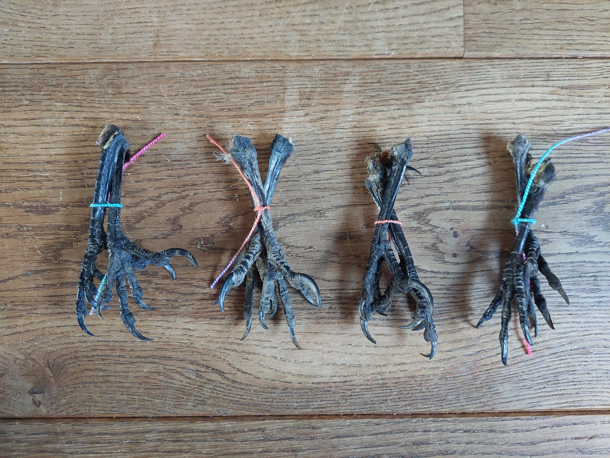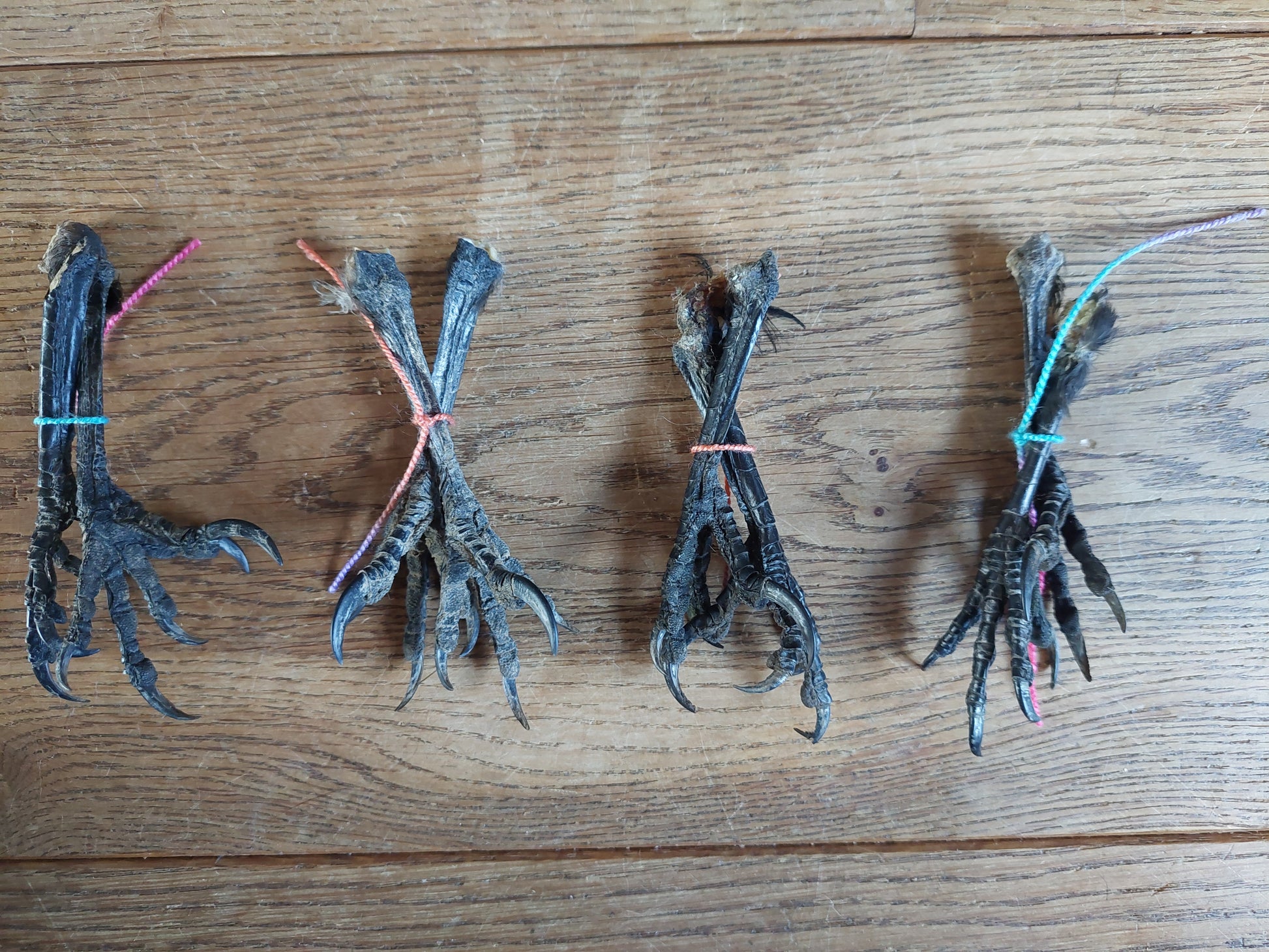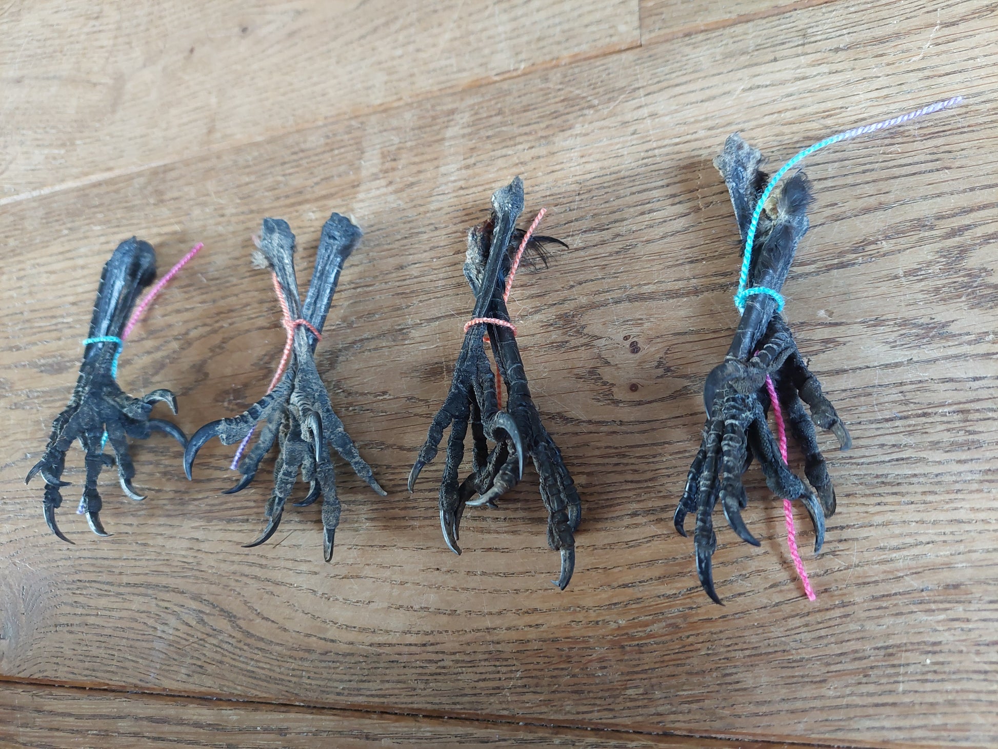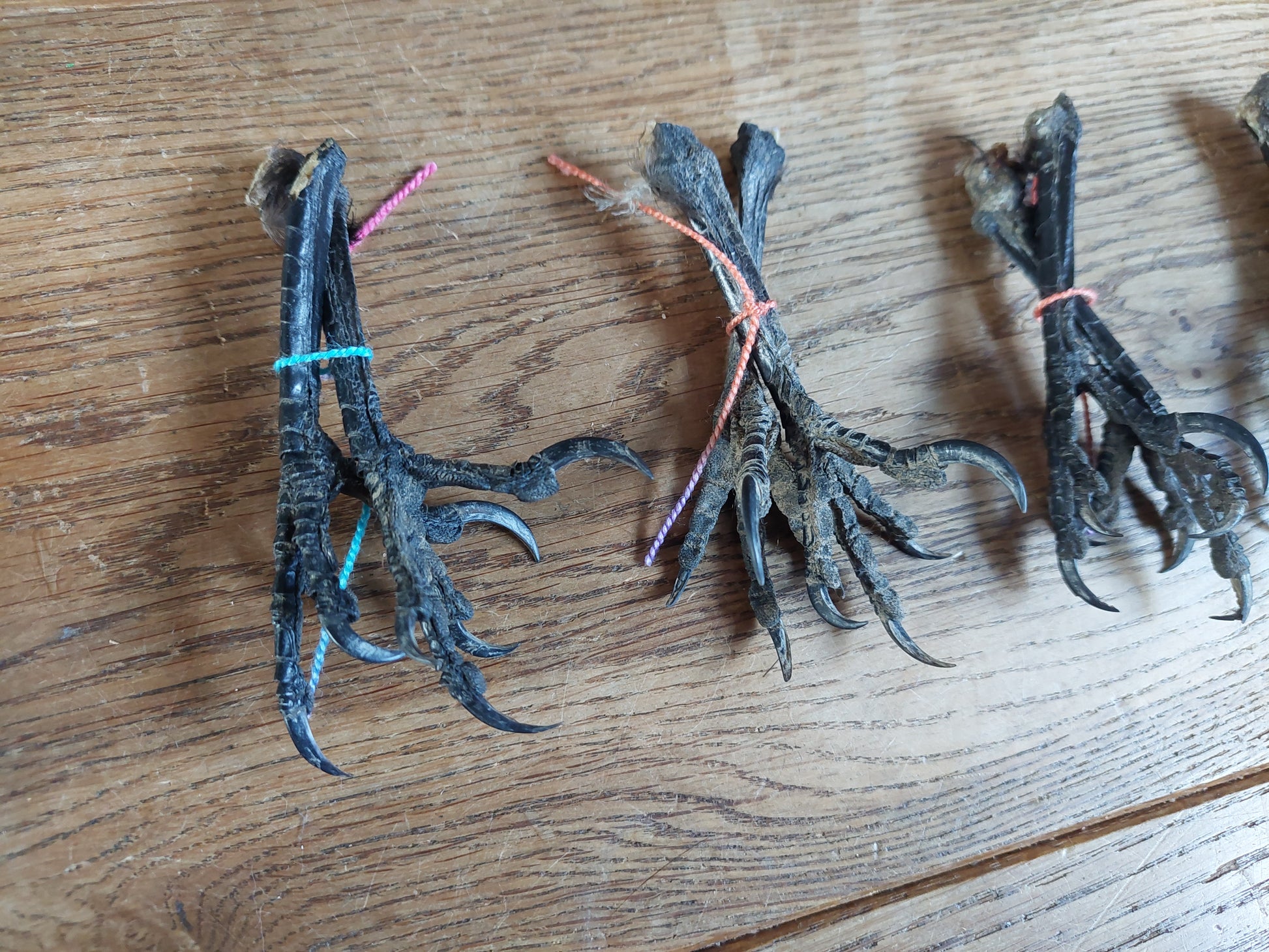 Claws from dutch black crows, dried and prepared in 'claw'-shape. These preparations are from slightly less quality than the other sets of crow claws elsewhere in our shop, therefore they are labelled and prized as B-quality. They might for example be cut off a little shorter than usual or have damage to a toe or nail.