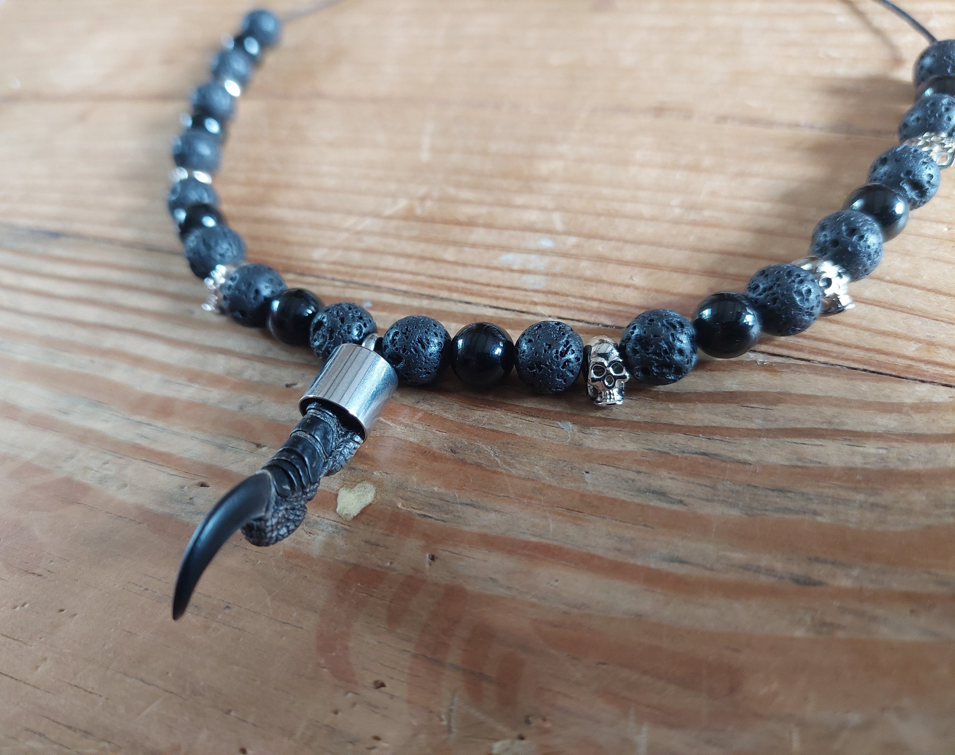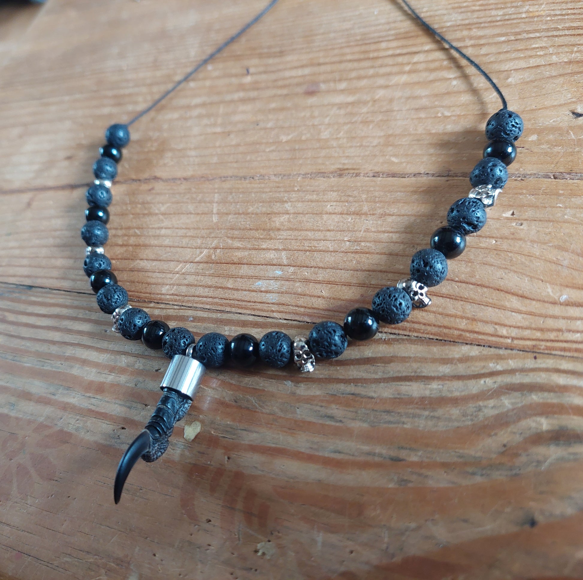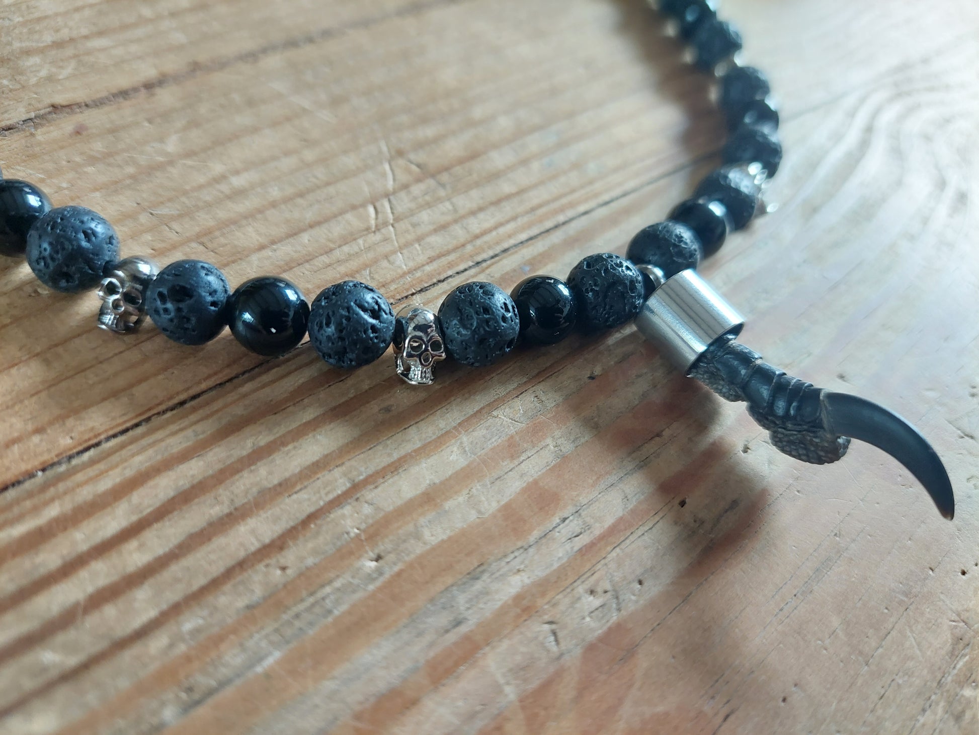 The crow nail has been combined with two types of natural black beads; rough lava stone and smoothly polished obsidian. In between the beads also some silver colored metal skull beads have been added.