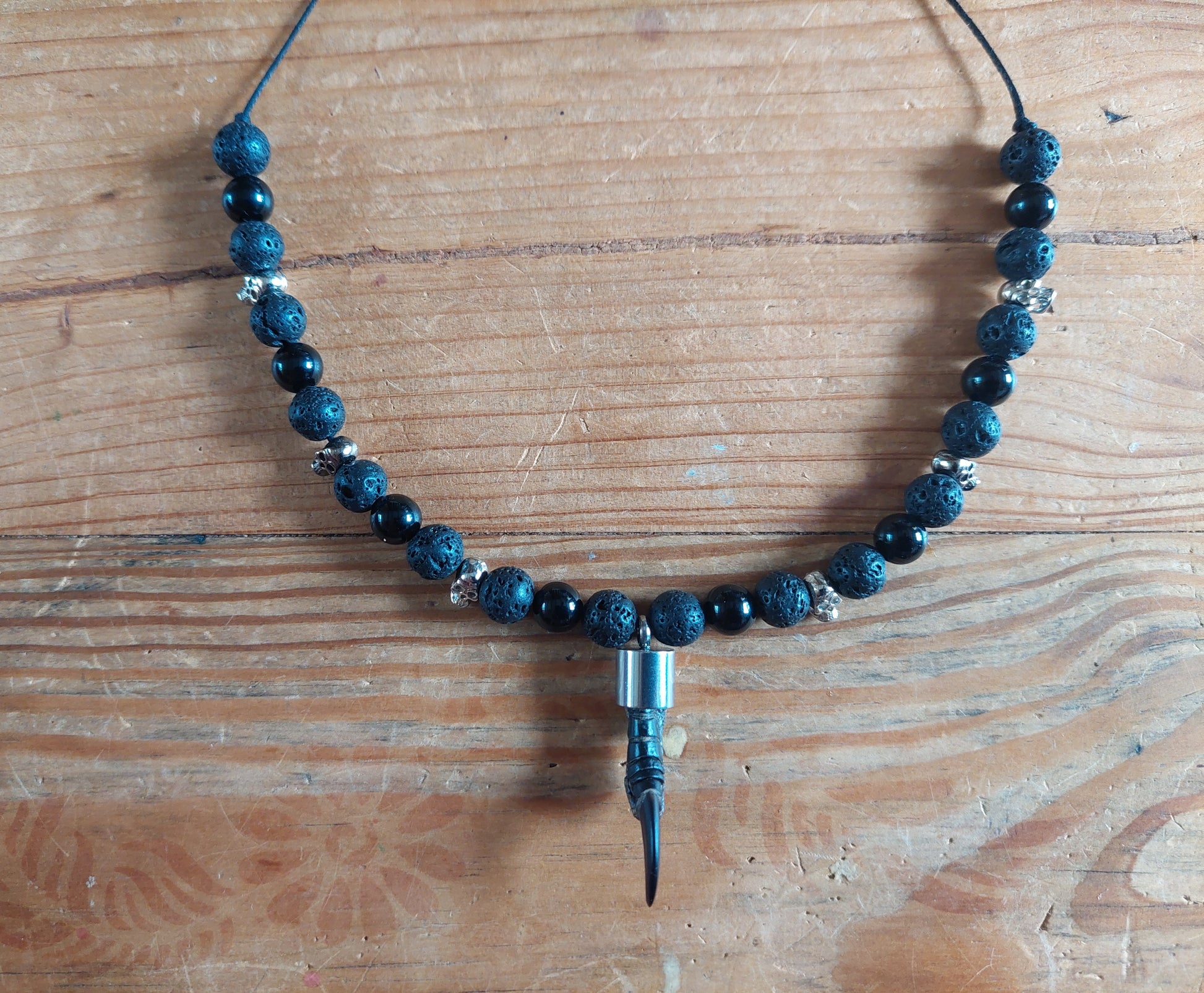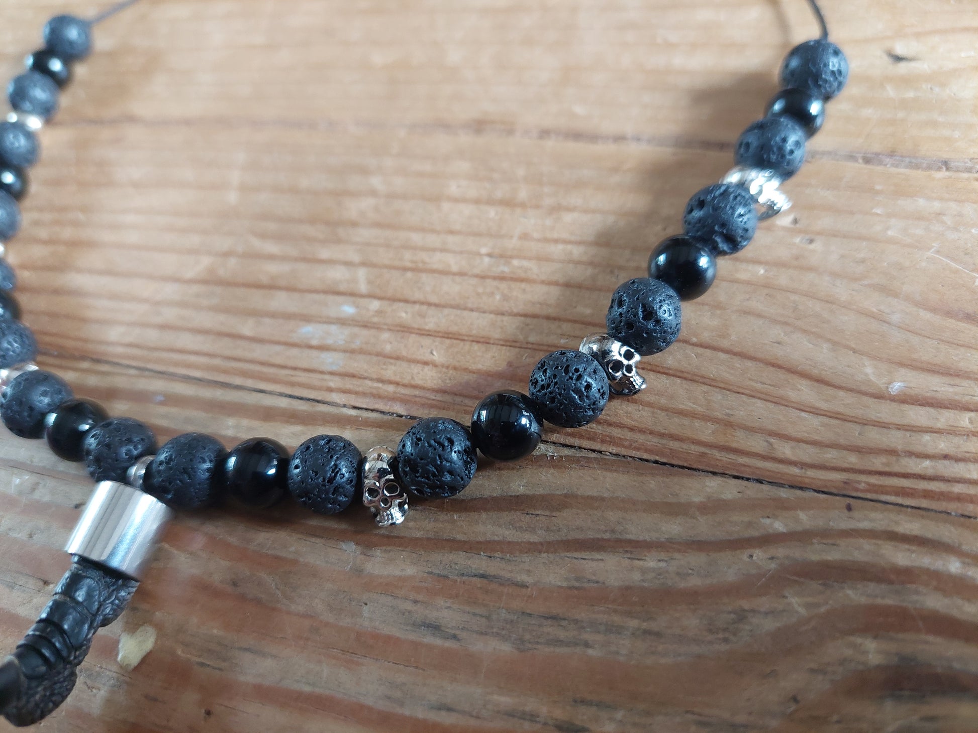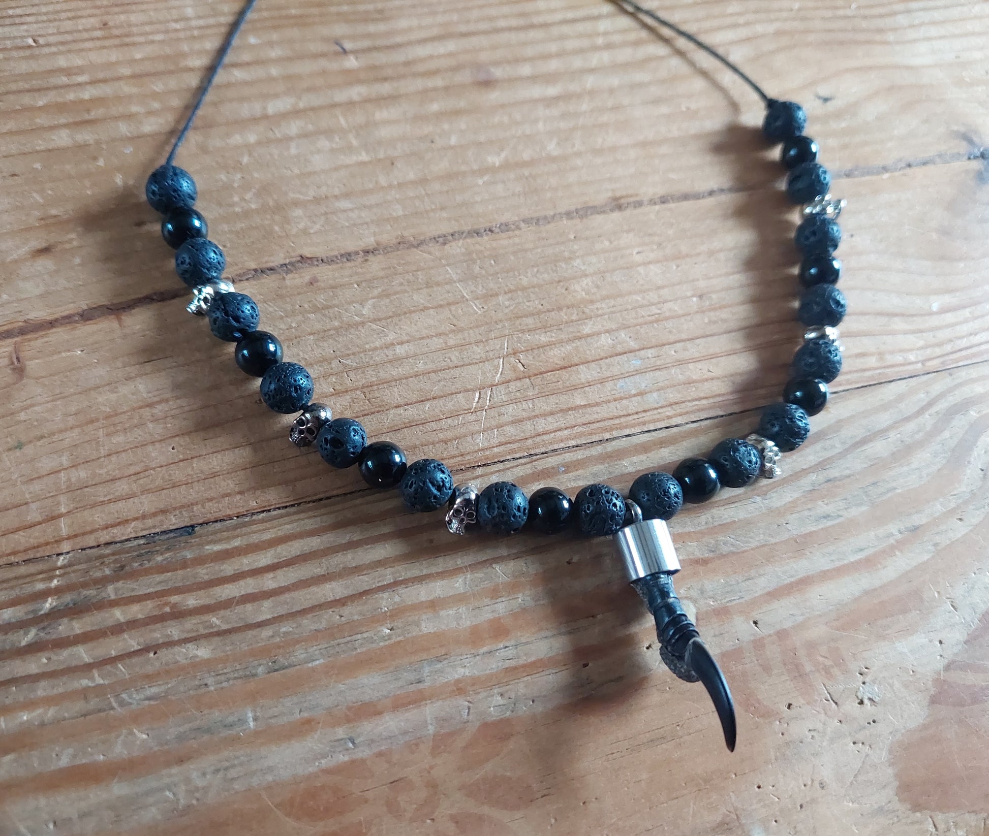 The crow nail has been combined with two types of natural black beads; rough lava stone and smoothly polished obsidian. In between the beads also some silver colored metal skull beads have been added.