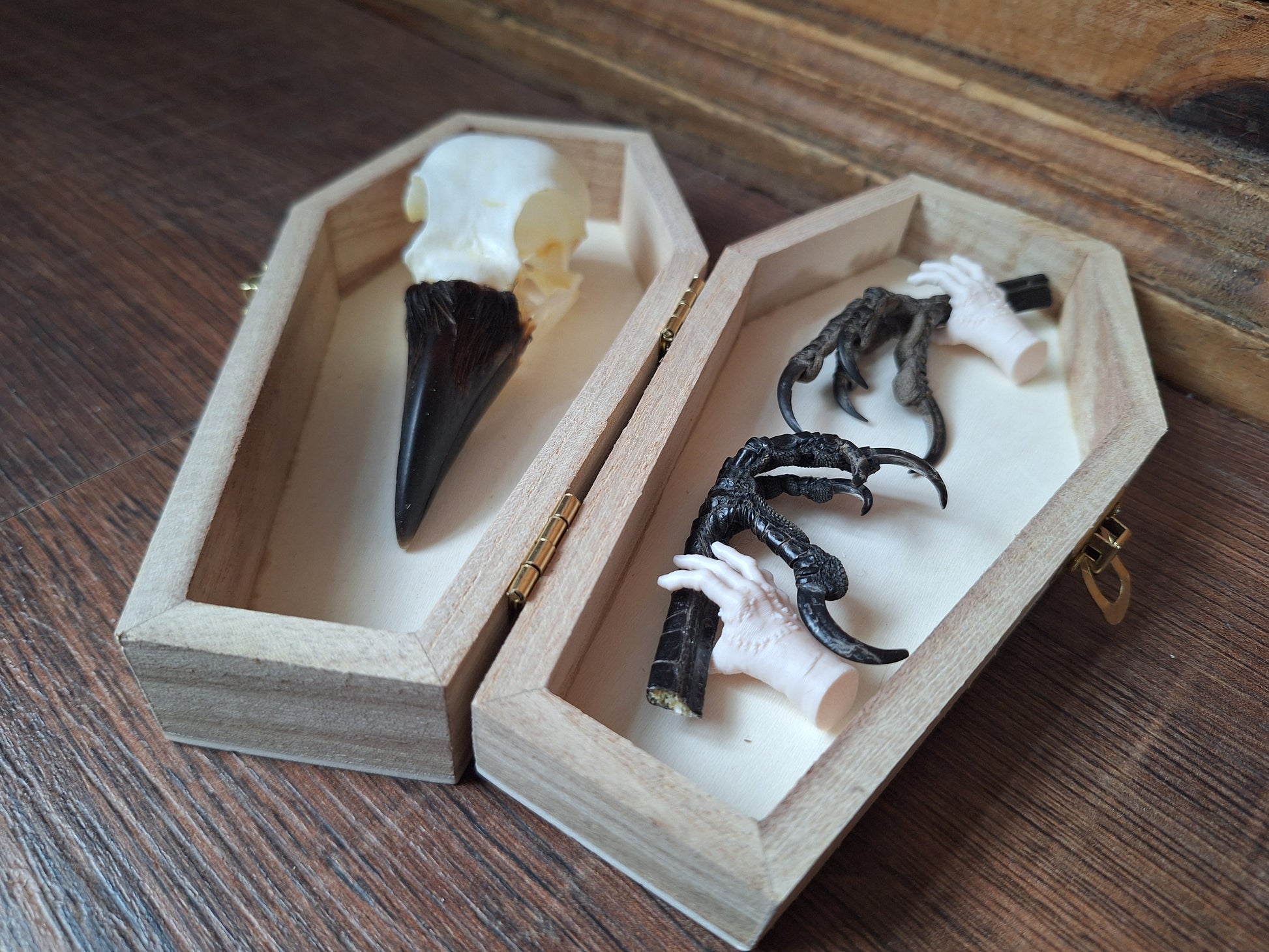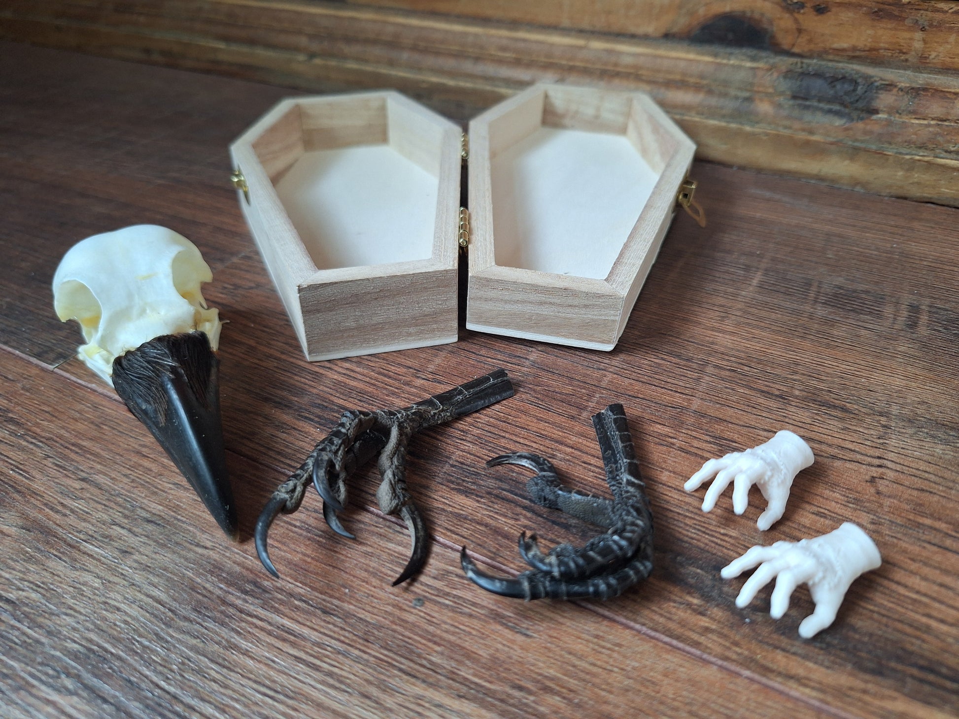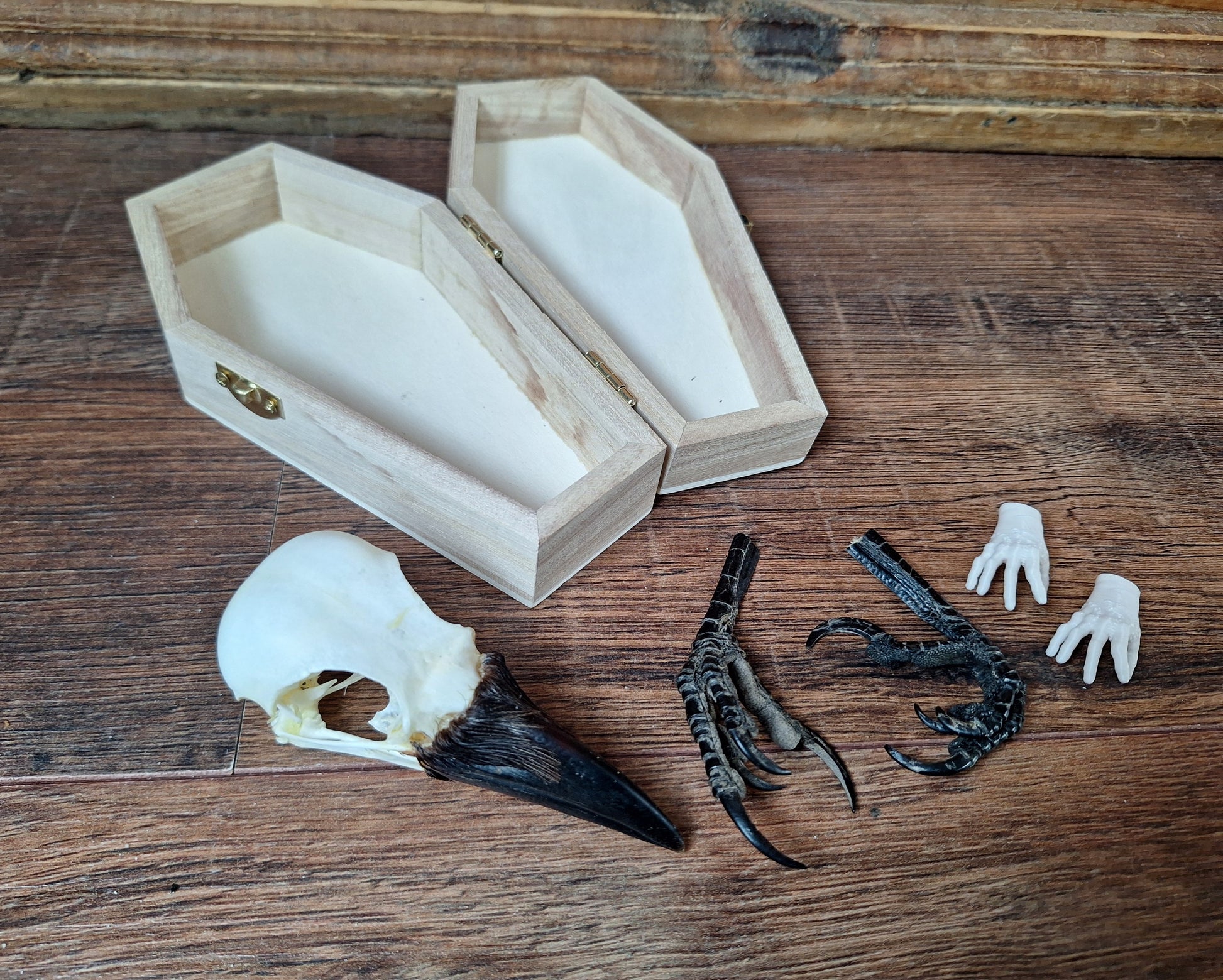 Crow skull and claws set in coffin