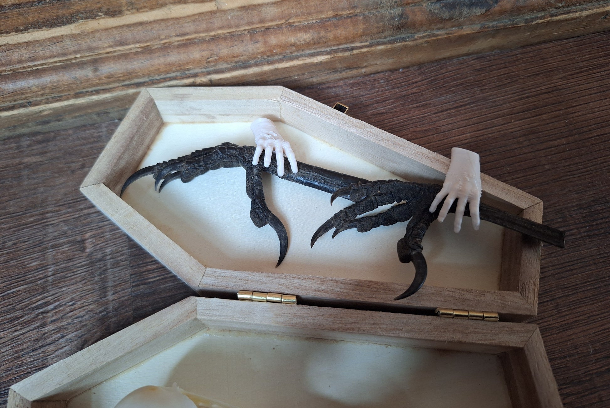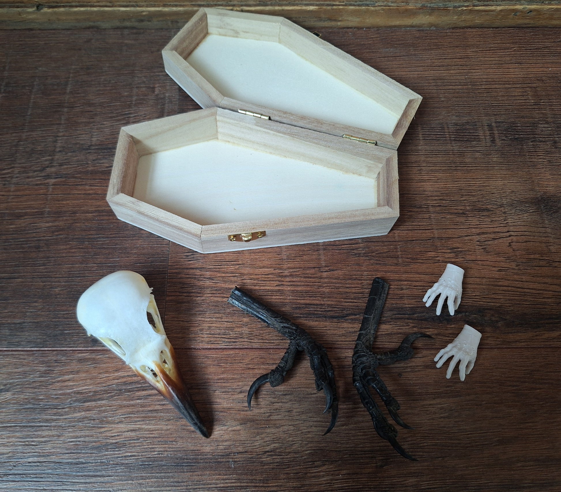 Crow skull and claws set in coffin