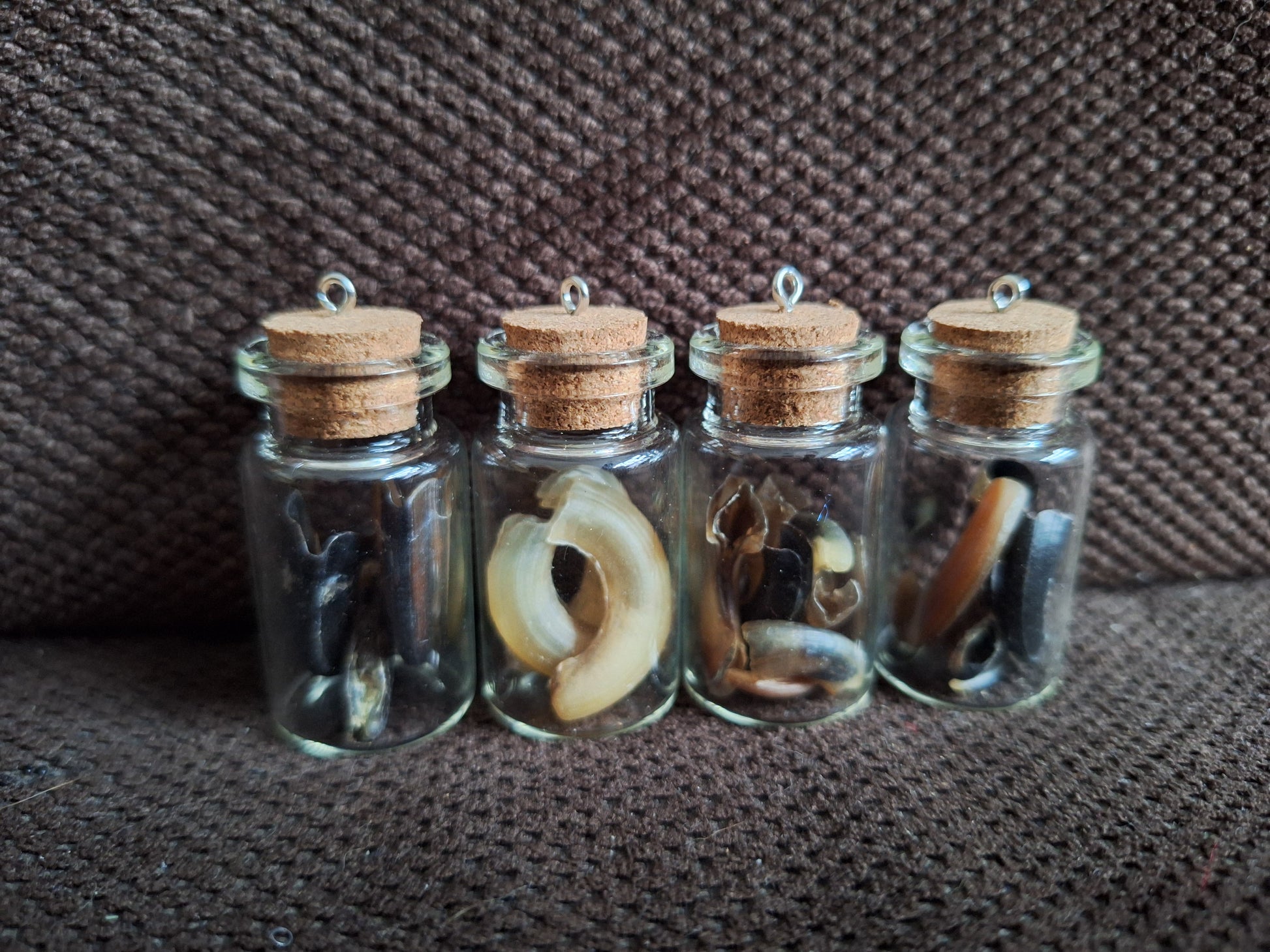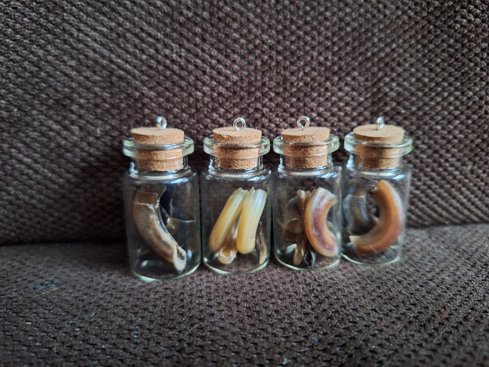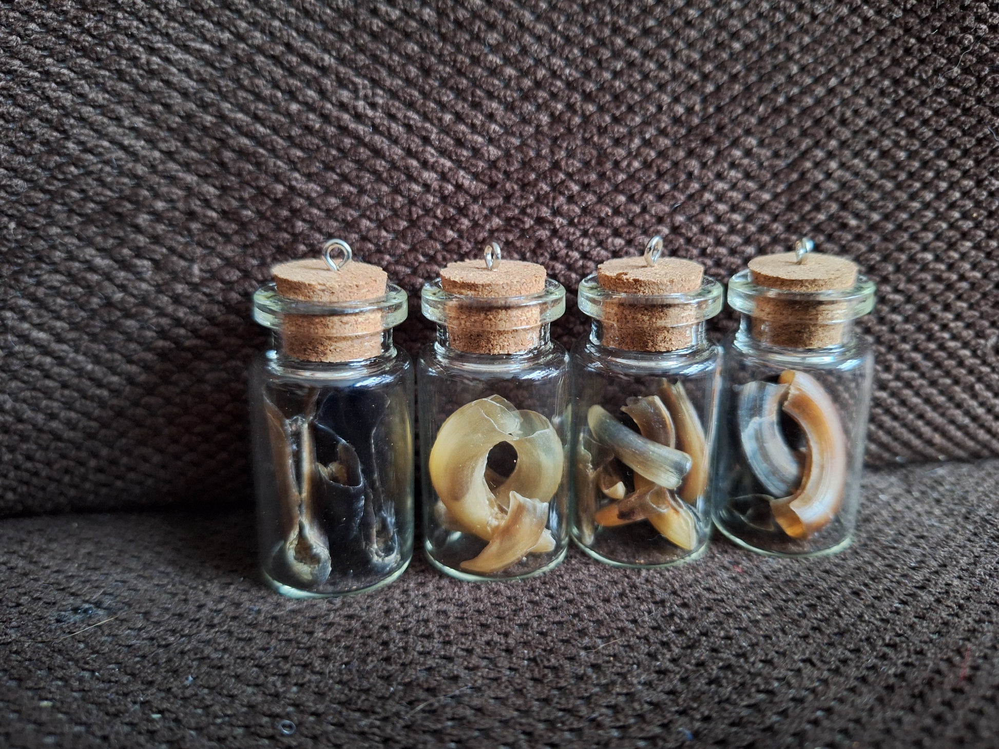 Small glass bottles filled with loose dog nails. A nice item to put on your altar 'as-is' to connect you with the spirit of Dog or to use further in your own personal crafting purposes (bottles can still be opened to take out the nails for individual usage)