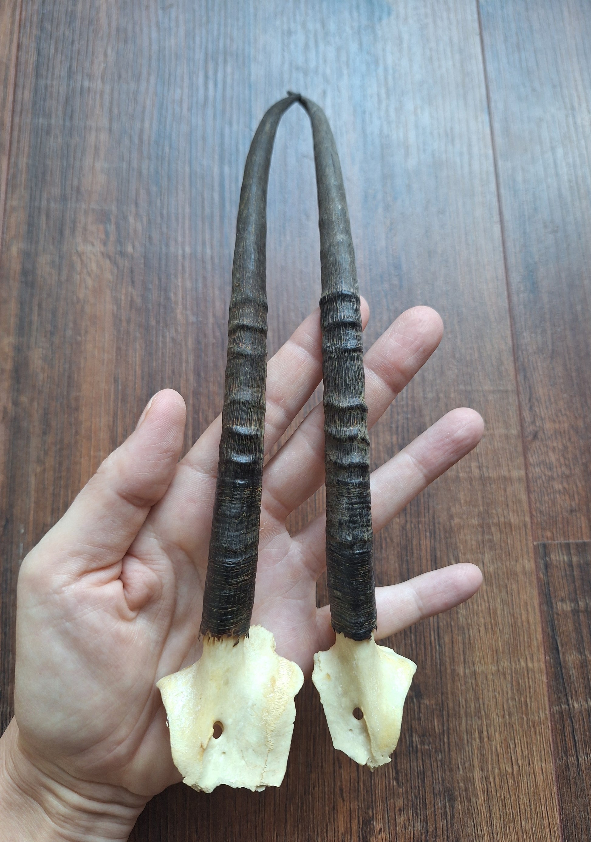 Nice set of horns from a dorcas gazelle. As can be seen on the pictures, these horns have their bone-core still inside and include a small piece of the skullcap. Great for all kinds of ritual, crafting or decorational purposes.