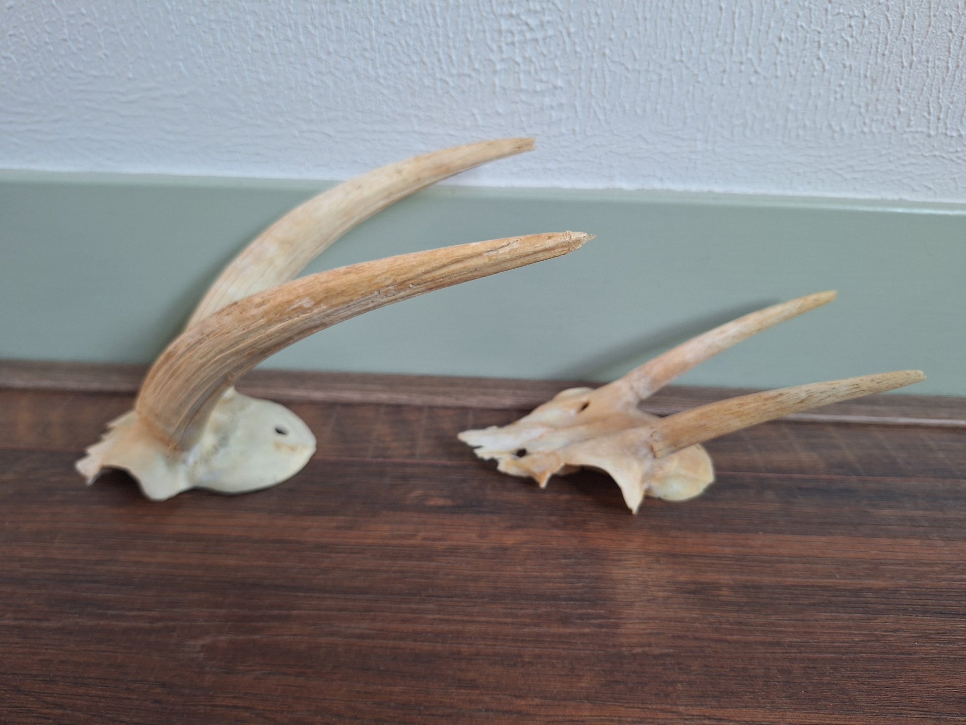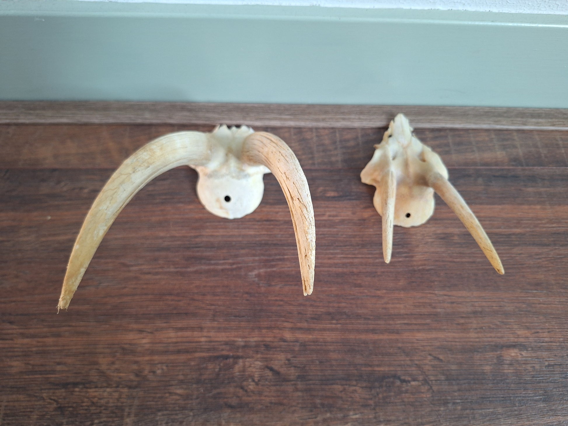 #2; the smaller one on the right of the overview picture. The piece of skull cap measured alone is approximately 11 centimeters long, The horns approximately 10 centimeters.