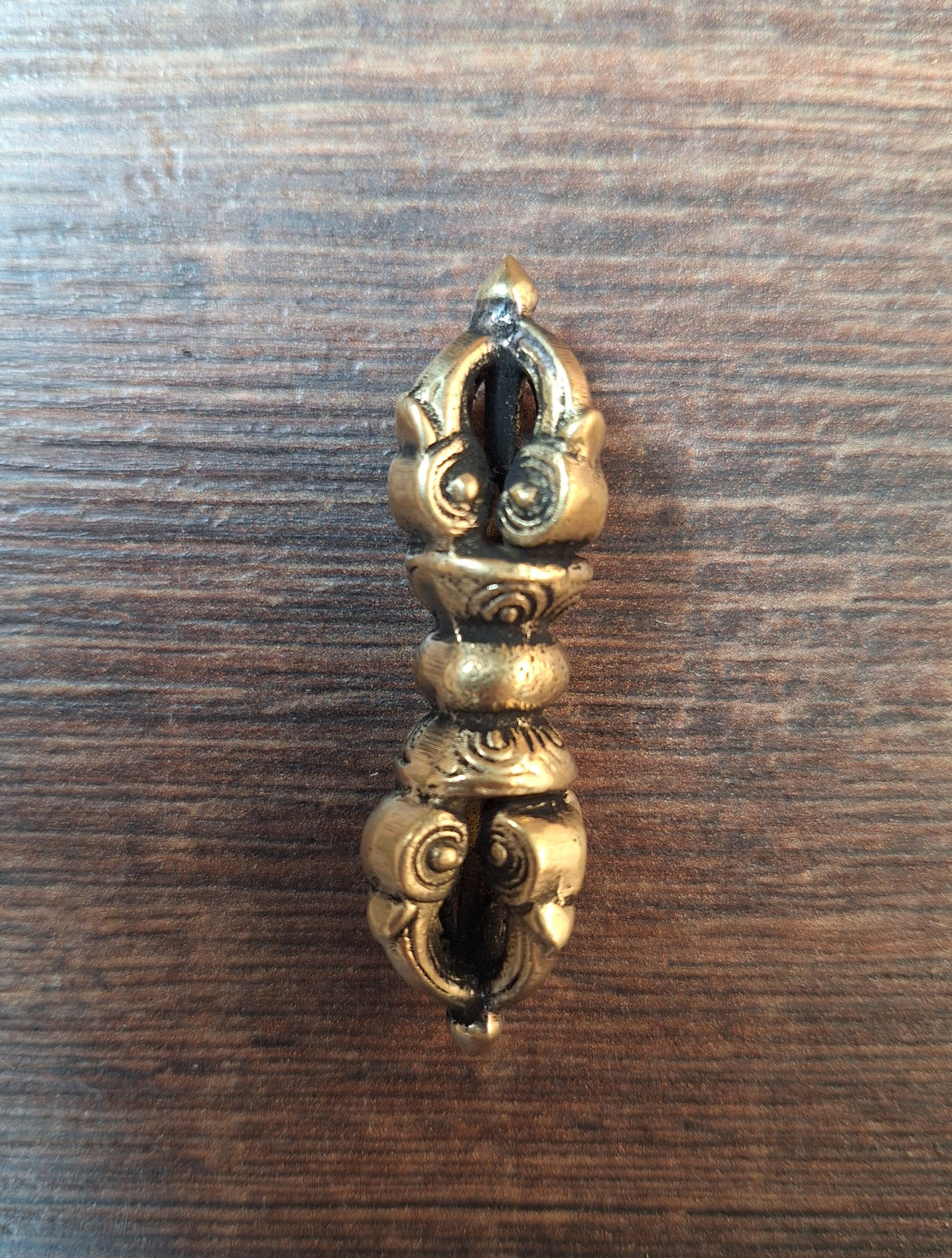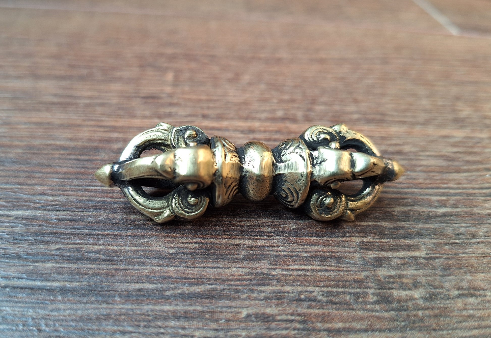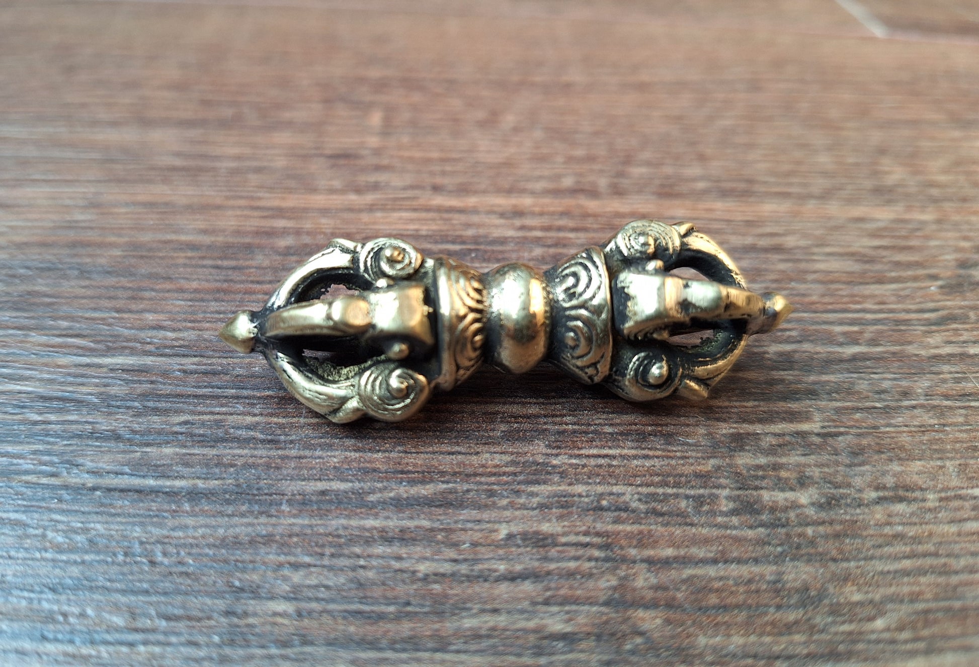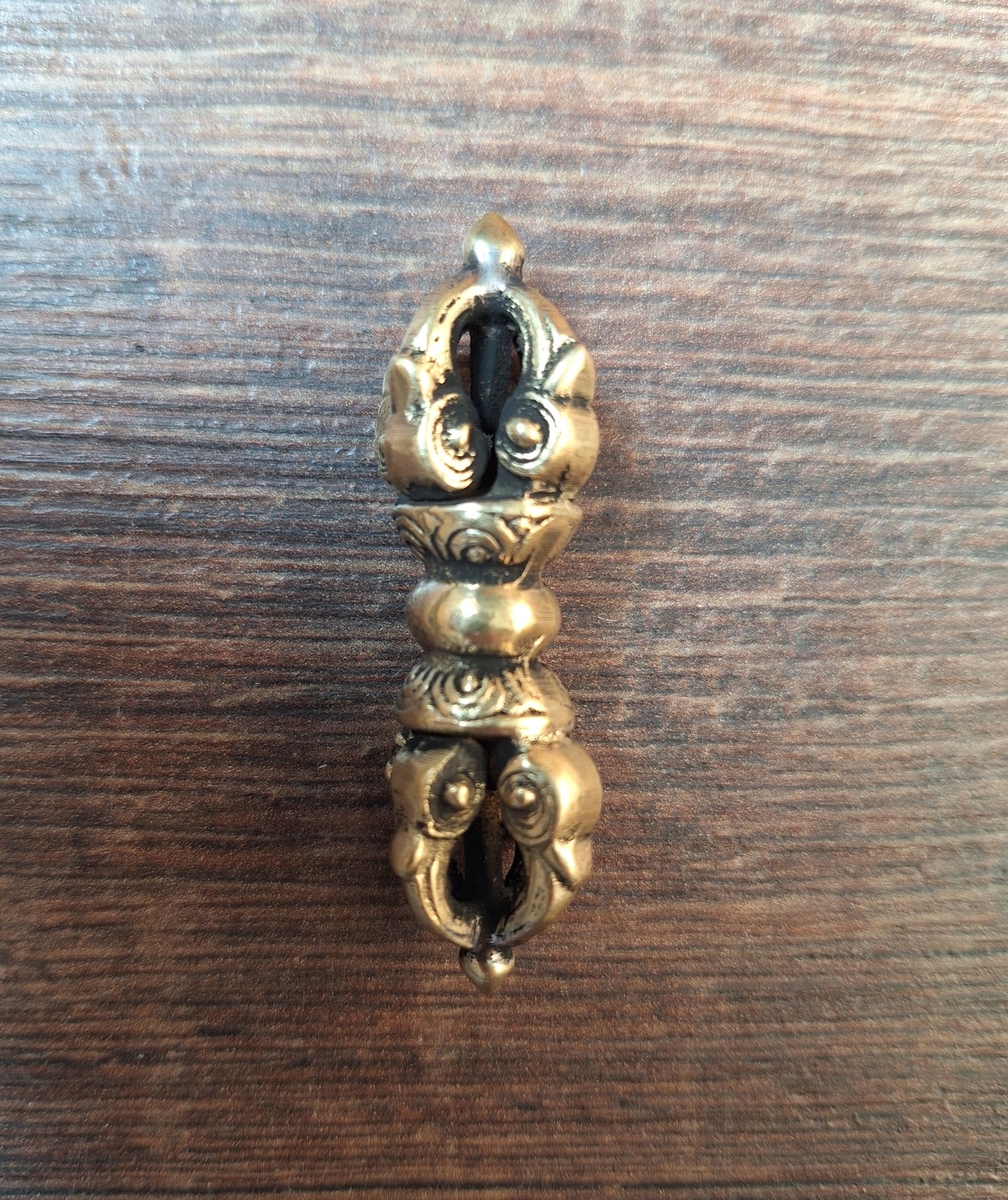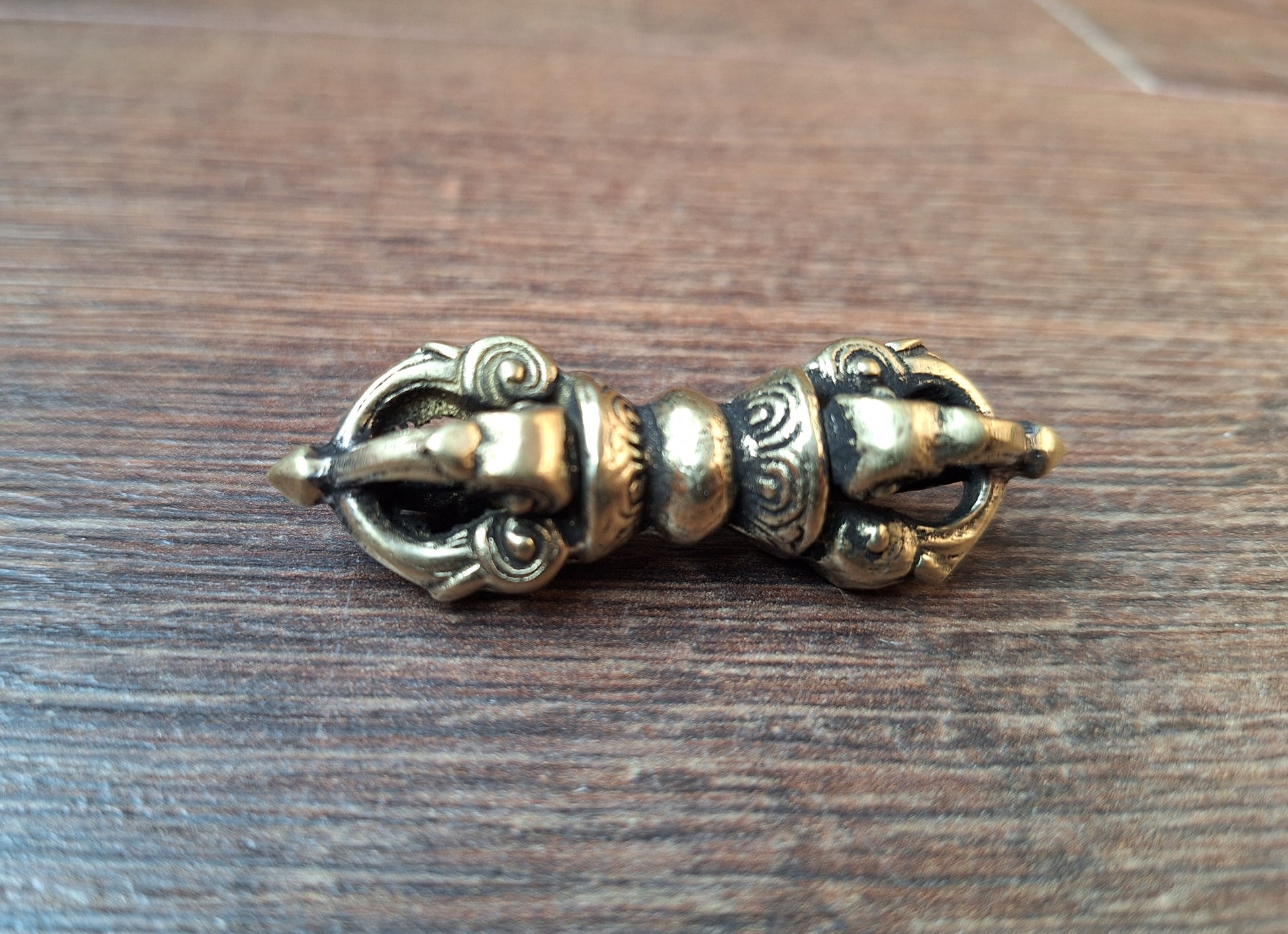 This dorje is made of bronze, comes from Tibet and has a nice small size (6 centimeters, 39 grams), making it a very nice one to take with you while travelling. Or even to string on a cord and use it as a personal amulet or attach it to your ritual clothing.