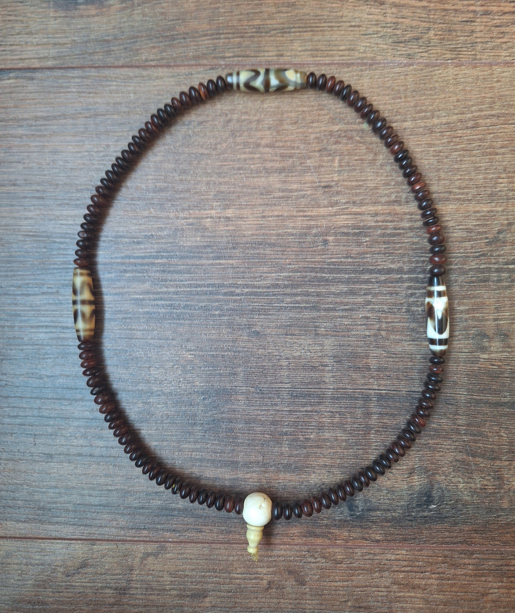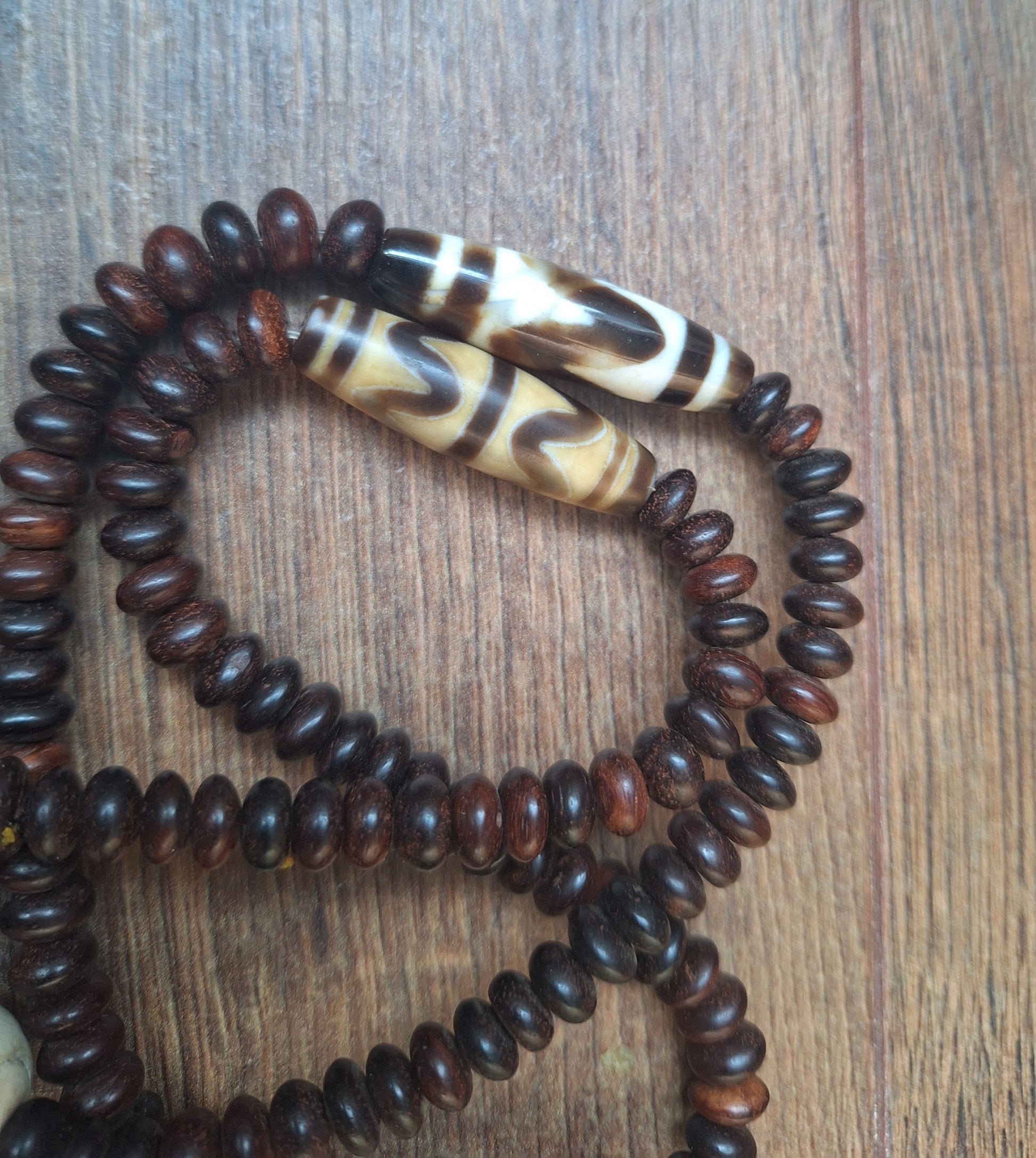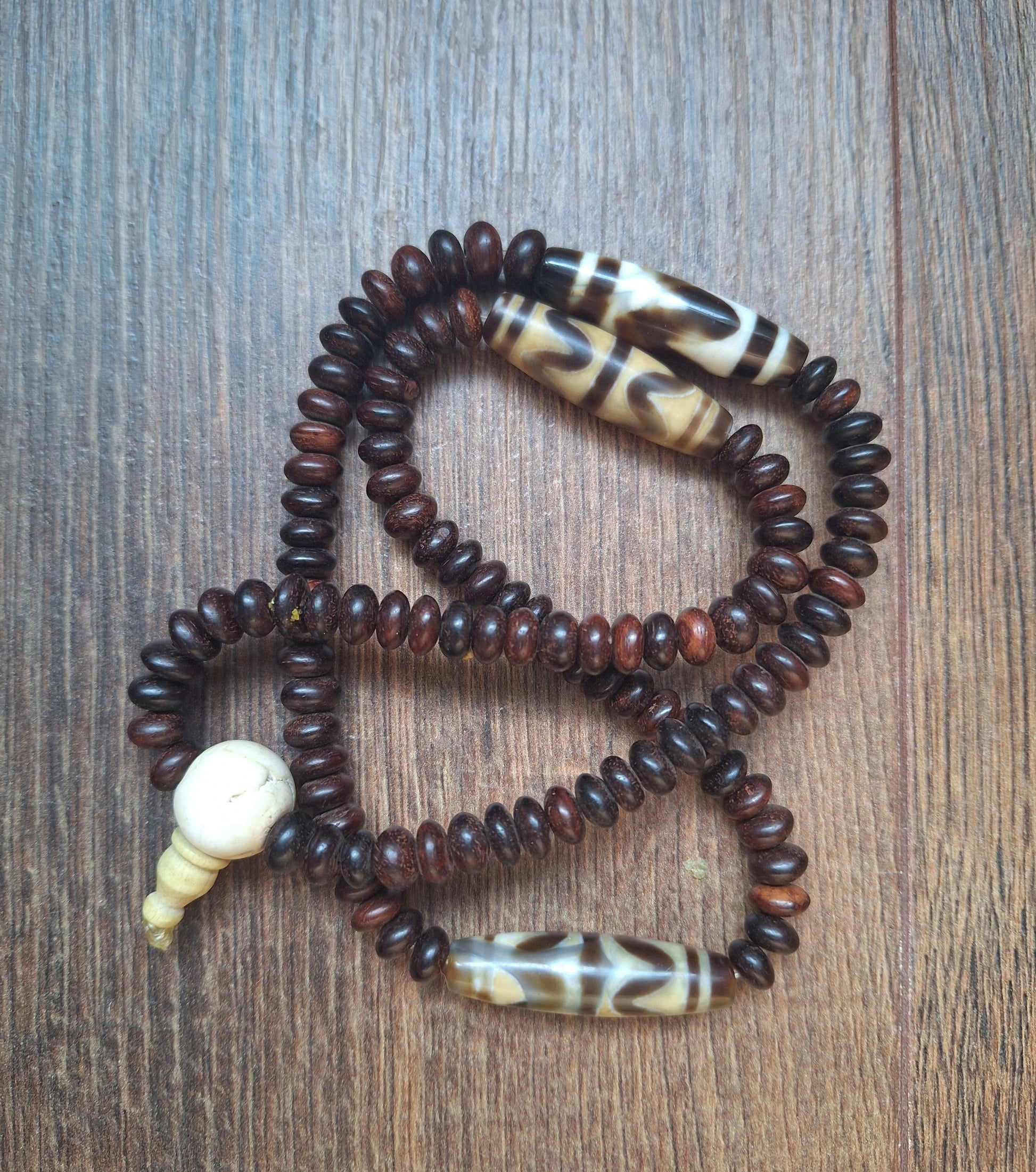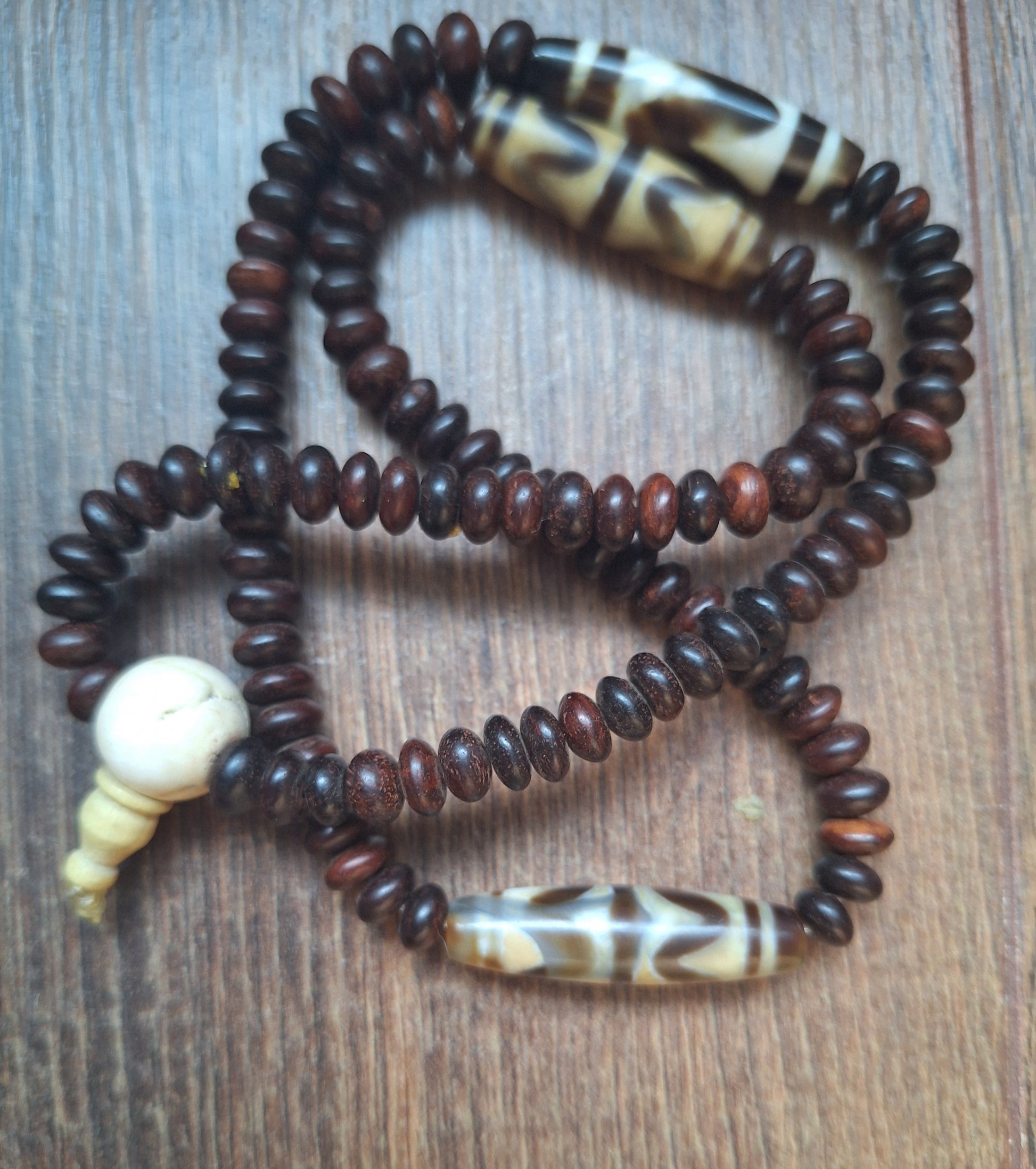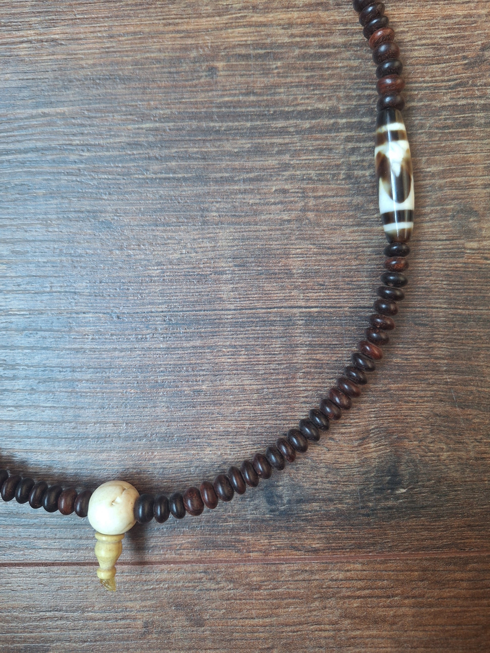 Mala necklace made with 108 dark brown yak bone beads, divided in four groups of 27 each. In between the groups of 27, some dzi beads with the pattern 'Wave' have been added. A large conch shell bead has been used as guru.