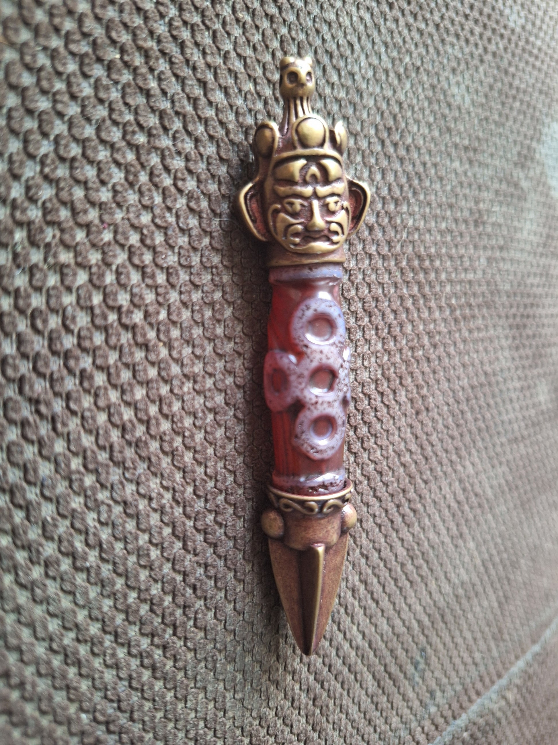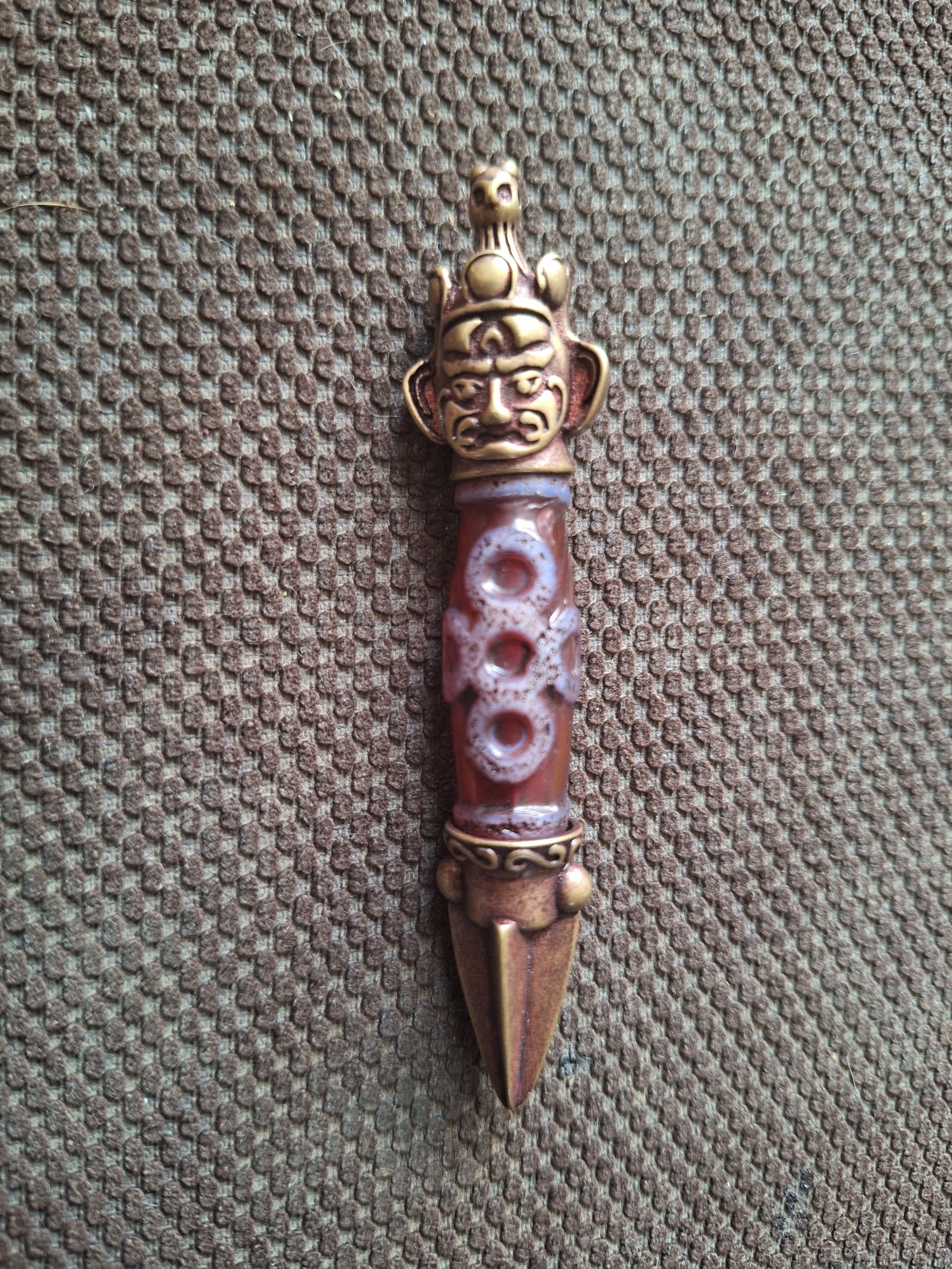 Nice phurba pendant made with a (recently made) Garuda and Lightning dzi bead as the center piece. This phurba pendant, in which the traditional dynamics of the phurba itself have been combined with the symbolism of the specific dzi bead, can be worn as a personal protective amulet or for that reason be attached to your ritual attributes or clothing, but can also be used as a fully-functional ritual weapon in handy travel-size.