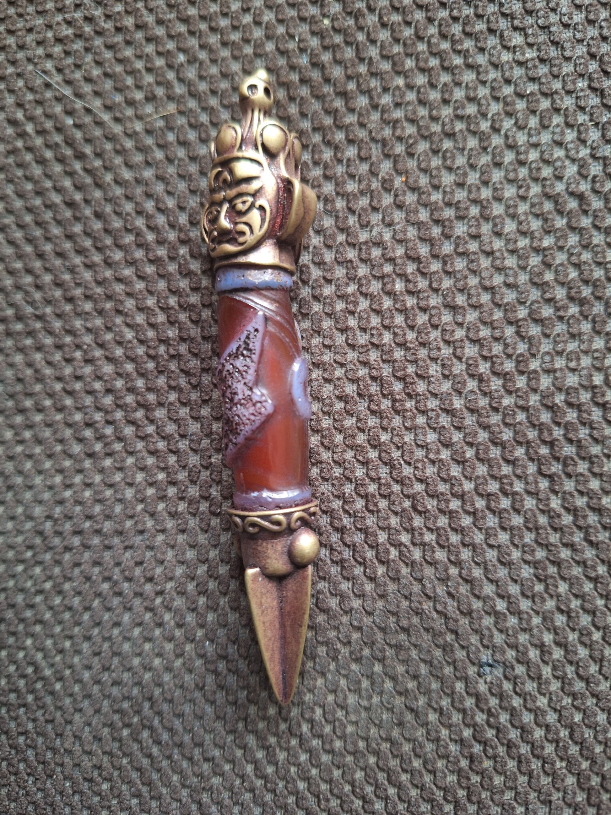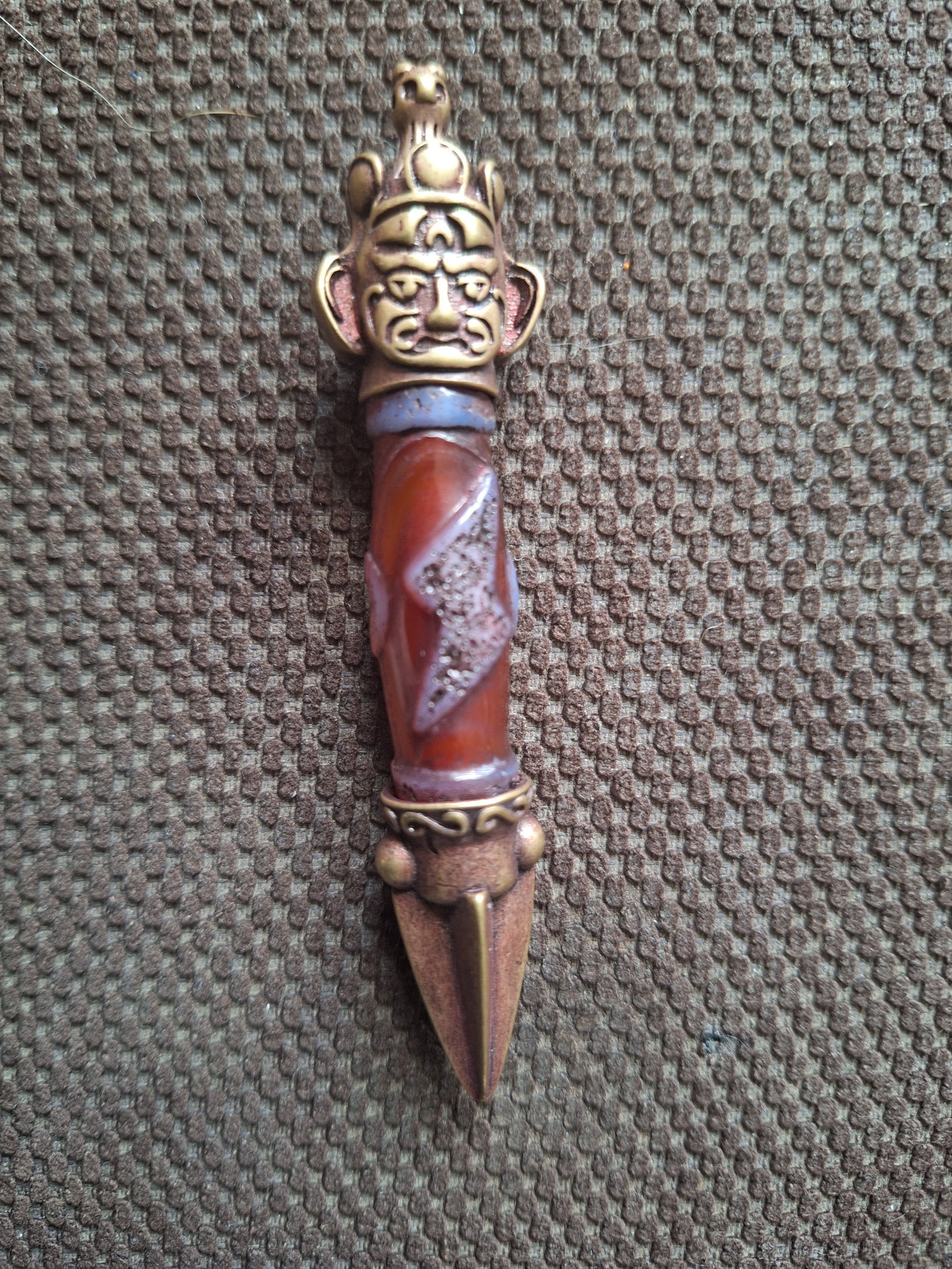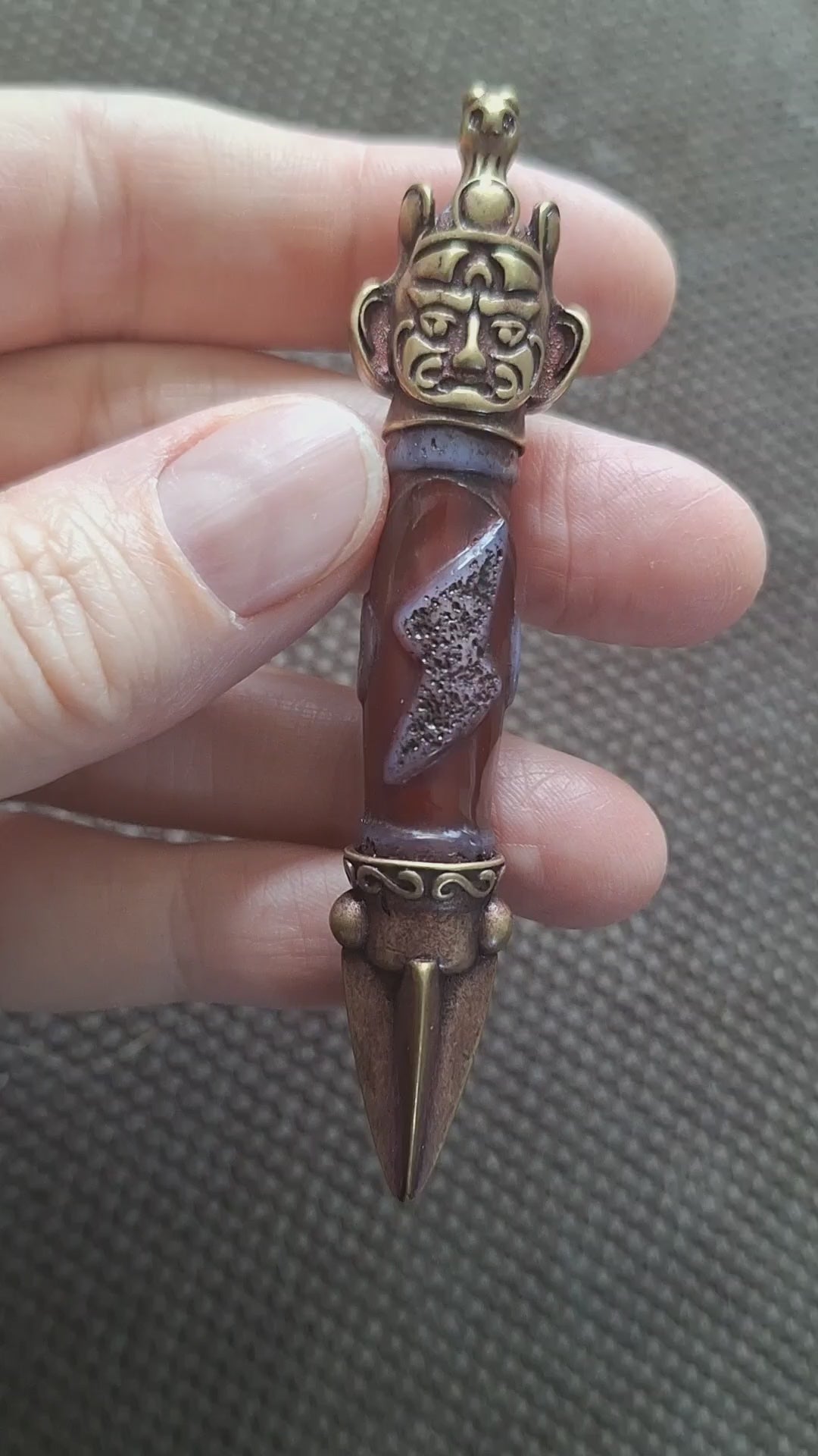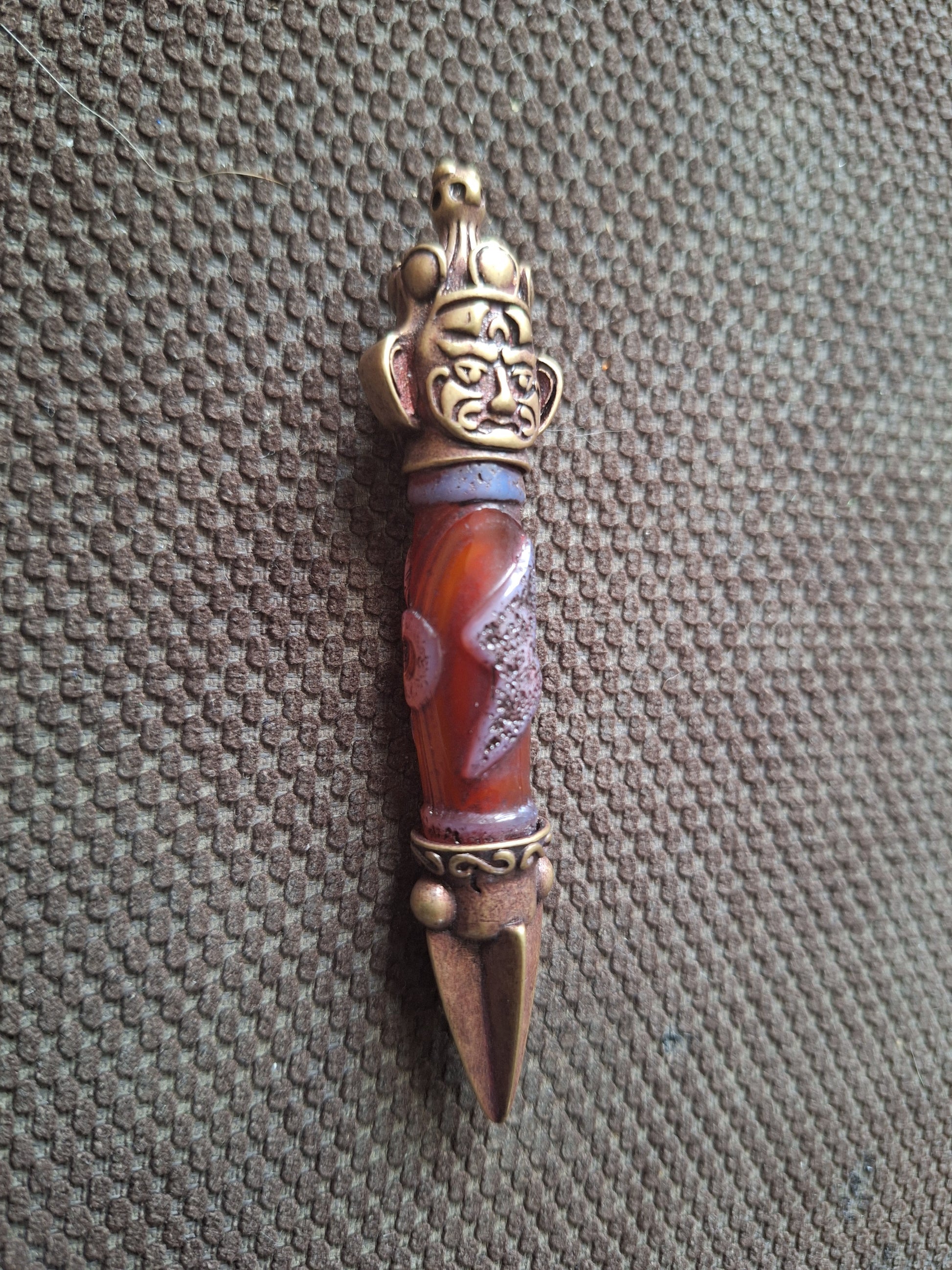 Total length of this pendant is 8,8 centimeters. Weight is 29 grams. The dzi bead is a recently made one, in a red-brown, semi-transparent color, with the decoration in high relief on it. The face of Hayagriva and the (in this case 4 sided) phurba tip are made of bronze.