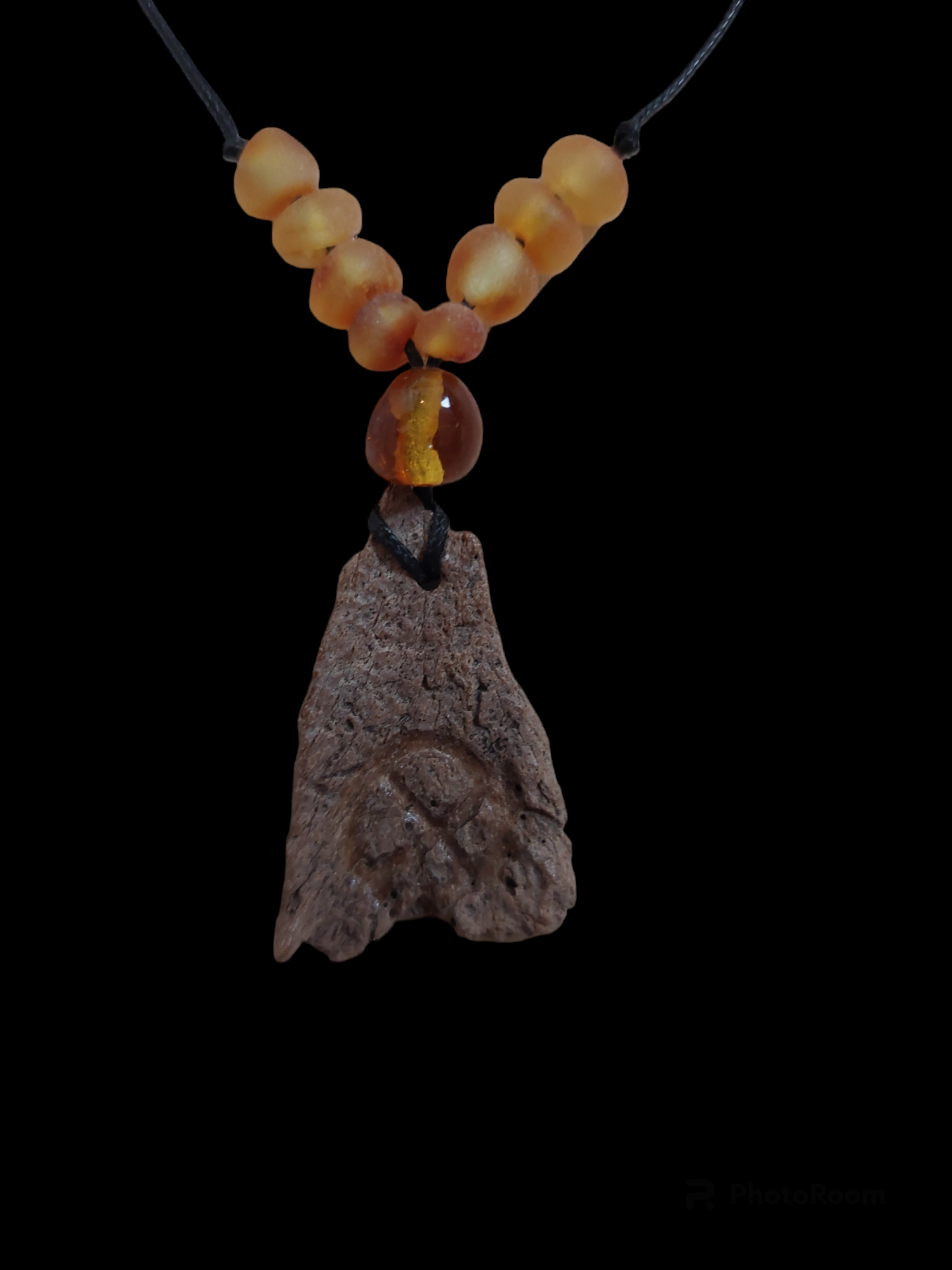 Engraved fossilized bone and amber amulet necklace #1