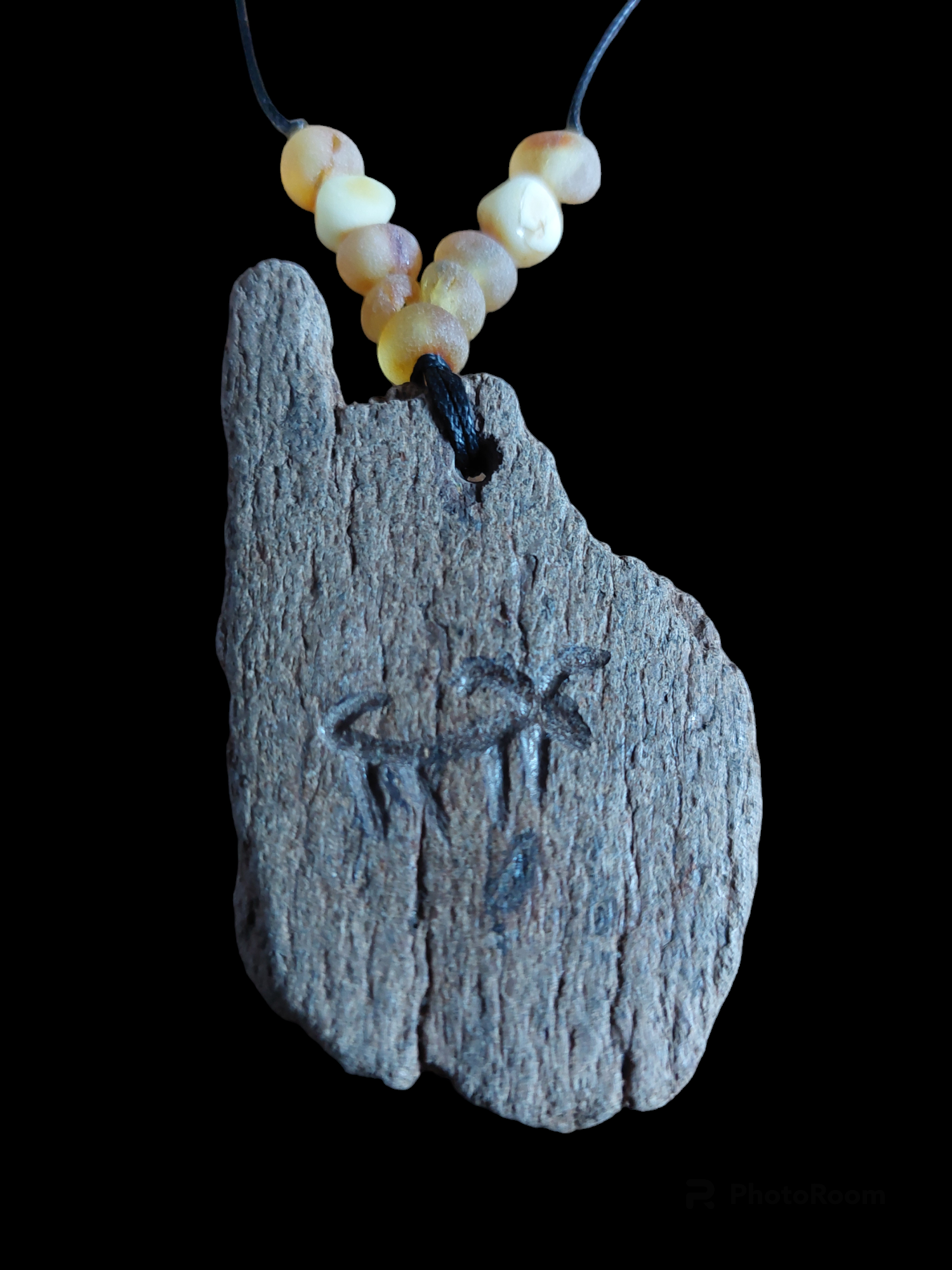 The bone pendant has been combined with beads made from Baltic amber, in a natural frosted look.
