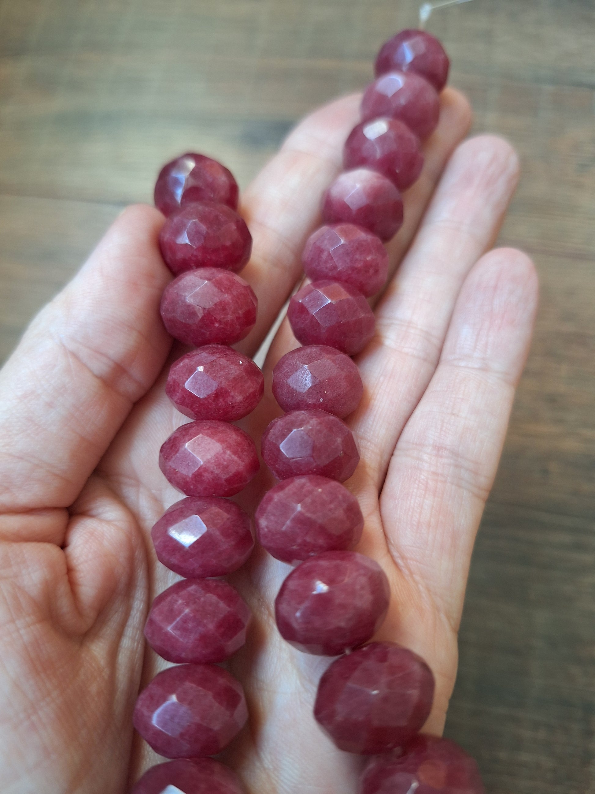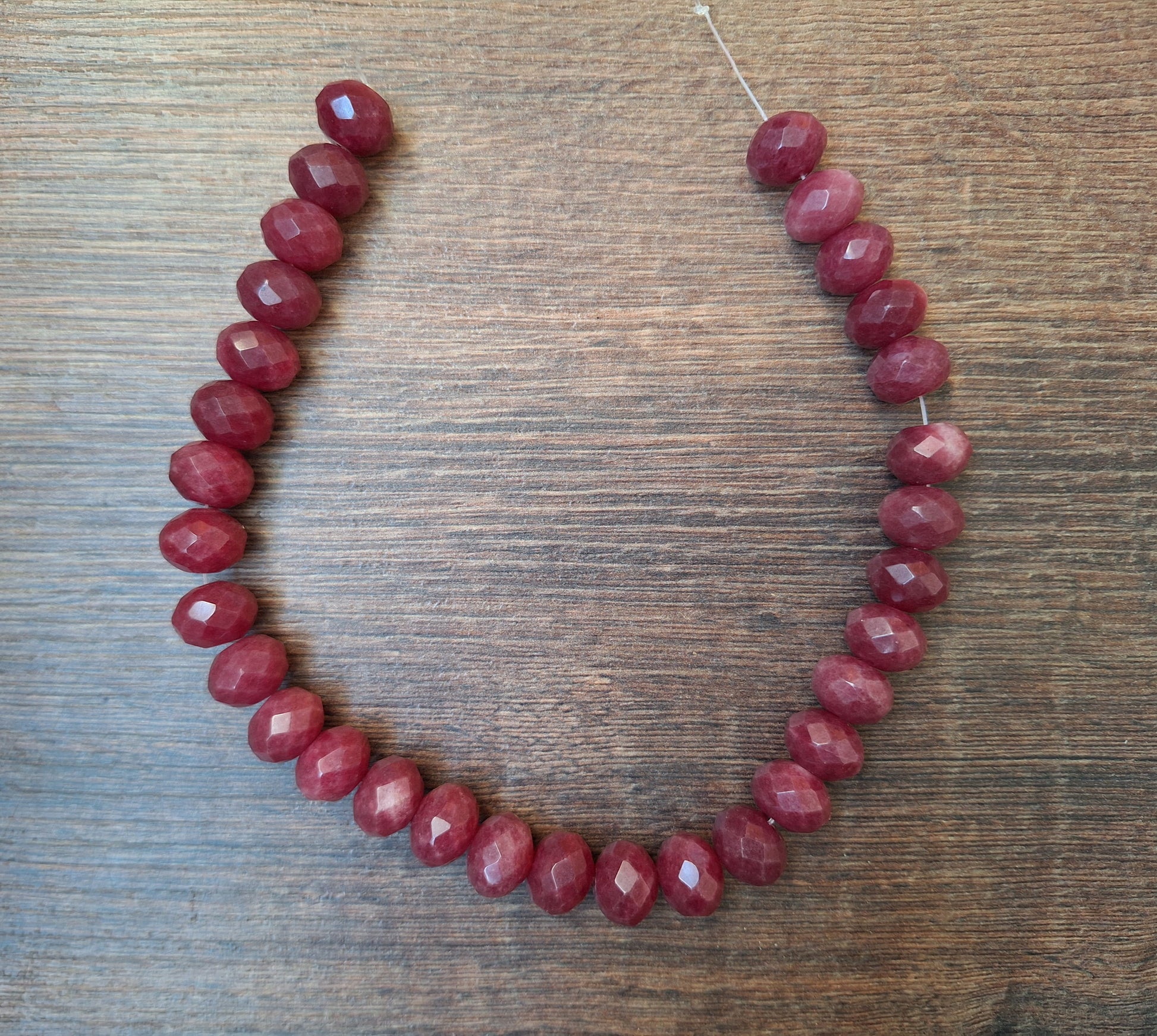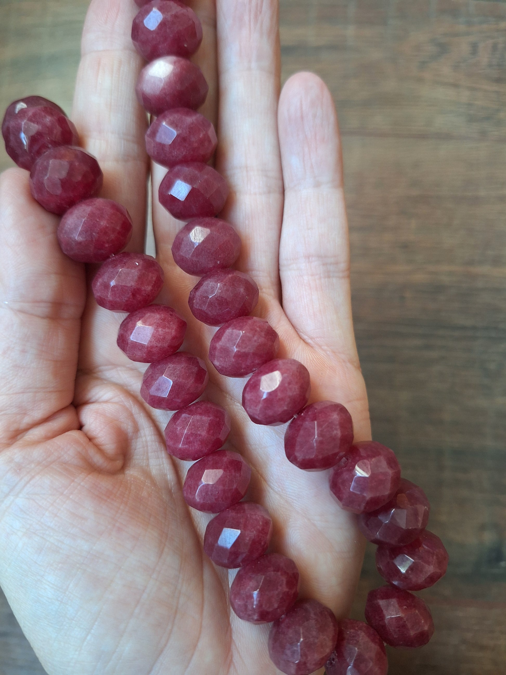 Strand of 31 facet cut ruby beads, in a cloudy dark pink-magenta color. These natural stone beads show the natural pattern of their crystalline quartz matrix underneath the beautiful shine of their faceted outside.