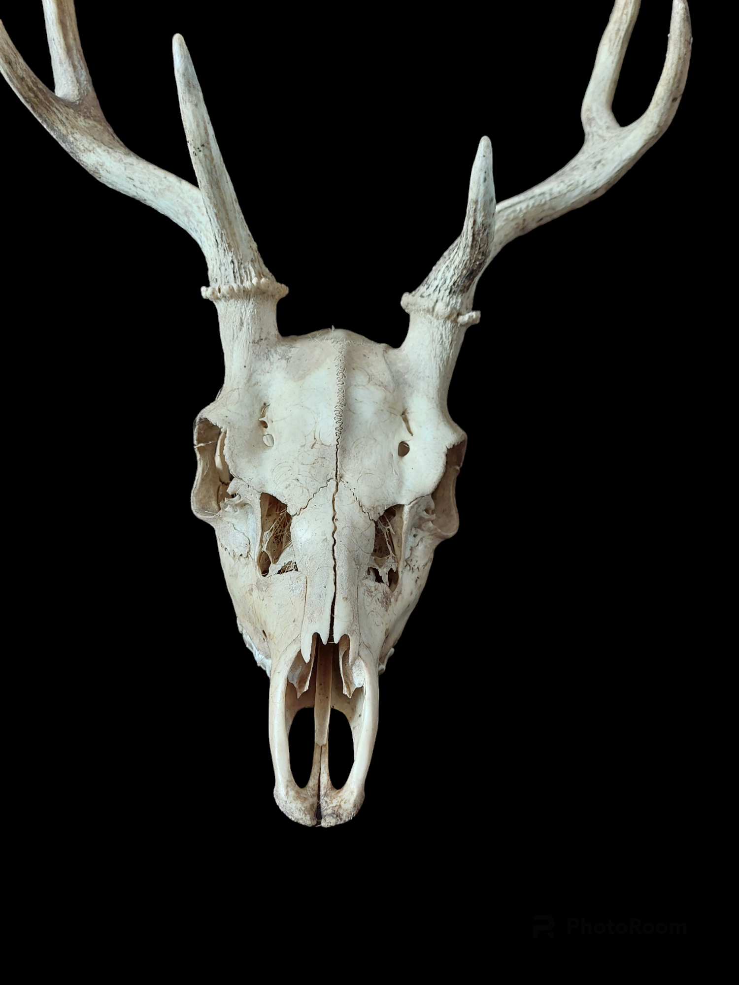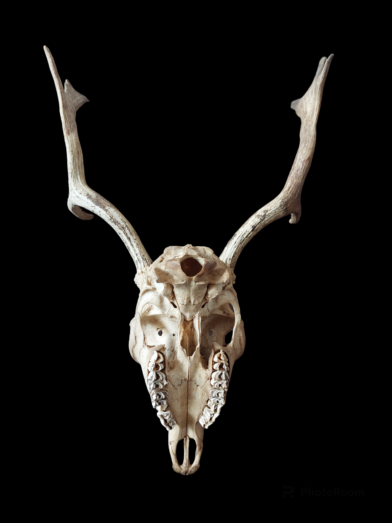 Very nice upper skull from a fallow deer, with beautiful, almost symmetrical antlers (10 ender). This skull is a forest find from Sweden, the cleaning has been a completely natural process (except for a bit last minute soil removal of course). So this skull isn't in any way defleshed, cooked or bleached by human hands.