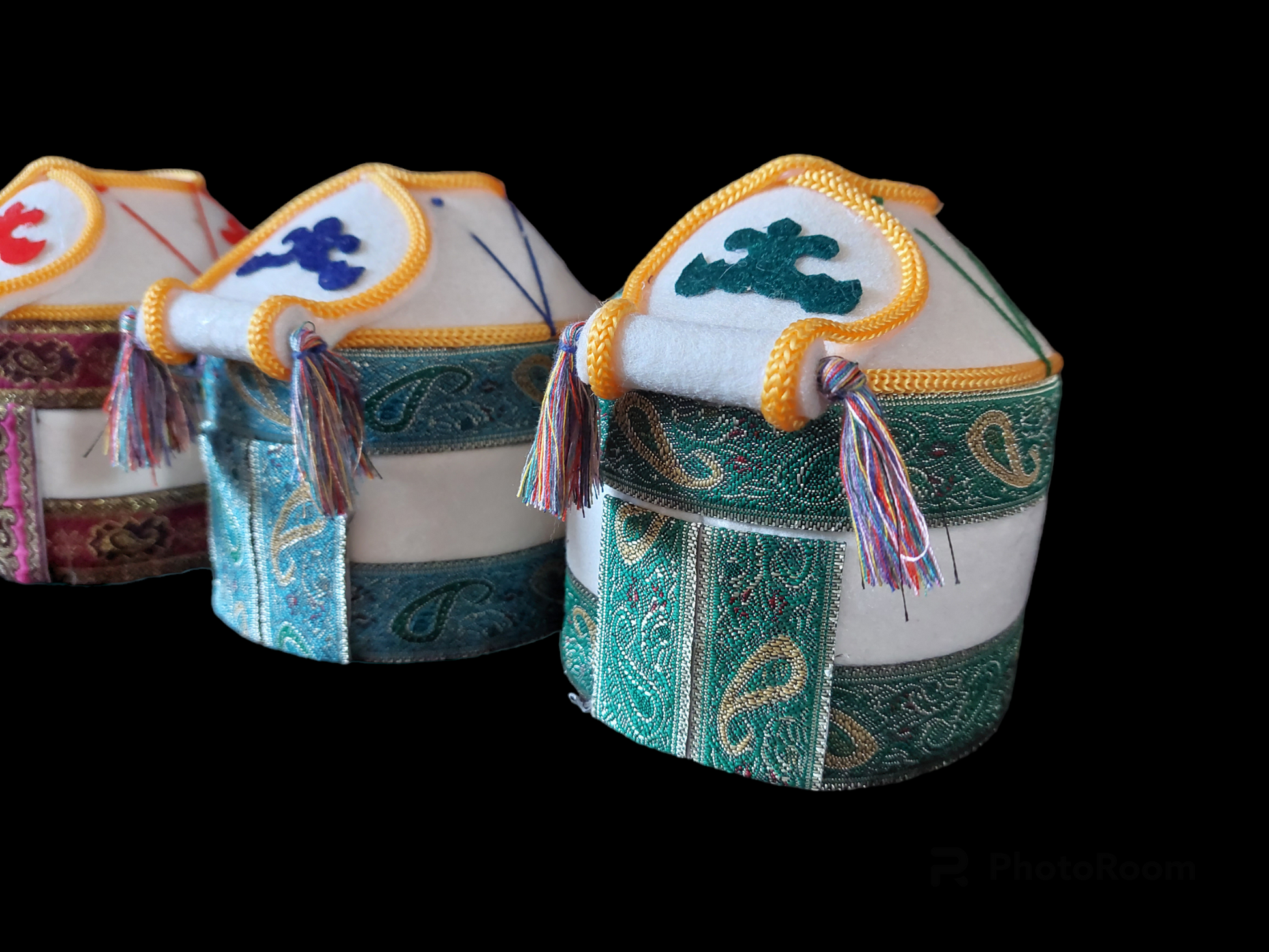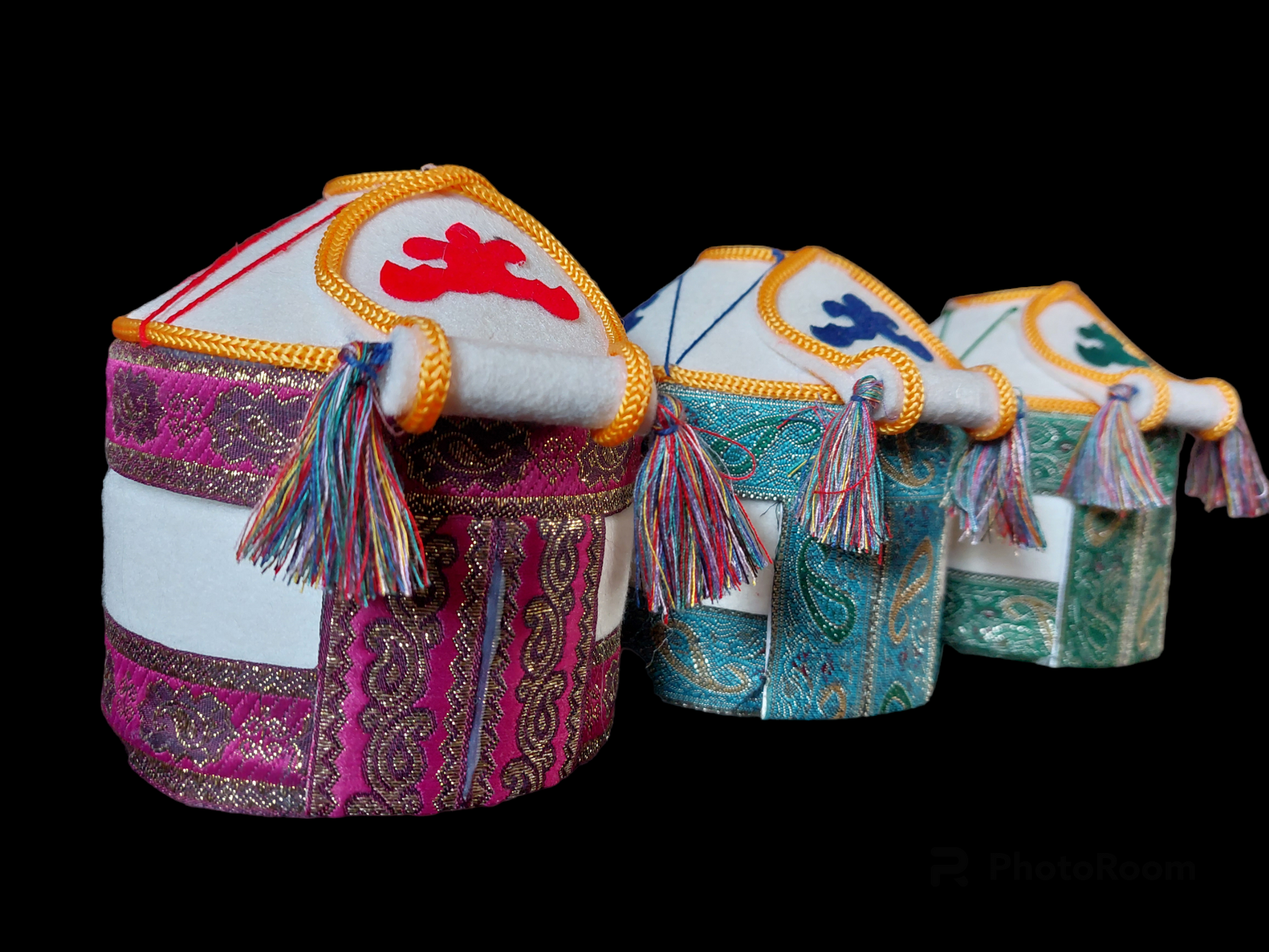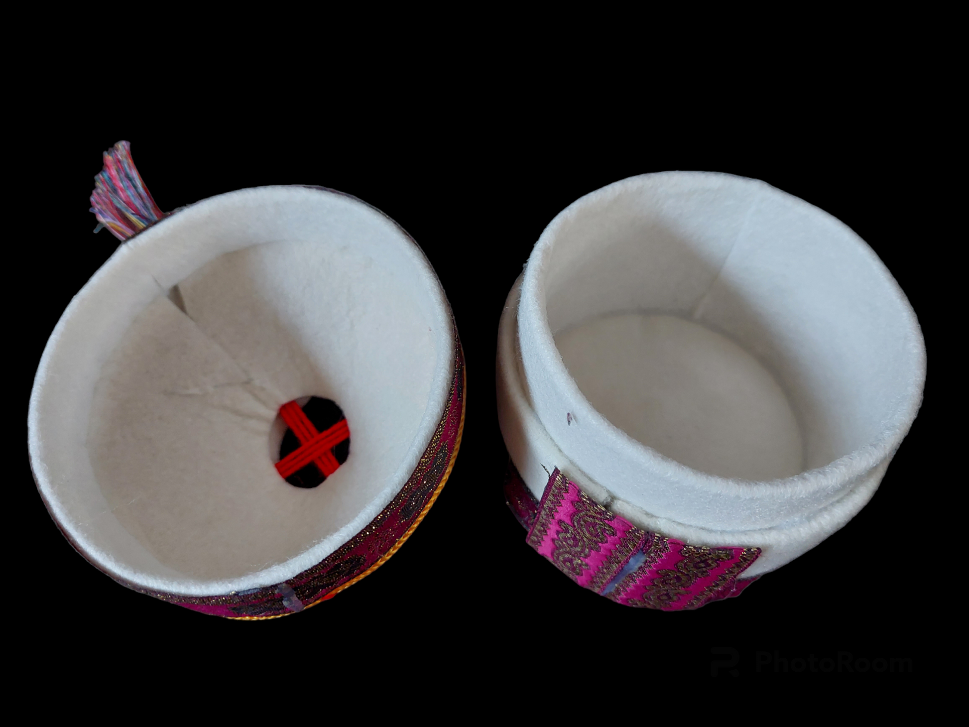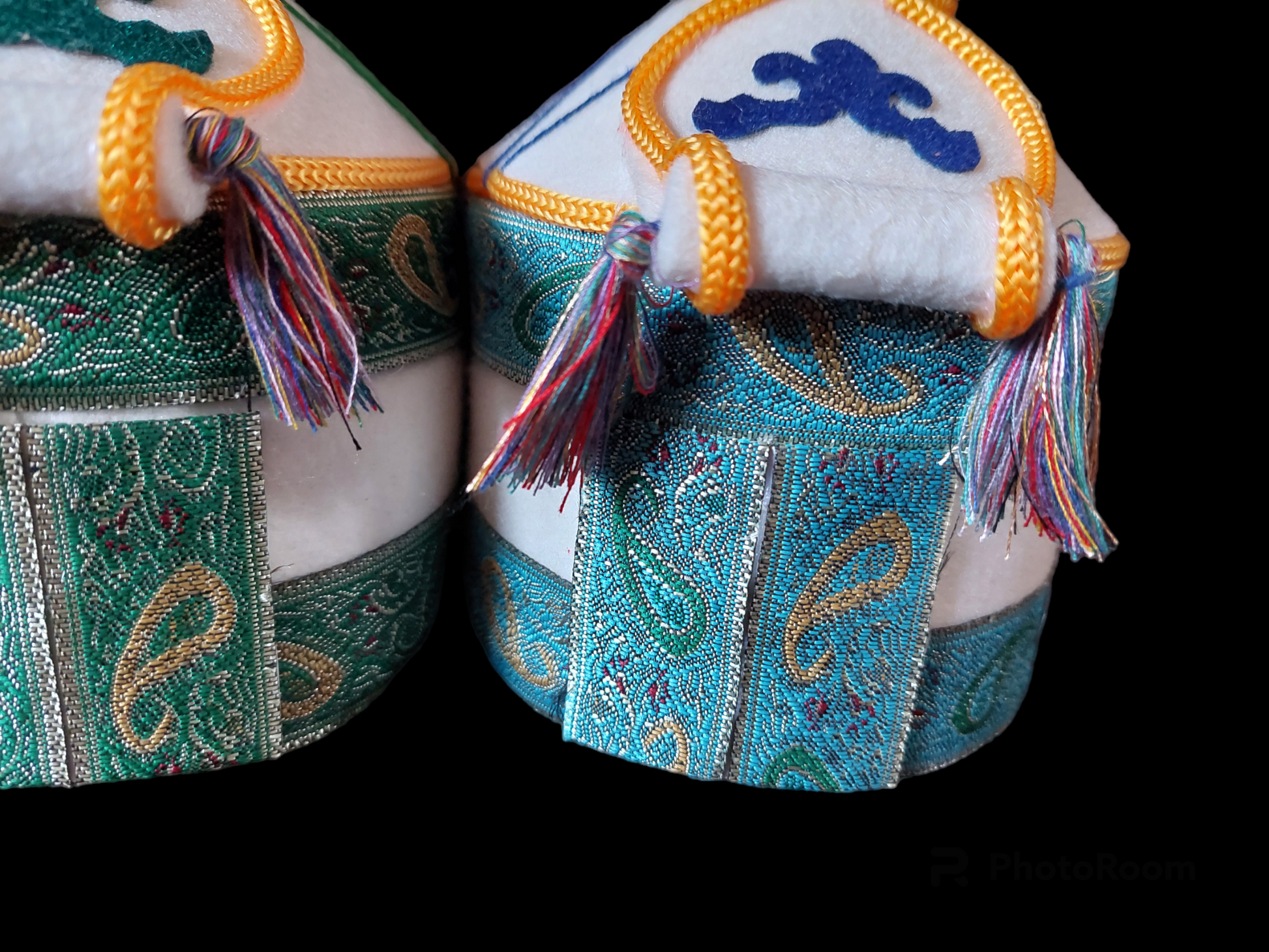 Very nice storage boxes made with felt and colorful decorations, resembling the shape of the round tents, traditionally used by nomadic people in Siberian and Central-Asian territories.