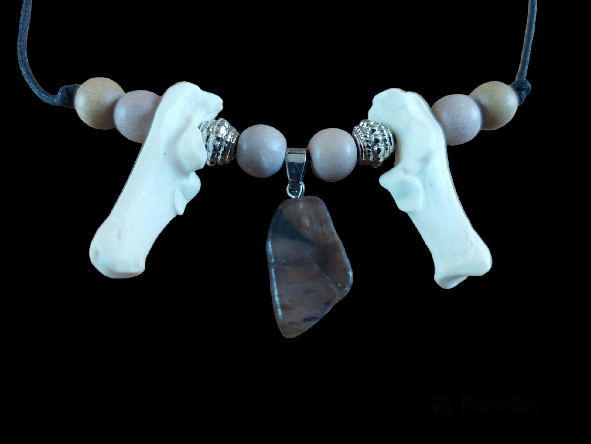 Amulet necklace made with two foot bones from a dutch red fox. In between them hangs a smoky colored, semi-transparent agate pendant. This pendant comes from vintage origin and is given a second life in this amulet necklace.
