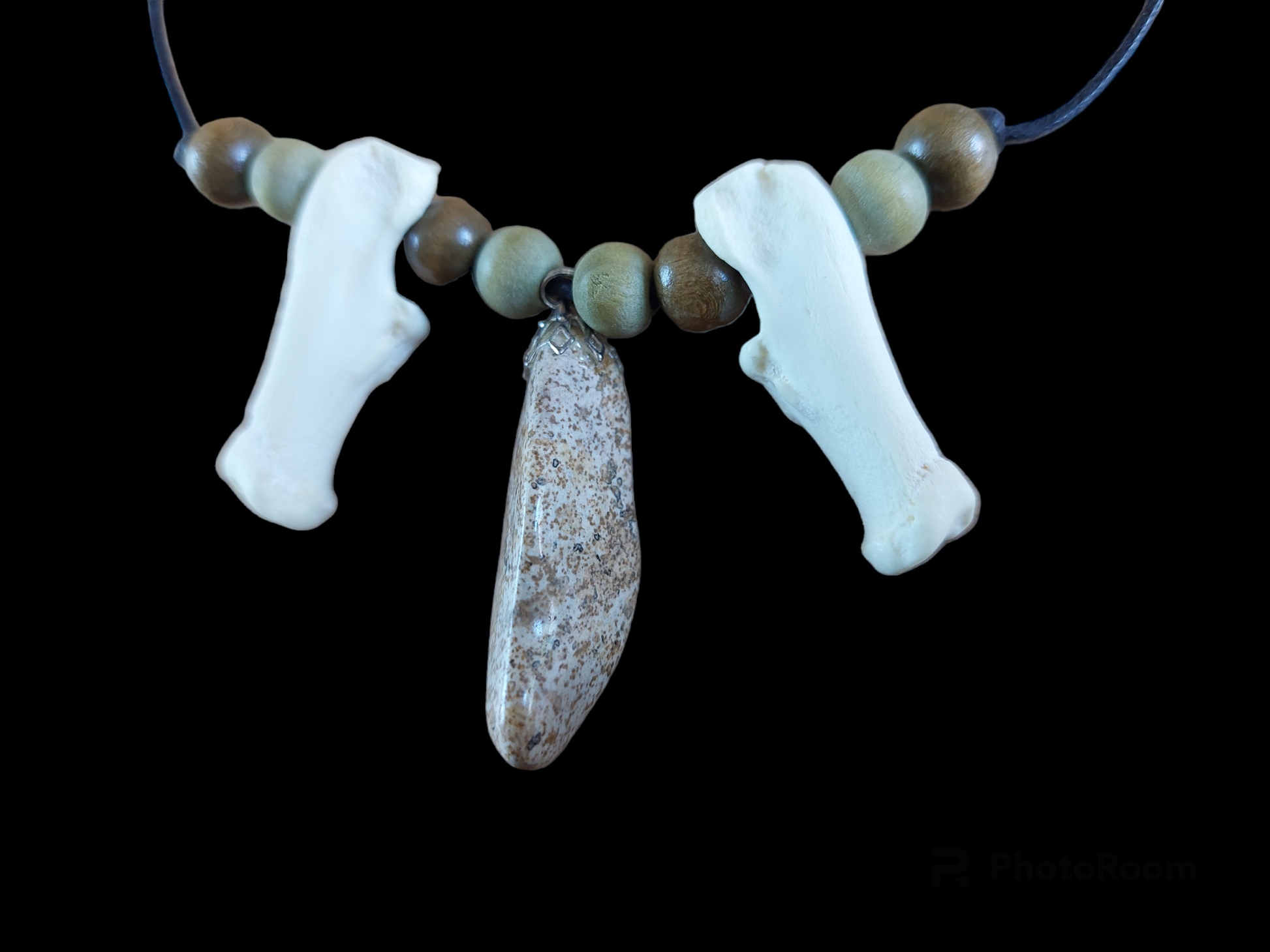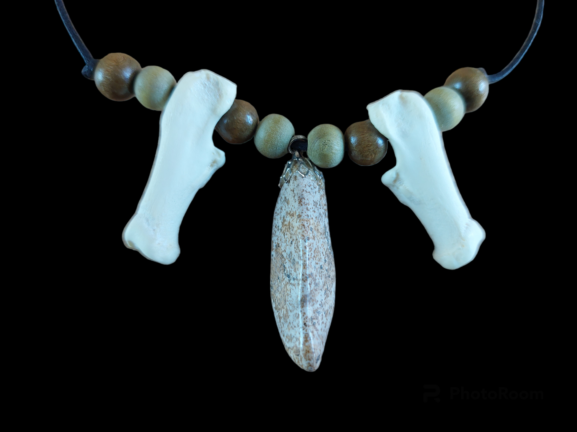 Amulet necklace made with two foot bones from a dutch red fox. In between them hangs a speckled, beige colored jasper pendant. This pendant comes from vintage origin and is given a second life in this amulet necklace.