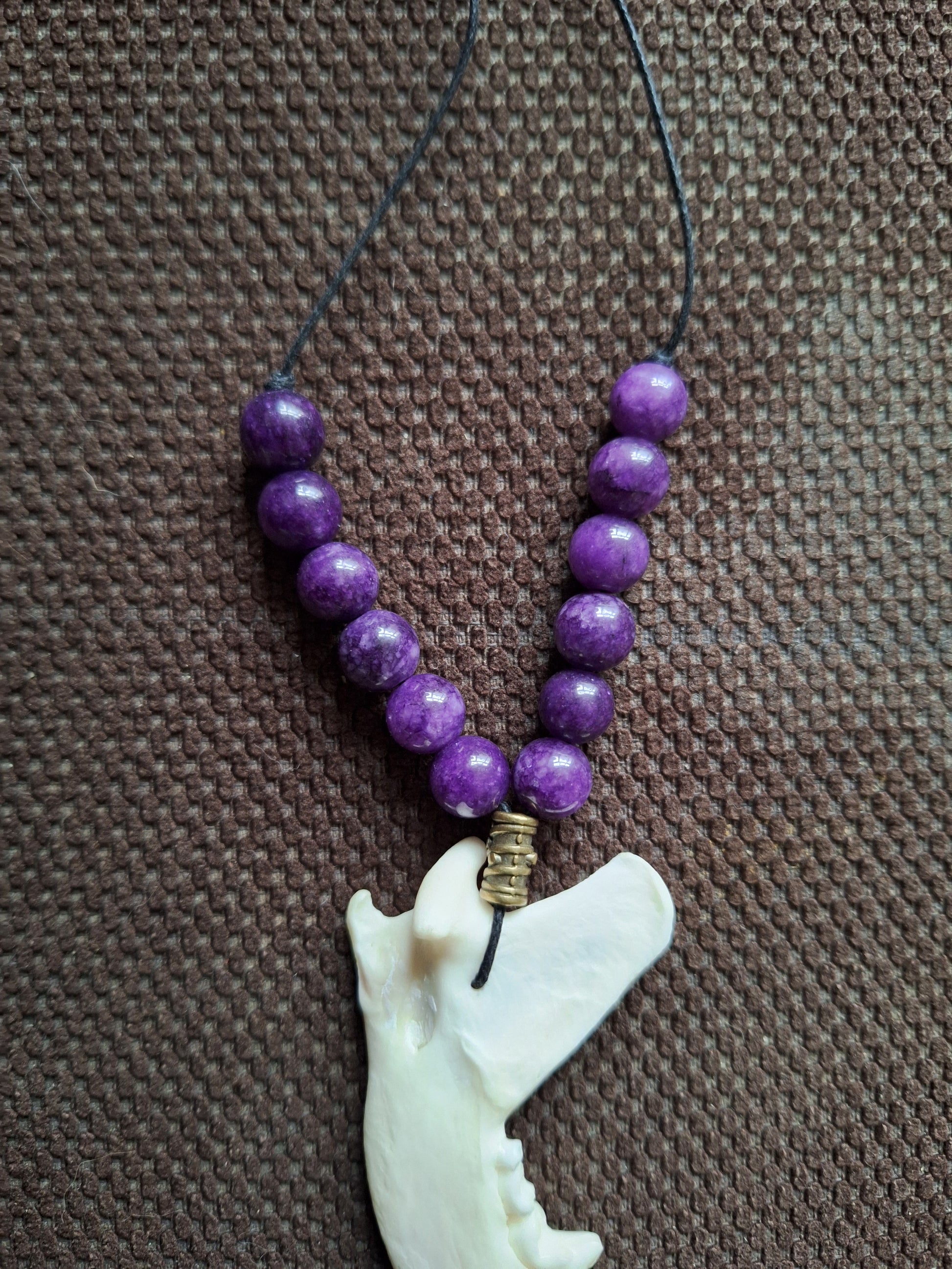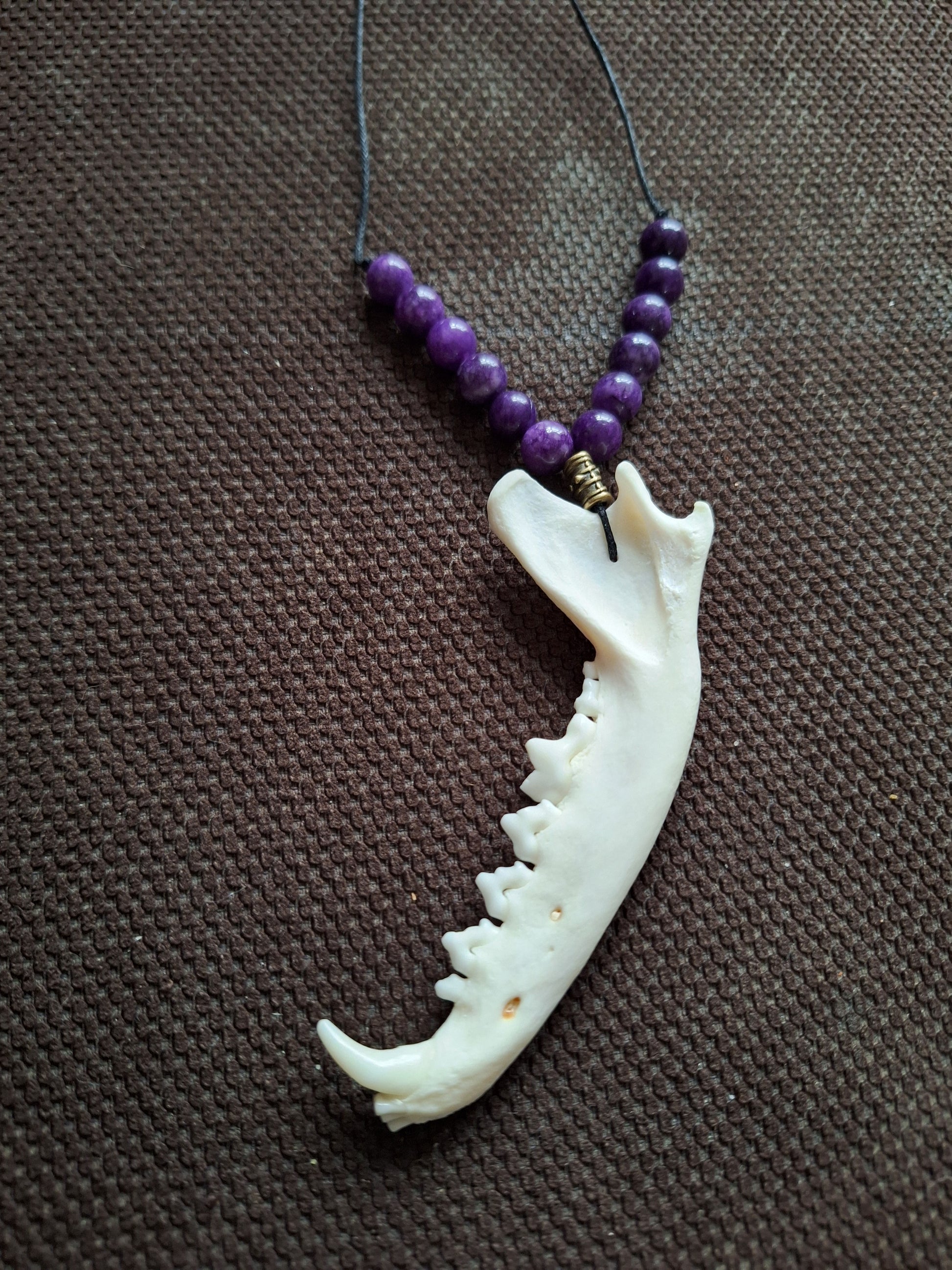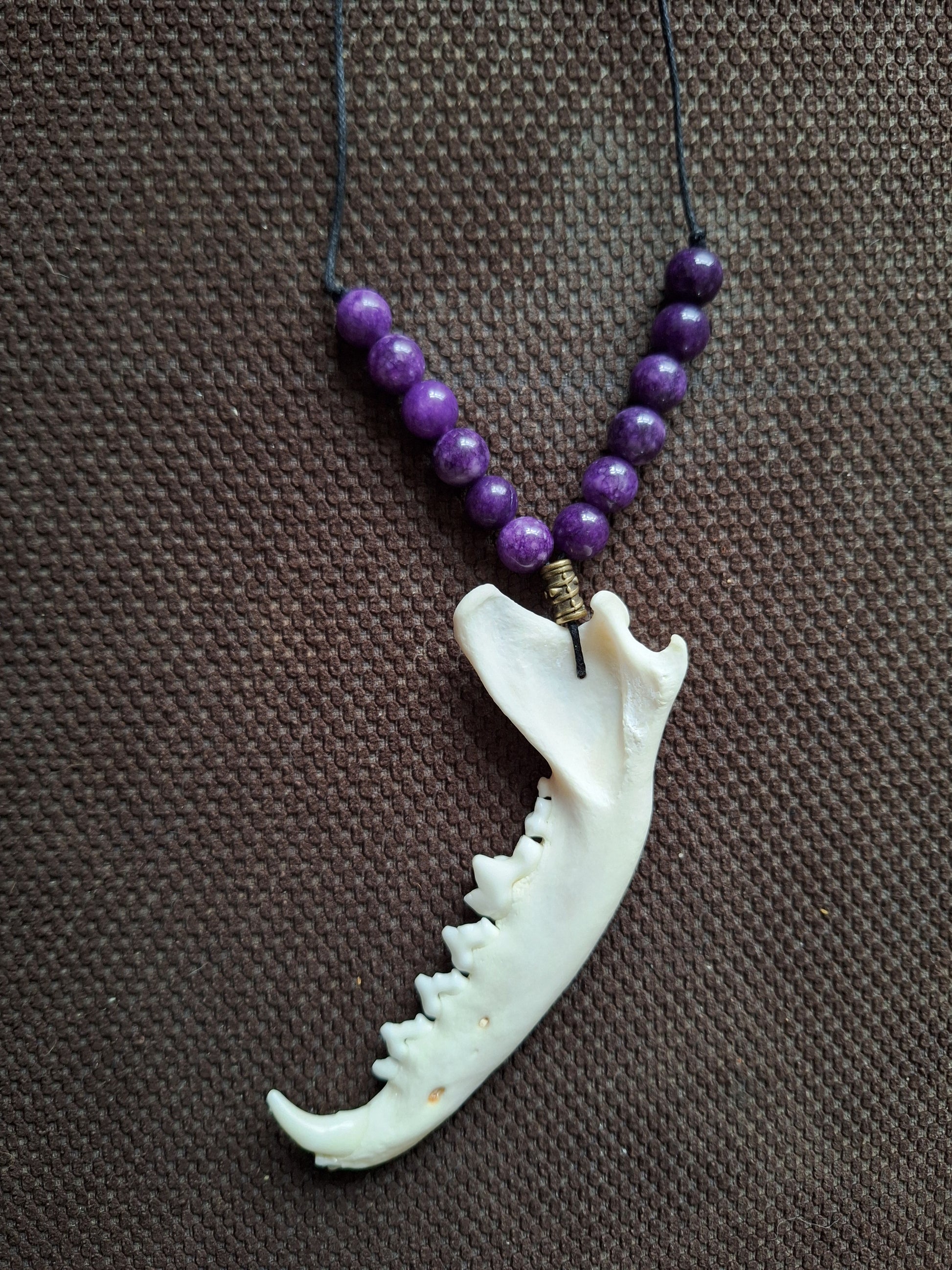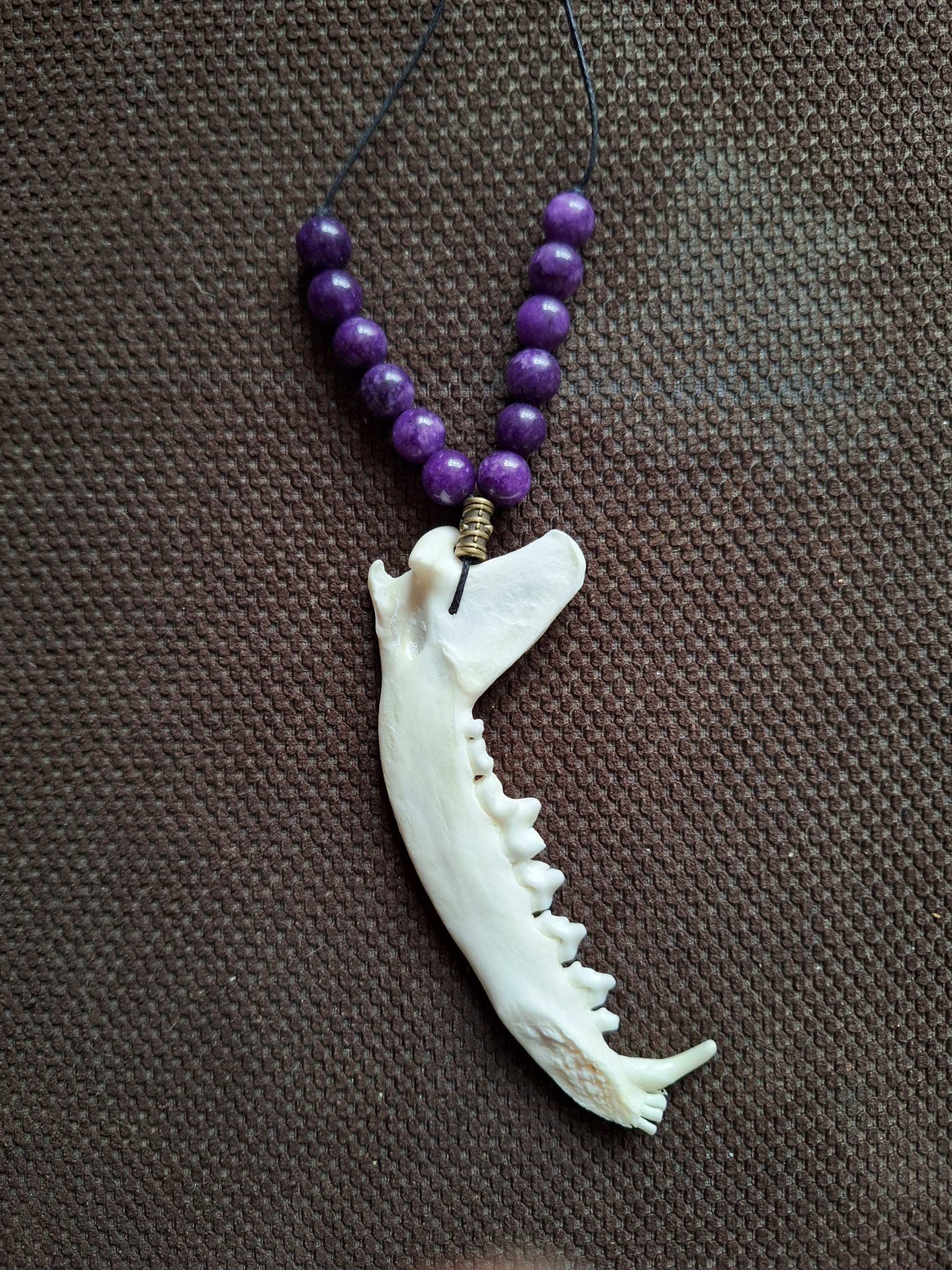 Amulet necklace made with a very nice jaw bone from a dutch red fox. In this necklace the jaw bone has been combined with bright violet colored amethyst beads.
