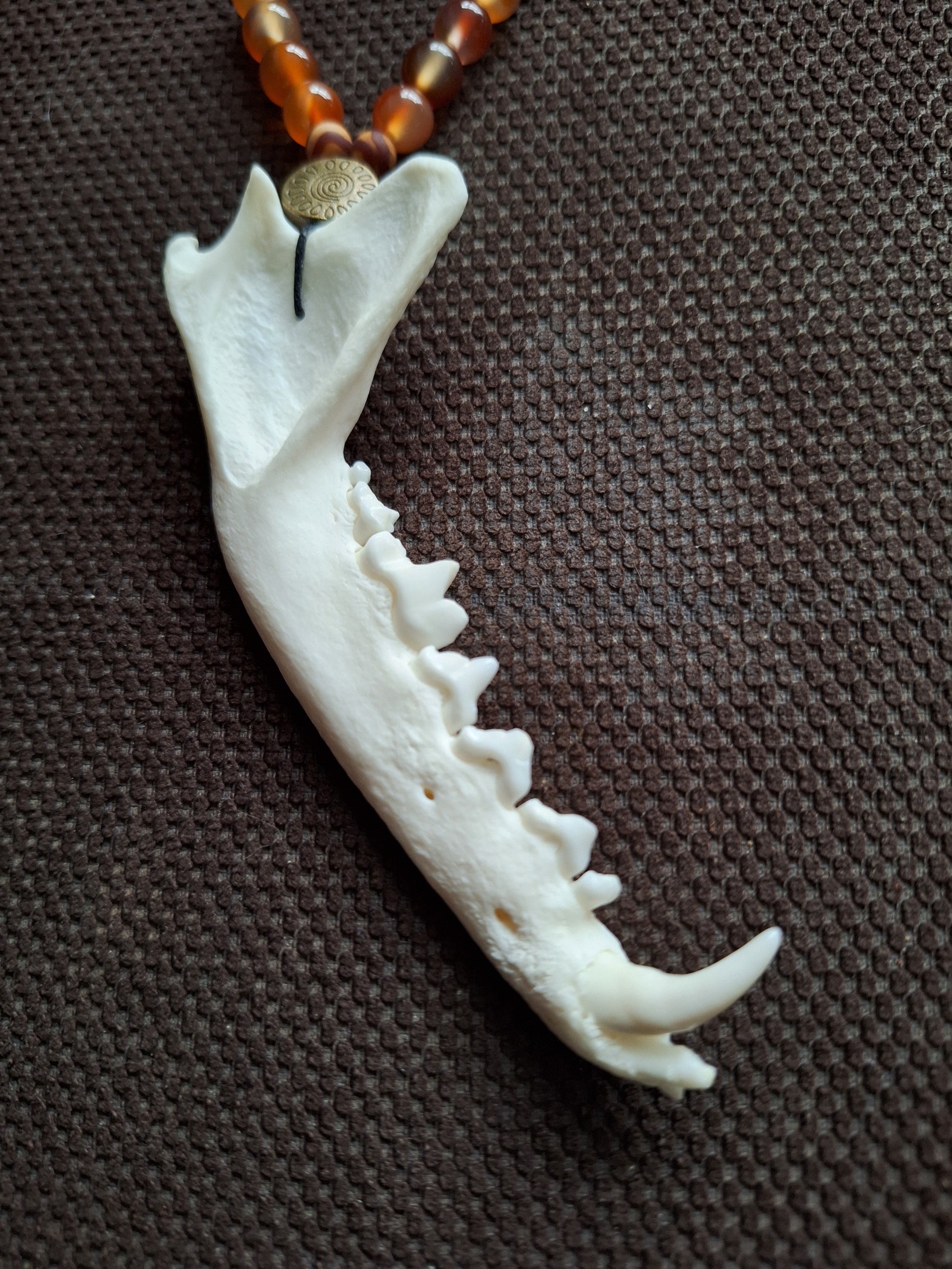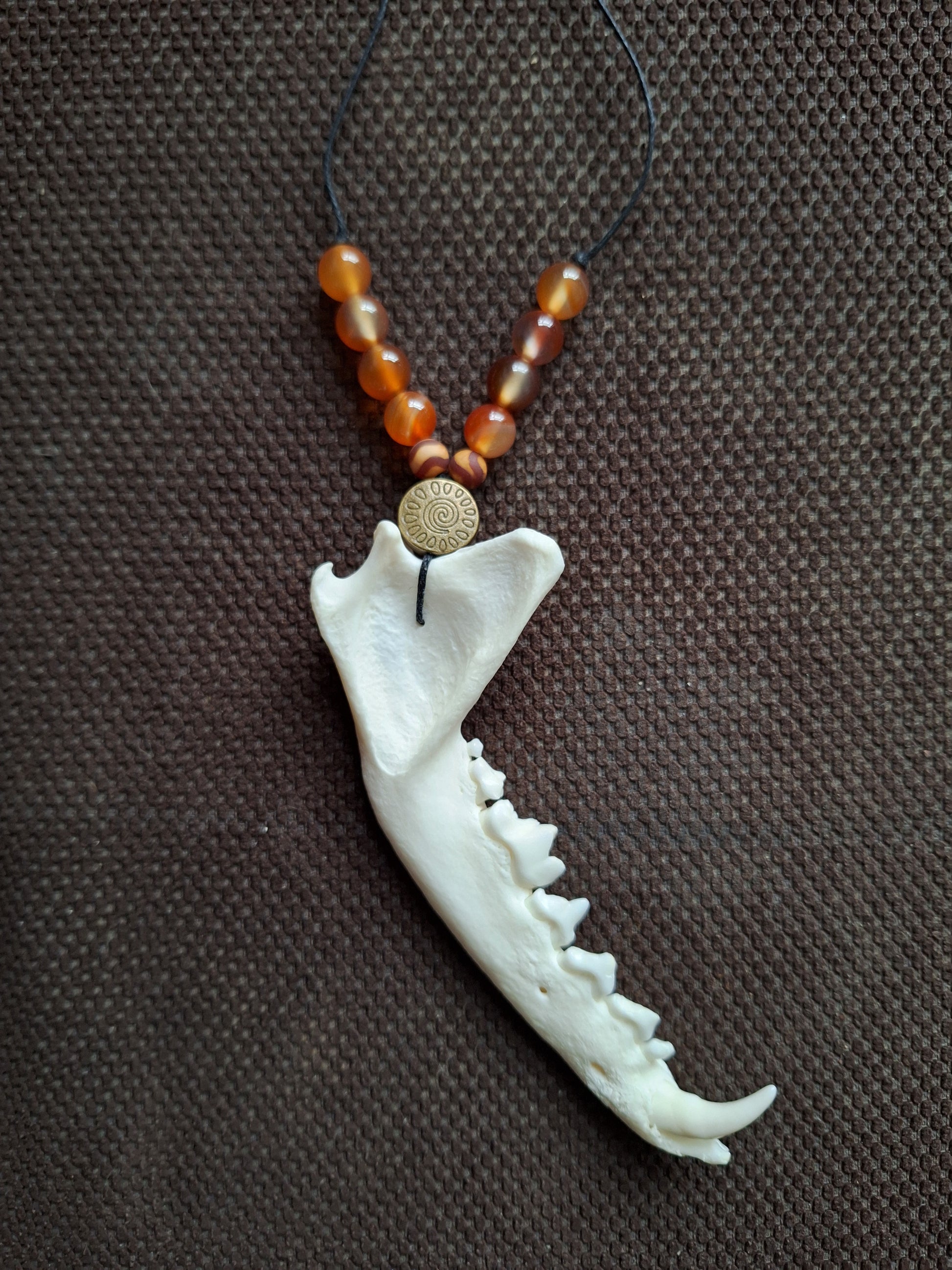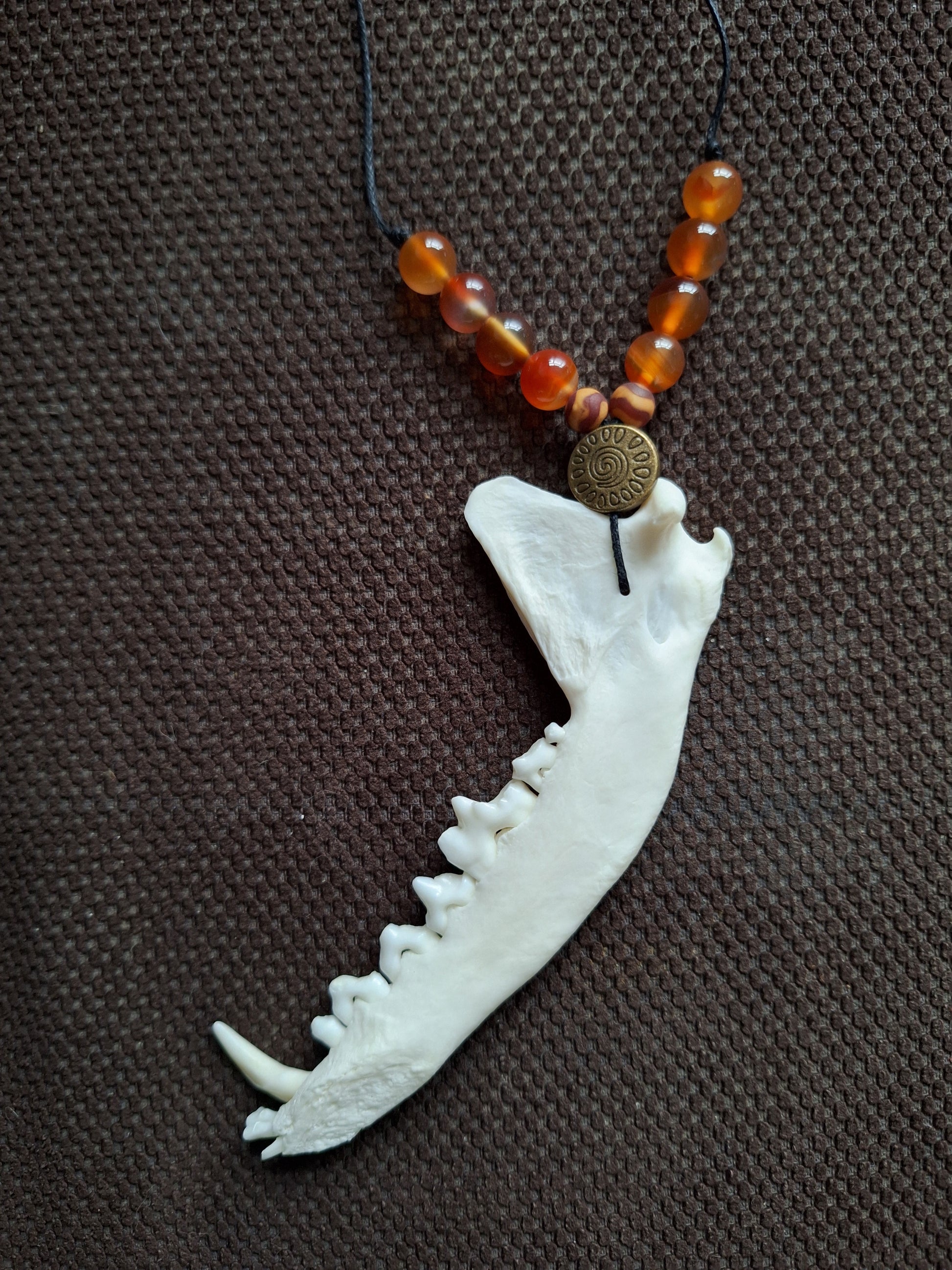 Amulet necklace made with a very nice jaw bone from a dutch red fox. In this necklace the jaw bone has been combined with bright orange carnelian beads. This necklace has been made to support you in working with (or healing) the dynamics of your sacral chakra. It is made for those searching for an amulet to support them living a more vital, active life, filled with joy, creativity and playfullnes. The fox and carnelian assist in finding the inner strenght, drive and courage to live the life that really makes you happy.