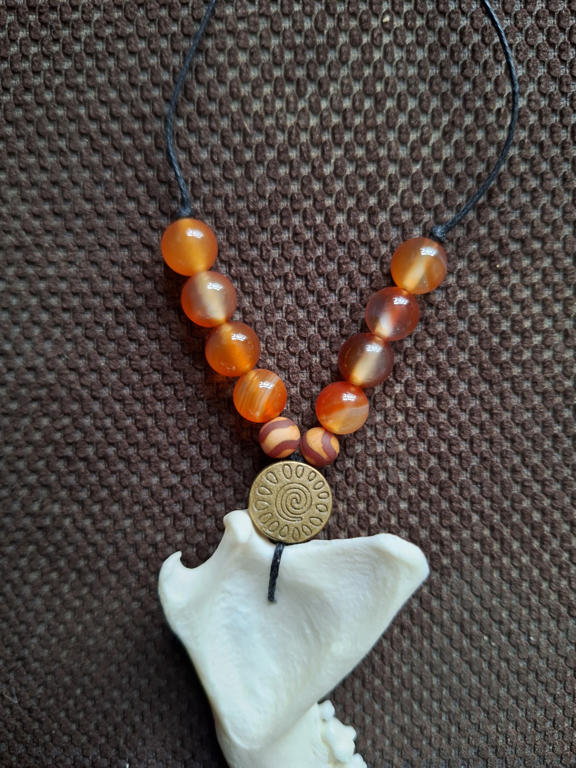 Also some small dzi-style beads with a wave-pattern have been added. There is of course a whole lot that can be said about the symbolism of these dzi beads (read all about it in our Dzi Bead section elsewhere in our shop), but in this necklace these beads have been chosen to support in unblocking stuck emotions, overcoming emotional outbursts and lightnening heavy feelings. Thus relieving some of the blockages that might get in the way of your work with the sacral chakra.
