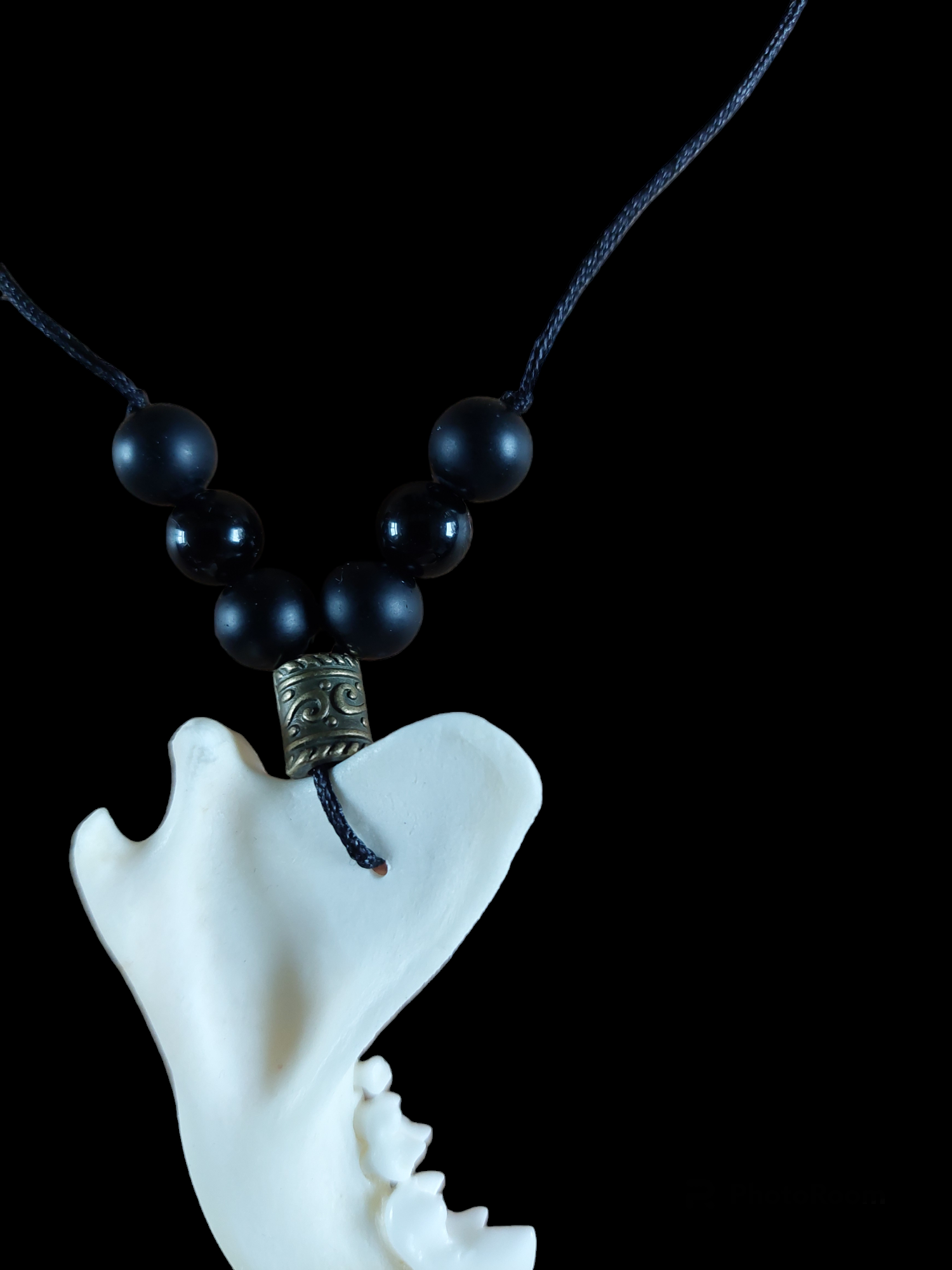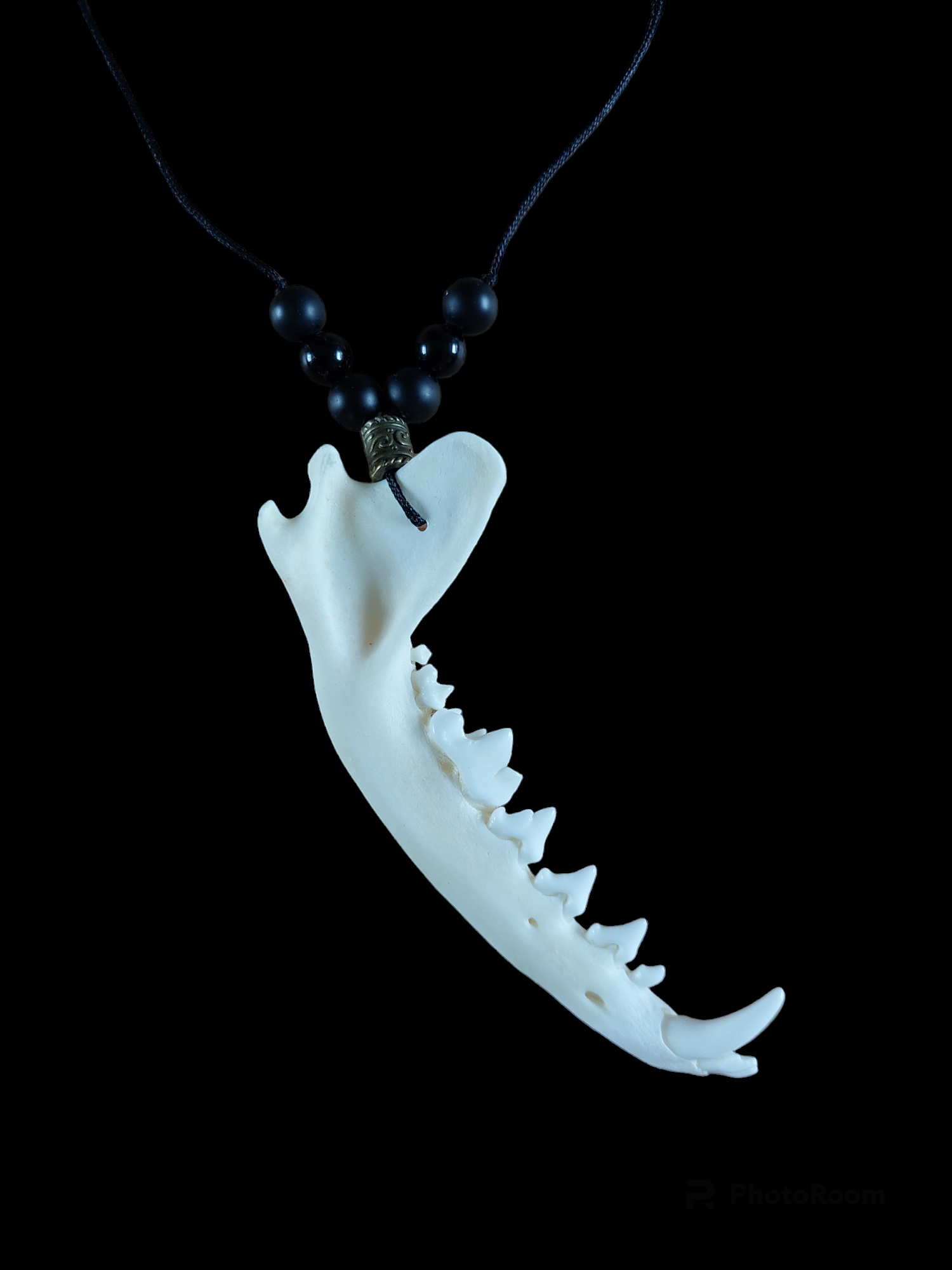 Fox jaw bone and obsidian amulet necklace
