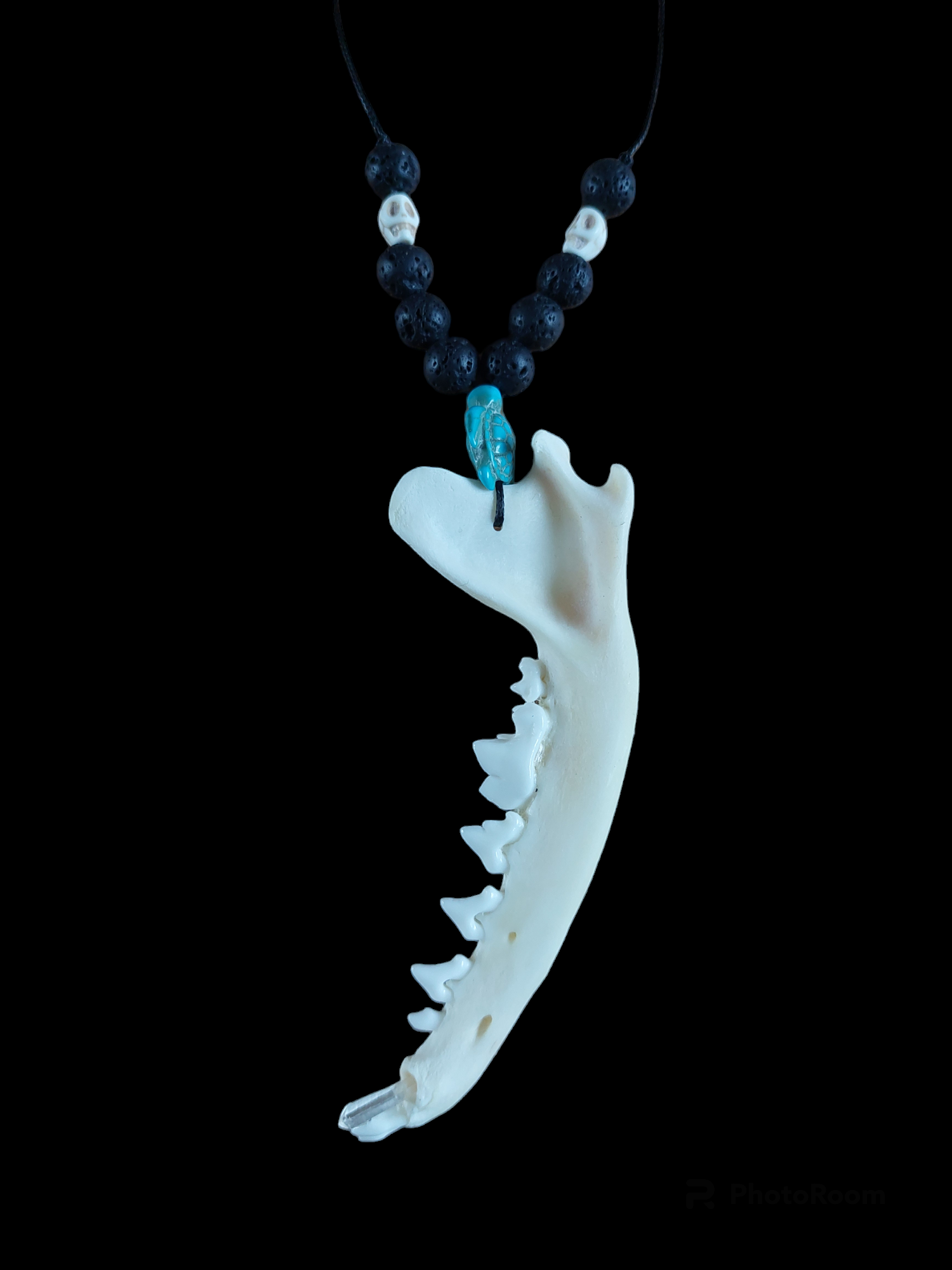 In this necklace, the jaw bone has been combined with a turquoise howlite turtle, white howlite skull beads and black lava stone beads. These items have all been chosen with care for their individual symbolism and dynamics.