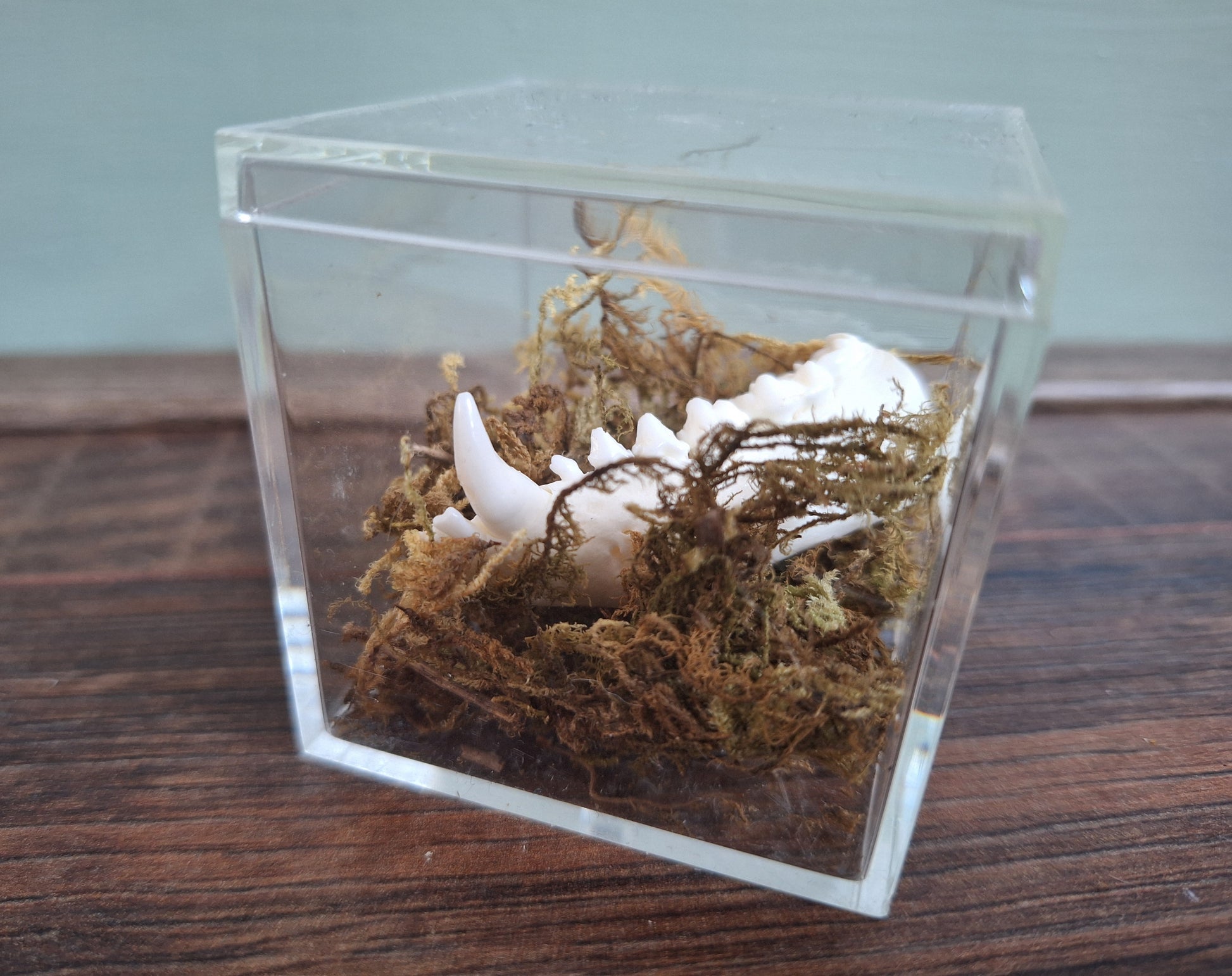 Partial lower jaw from a dutch red fox in a plastic display cube with some decorative moss. Please look closely at the pictures to observe the condition of this item; this is a partial lower jaw only, but it is in good condition including the fang and all other teeth in it.