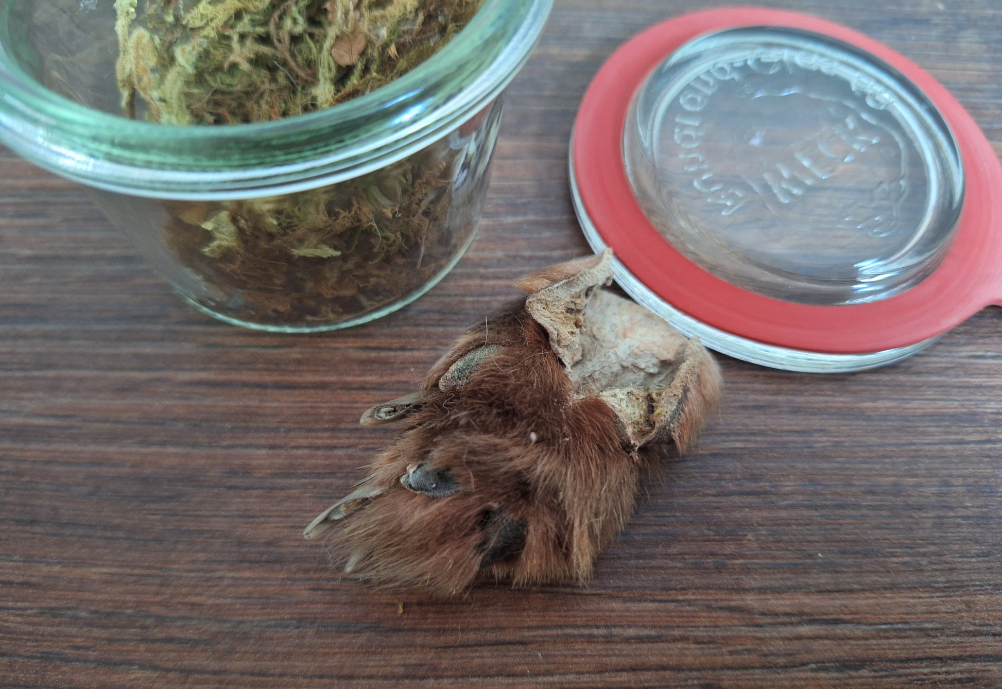 Front paw from a dutch red fox in a nice little glass jar with some decorative moss. Please look closely at the pictures to observe the condition of this item; the paw looks good on the upper side, with nice soft fur and long nails, but the hide on the backside has been damaged. Therefore labelled and prized as B-quality.