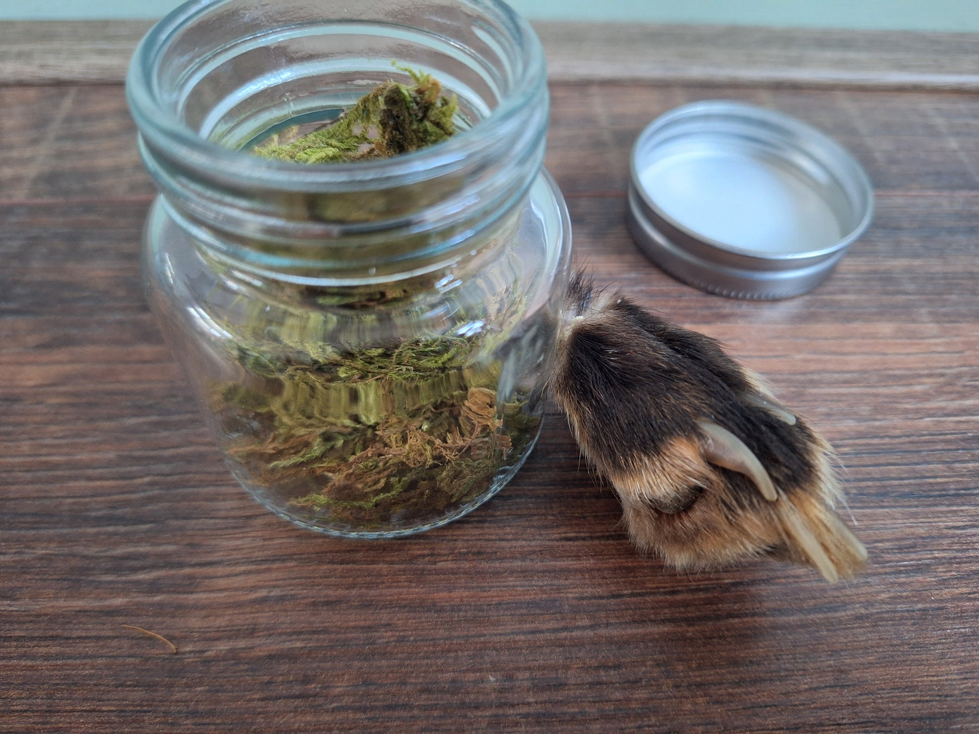 Front paw from a dutch red fox in a nice little glass jar with some decorative moss. Please look closely at the pictures to observe the condition of this item; the paw looks good on the upper side, with nice soft fur and long nails, but the hide on the backside has been damaged. Therefore labelled and prized as B-quality.