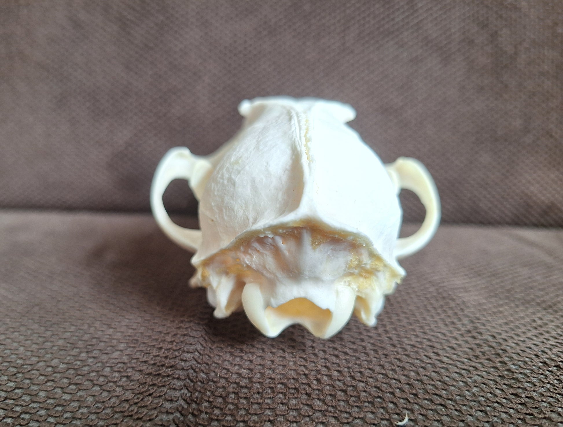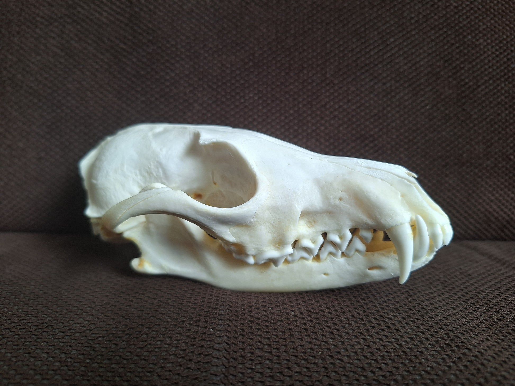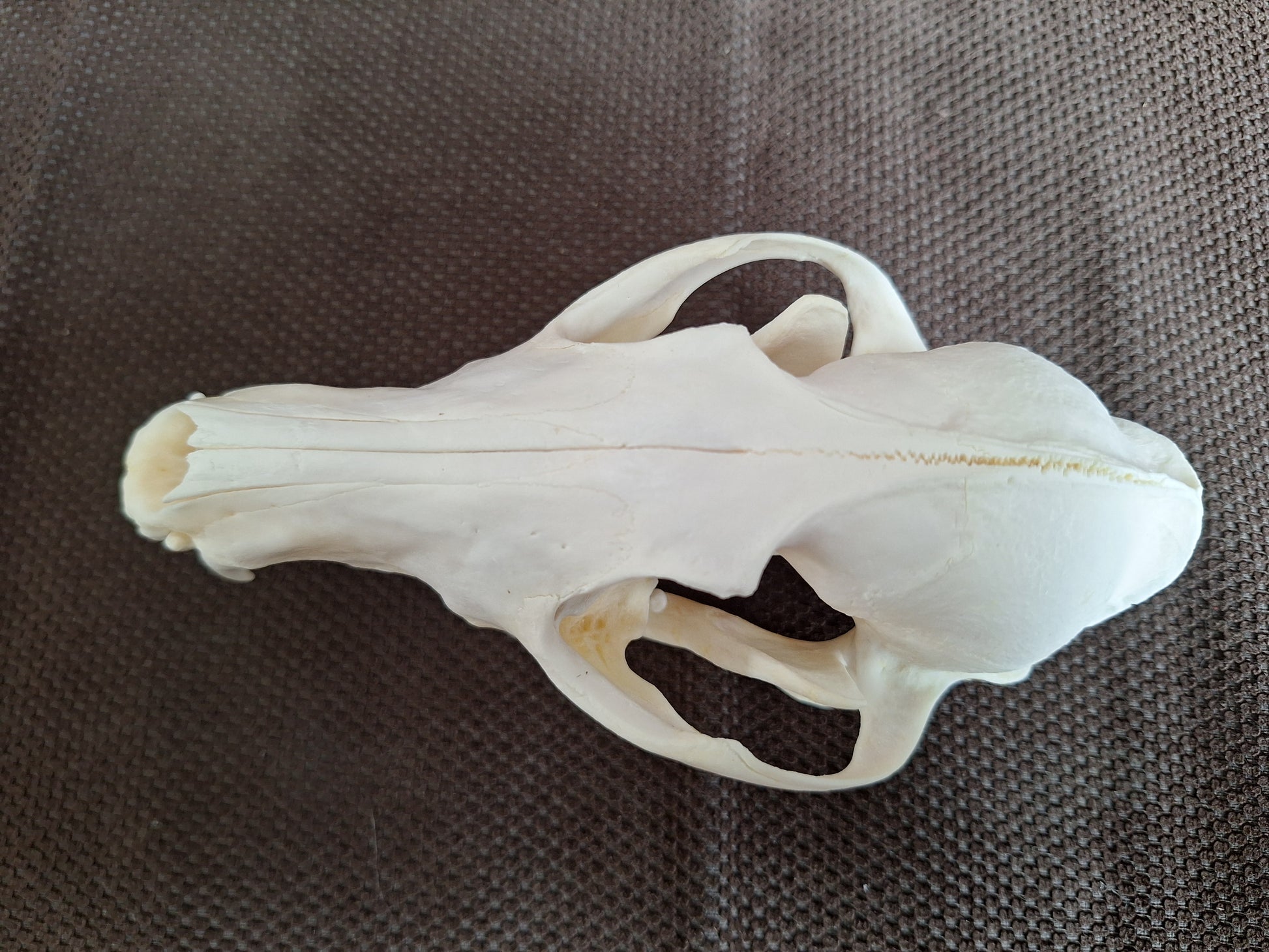 This skull is in very good condition. In the right lower jaw, one small tooth has gone missing, but the bone has grown back in this location already, indicating it happened some time ago.