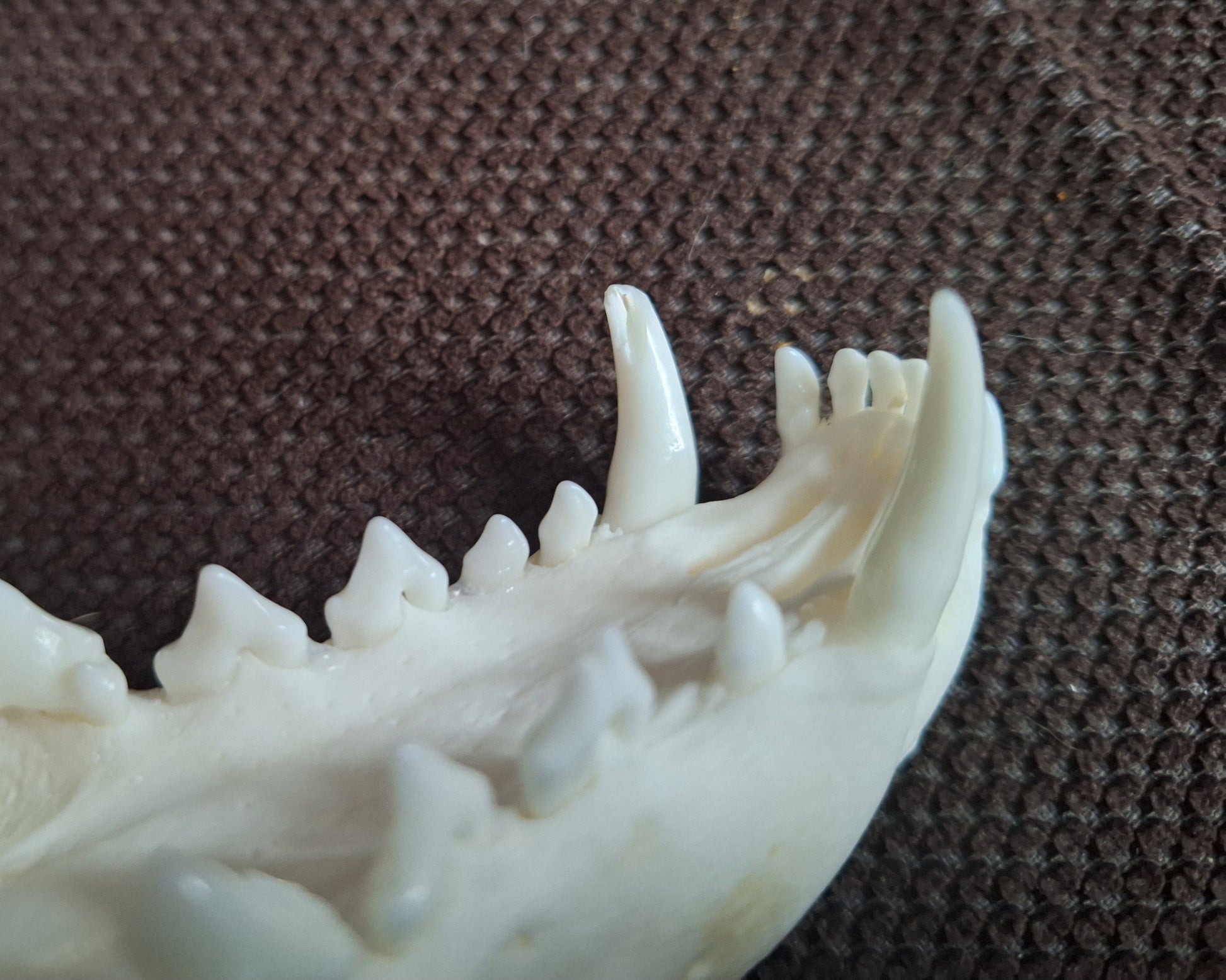 As can be seen on the last detail picture, a small chip has come off the inside of the upper right fang, but otherwise this skull is in very good condition.