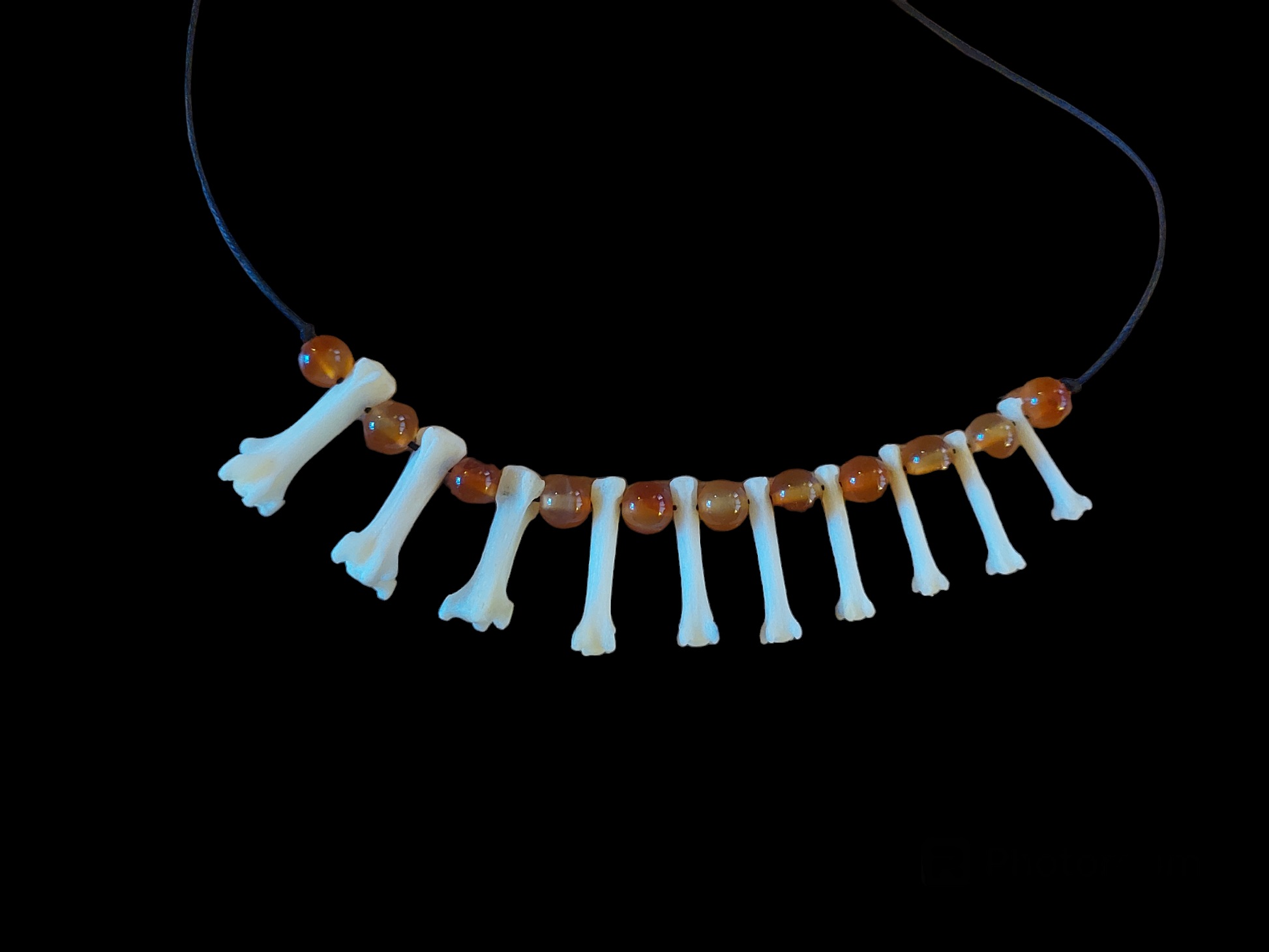 Amulet necklace made with tail bones from a dutch red fox and natural carnelian beads.