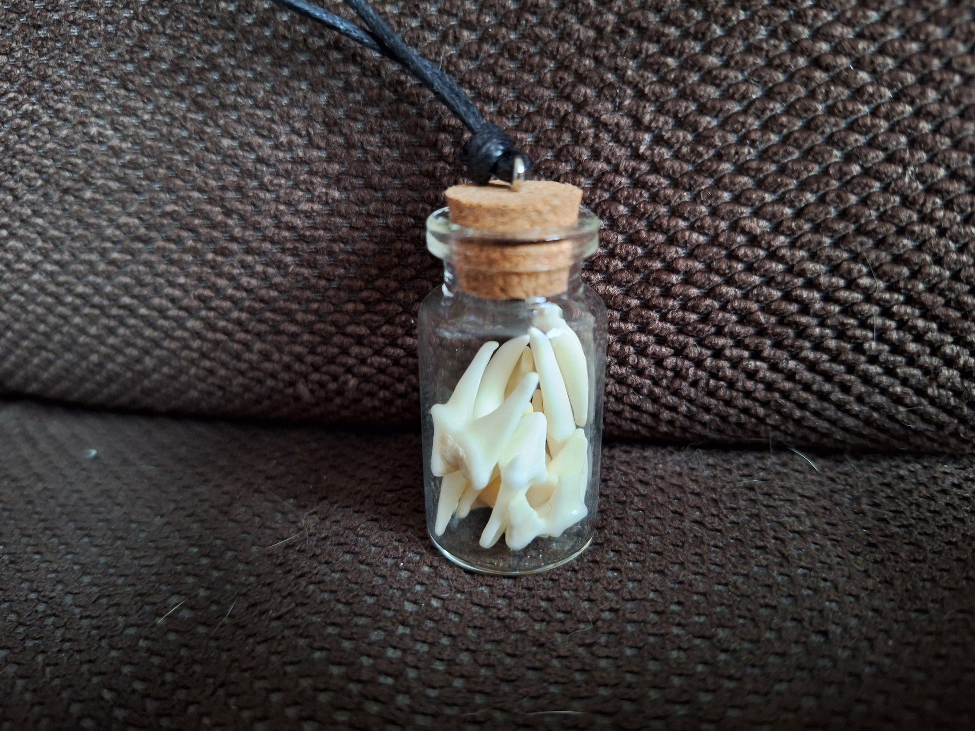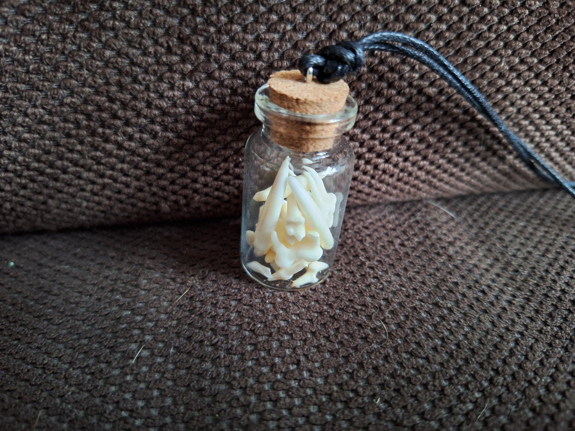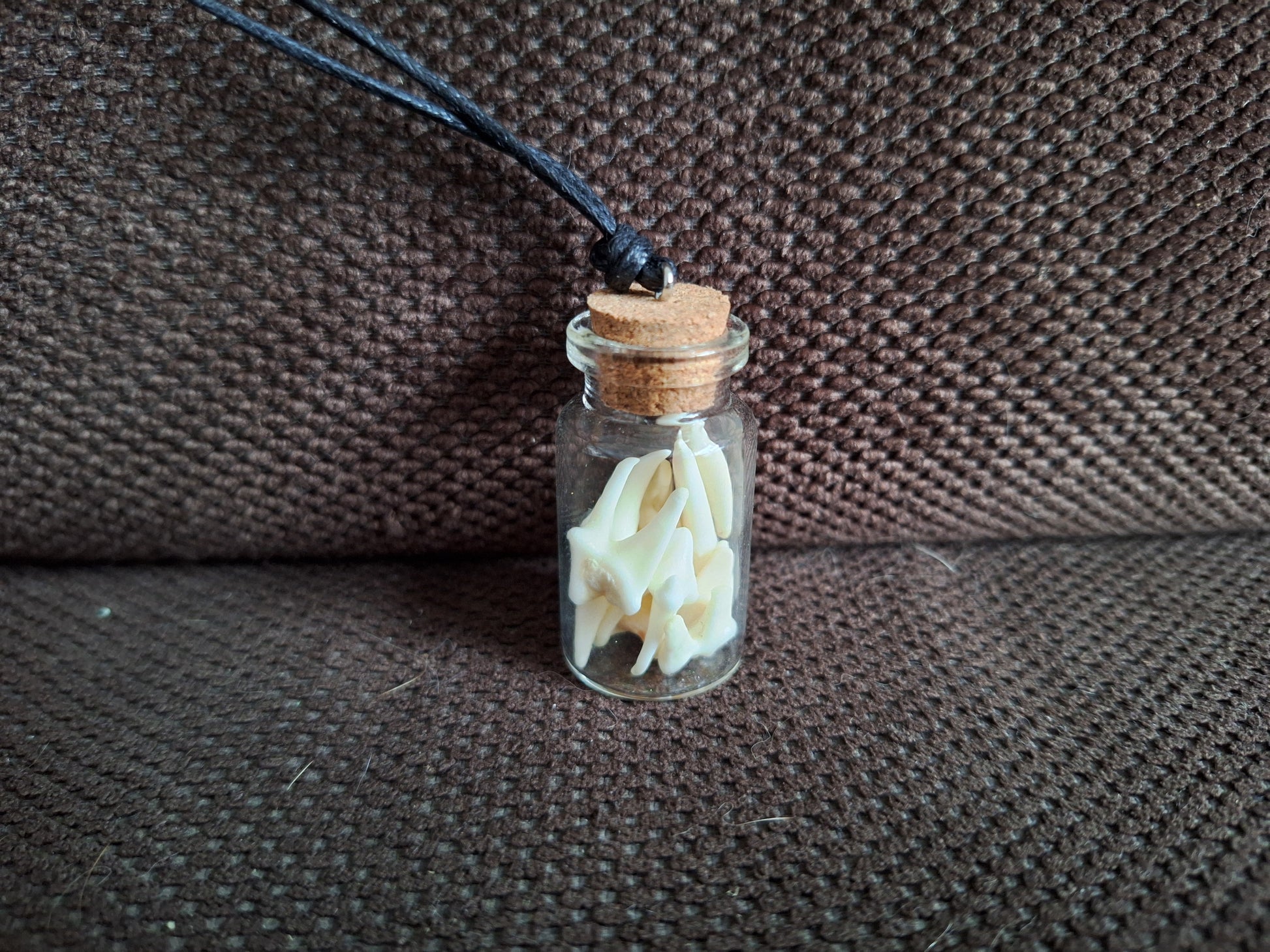 Small glass bottle (approximately 4 centimeters high) filled with some small teeth from a dutch red fox.