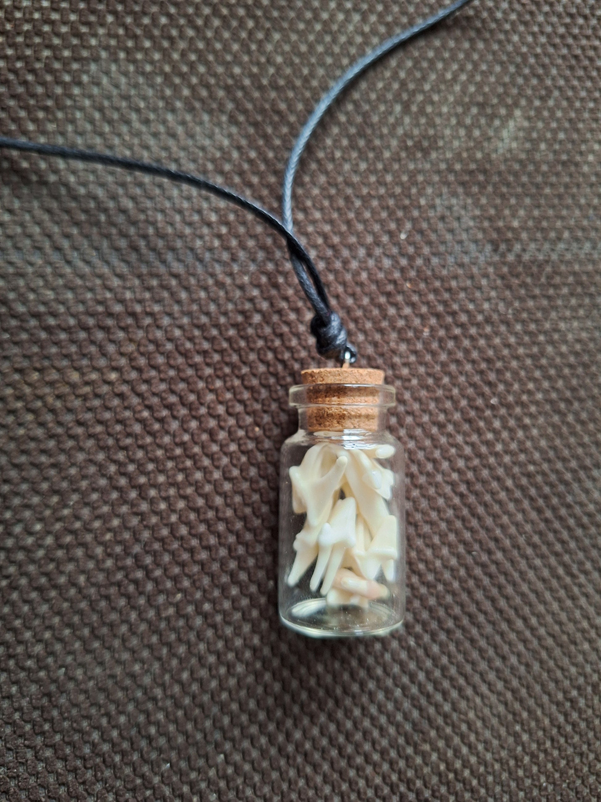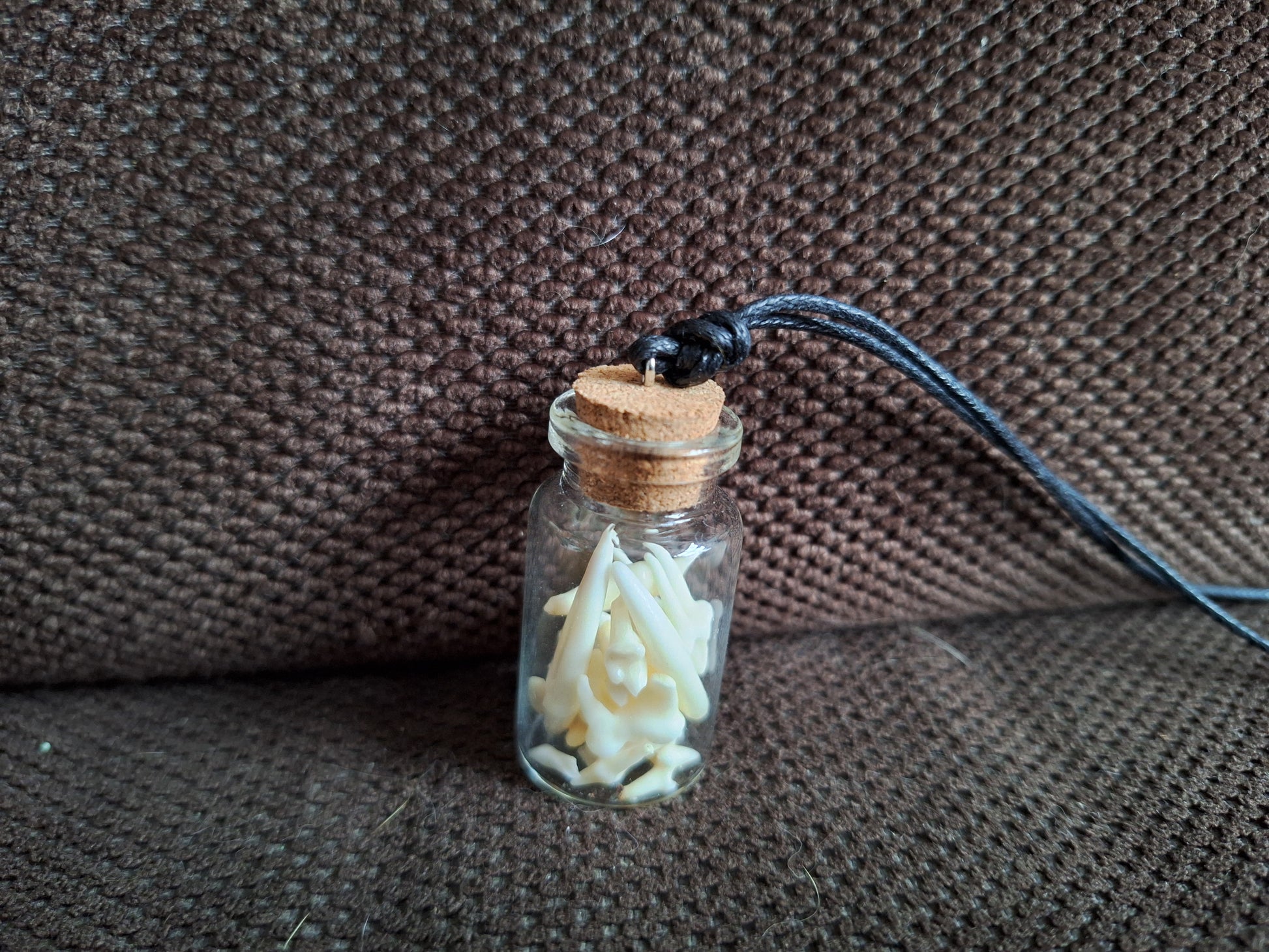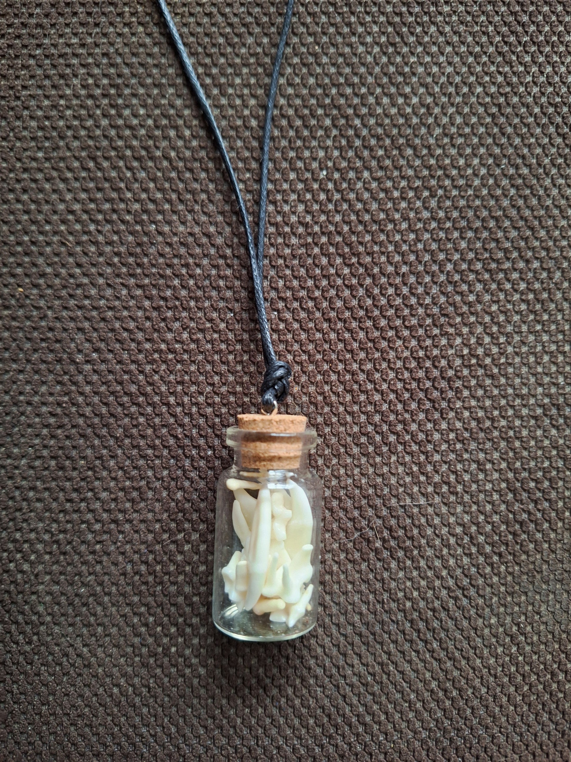 Small glass bottle (approximately 4 centimeters high) filled with some small teeth from a dutch red fox.