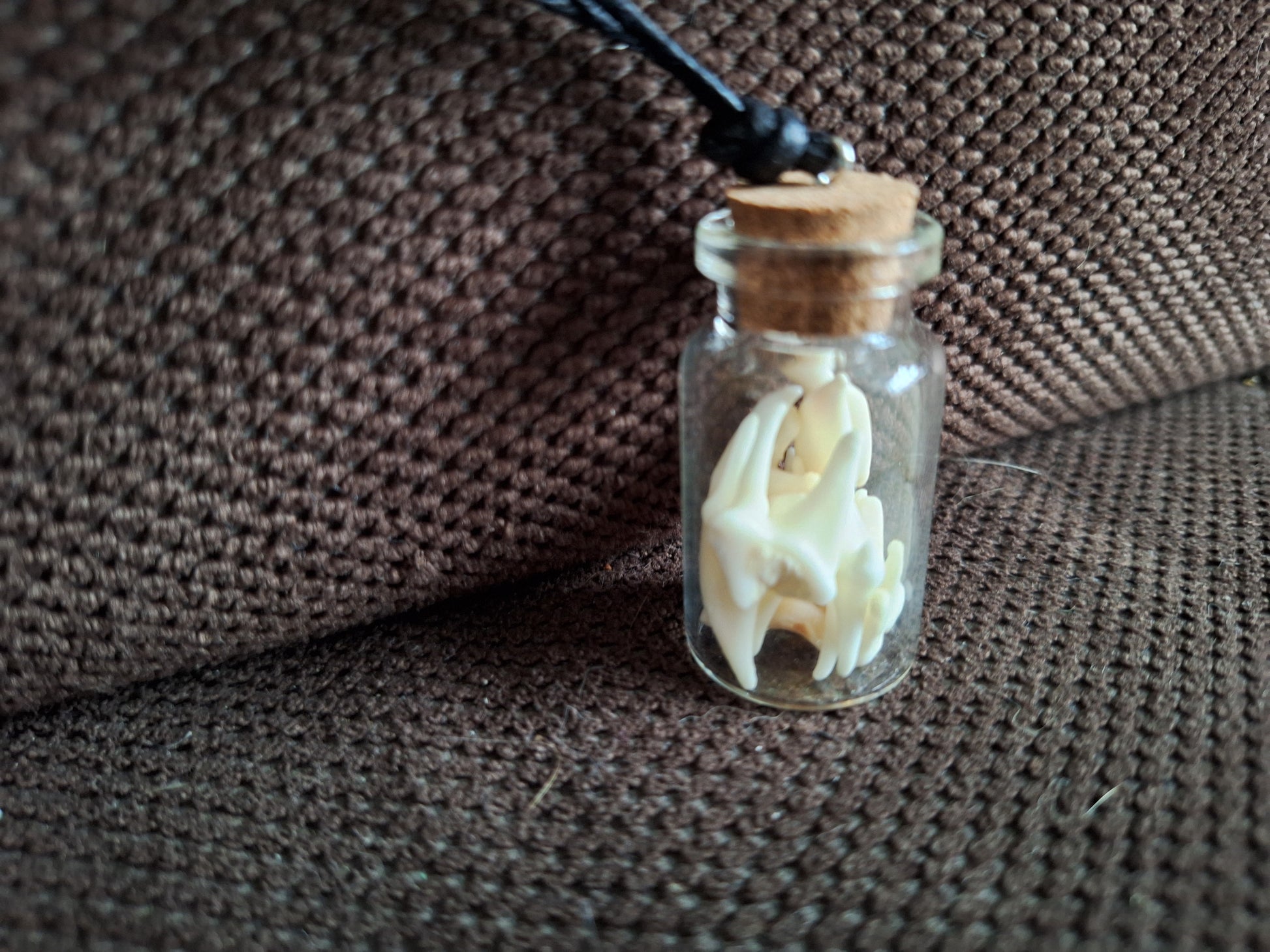 The bottle has been hung on black wax cord, which closes with a simple knot, to make it into a necklace. But of course this lovely little bottle can also be hung in your altar space or practice room, to connect you with the spirit of Fox.