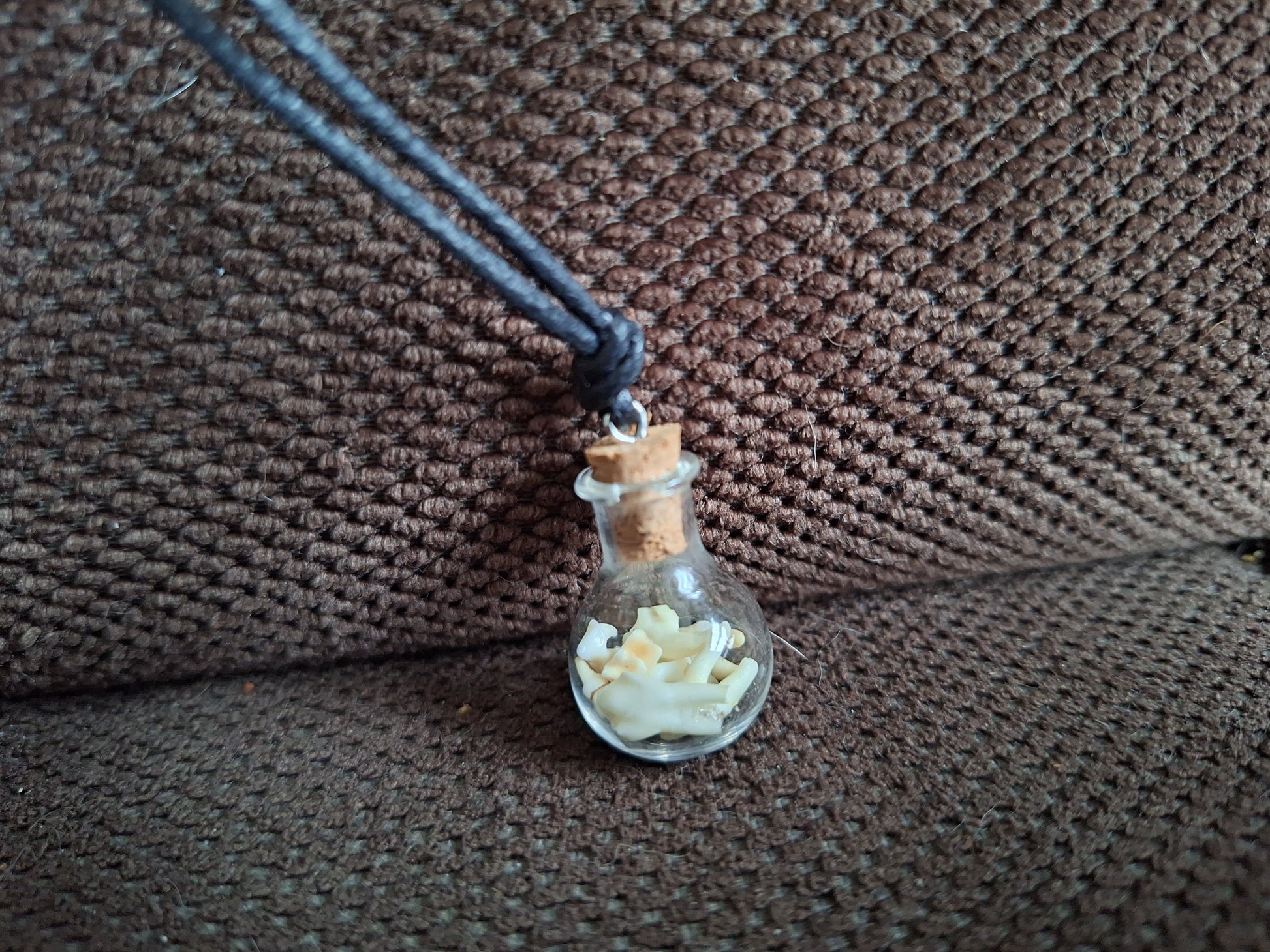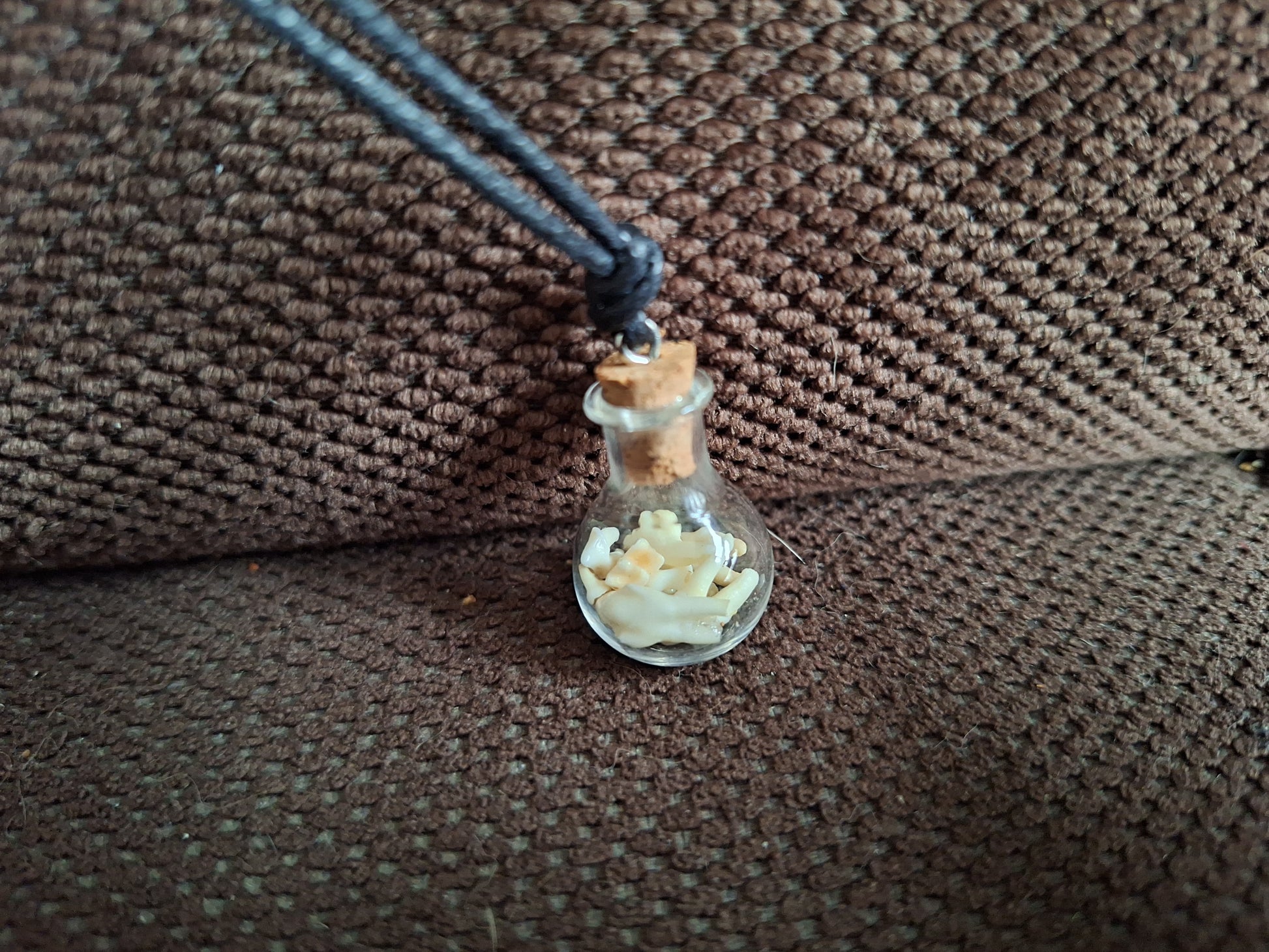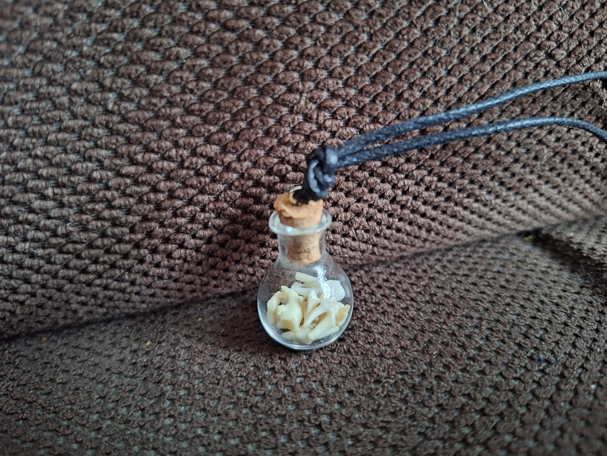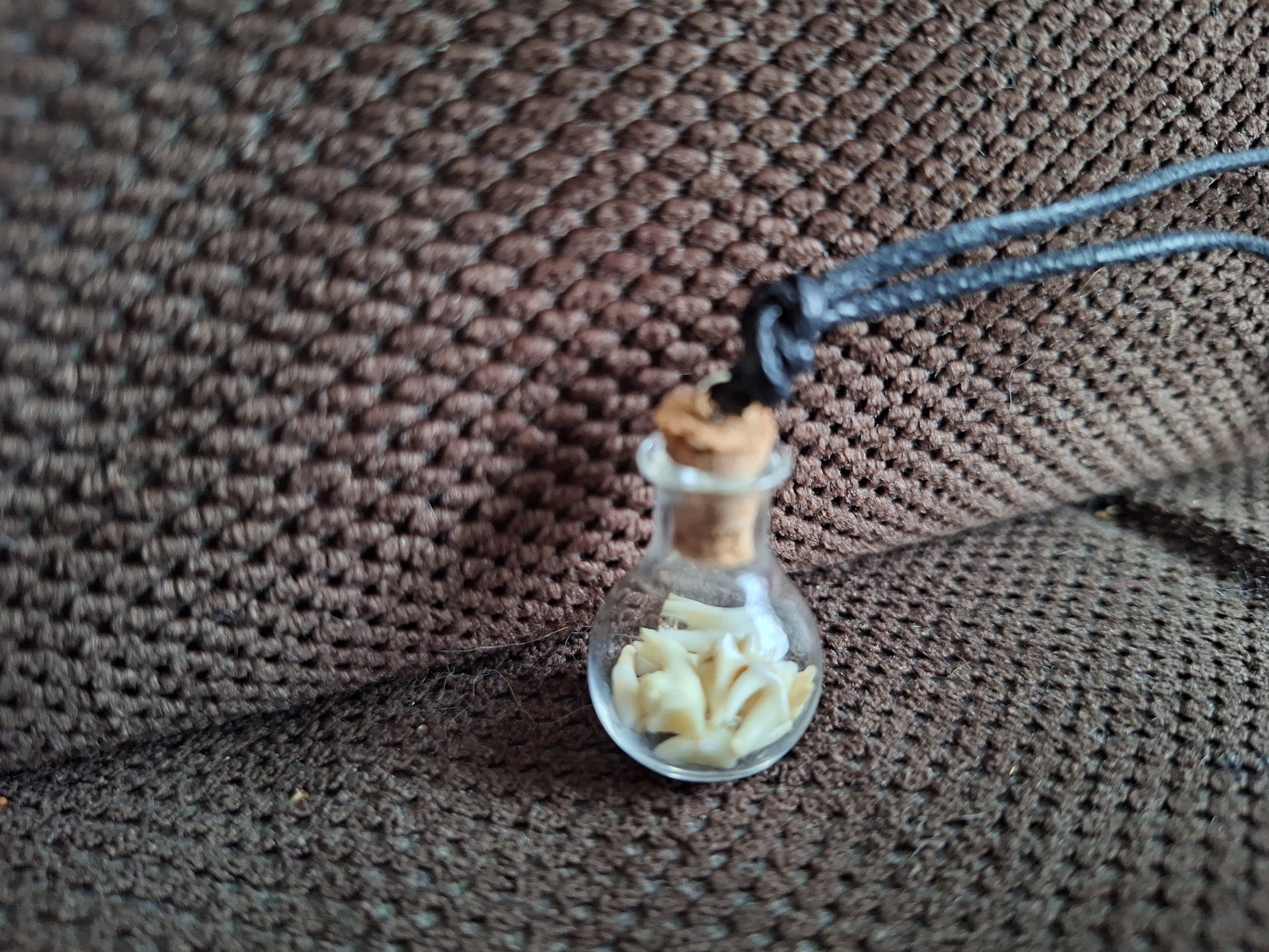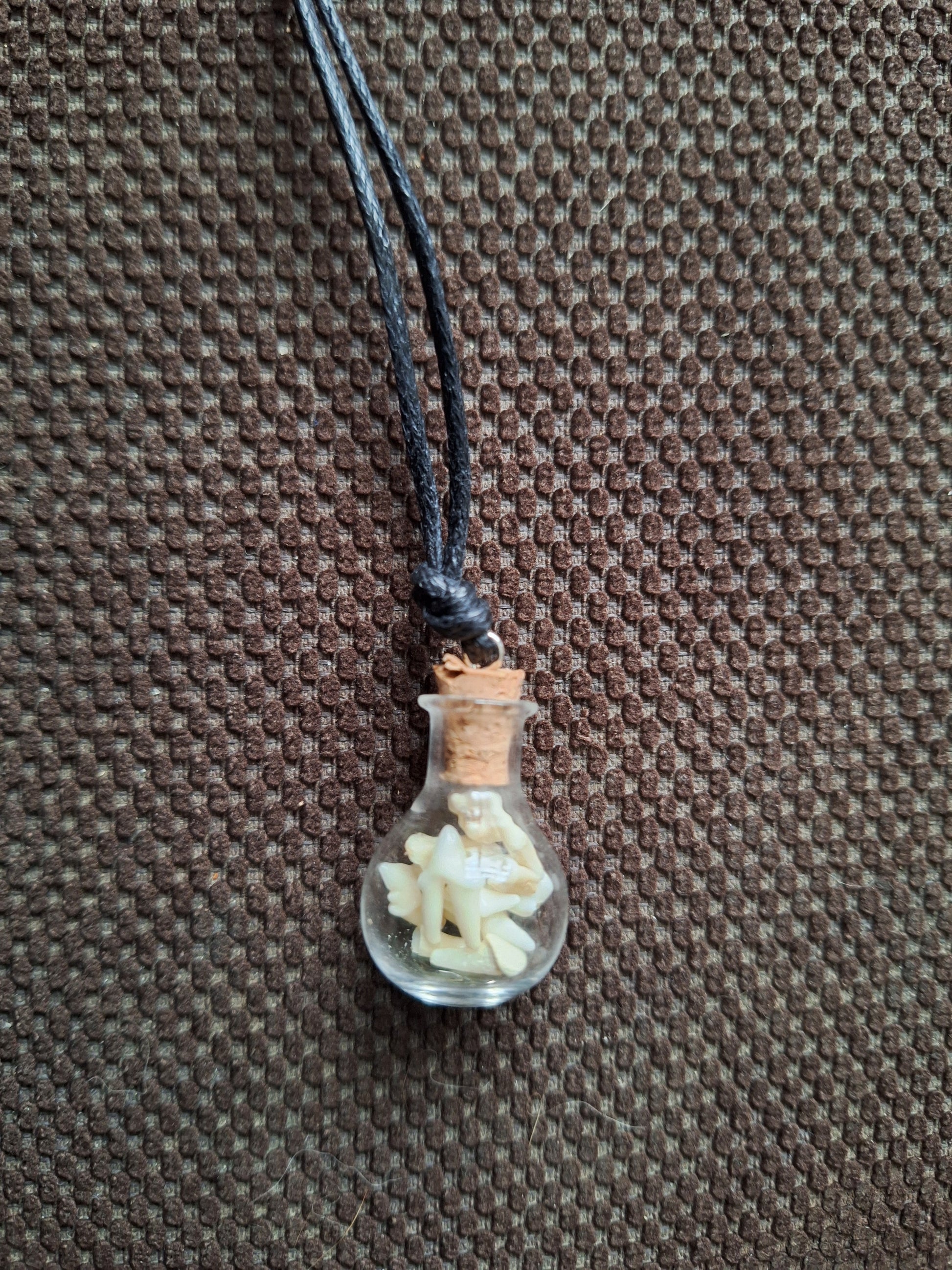 Miniature glass bottle filled with some small teeth from a dutch red fox.