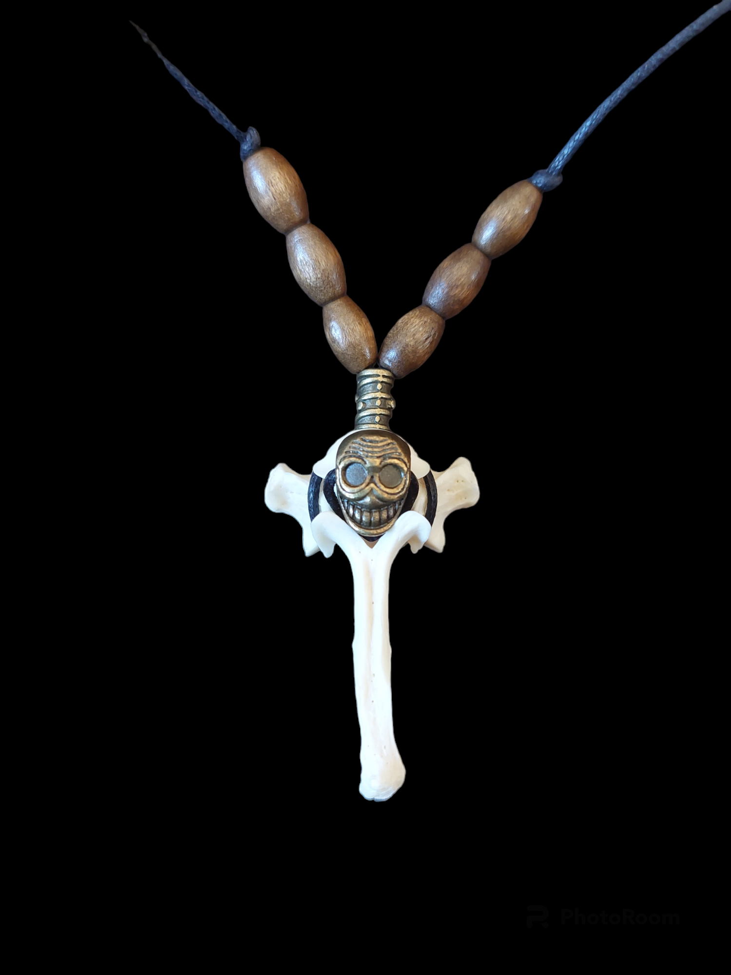 Amulet necklace made with a higher back vertebra from a dutch red fox. In front of the vertebra a bronze skull bead has been attached.
