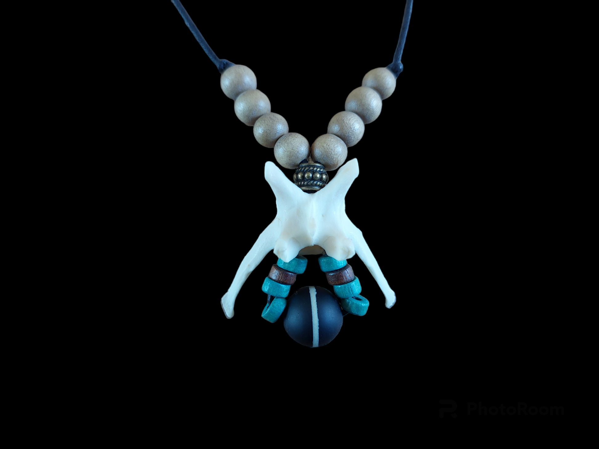 Amulet necklace made with a lower back vertebra from a dutch red fox. The black bead with white stripe underneath the vertebra is a Tibetan Medicine Dzi bead. This bead is used as an amulet to support the physical body and health in general.