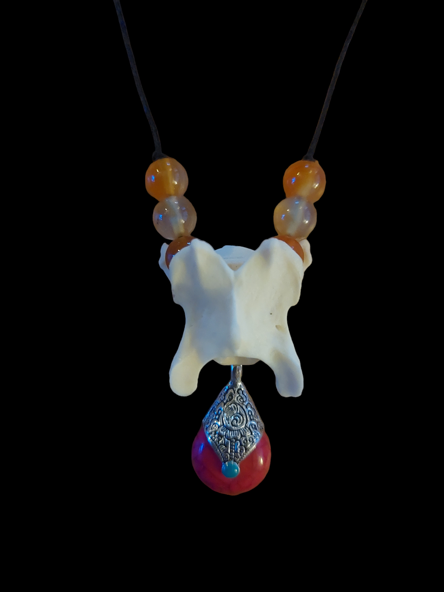 Items used in this necklace are; vertebra from a dutch red fox, natural carnelion beads, a Tibetan silver pendant with a pink howlite stone and black waxcord. Closed with a simple lobster-style jewelry clasp.