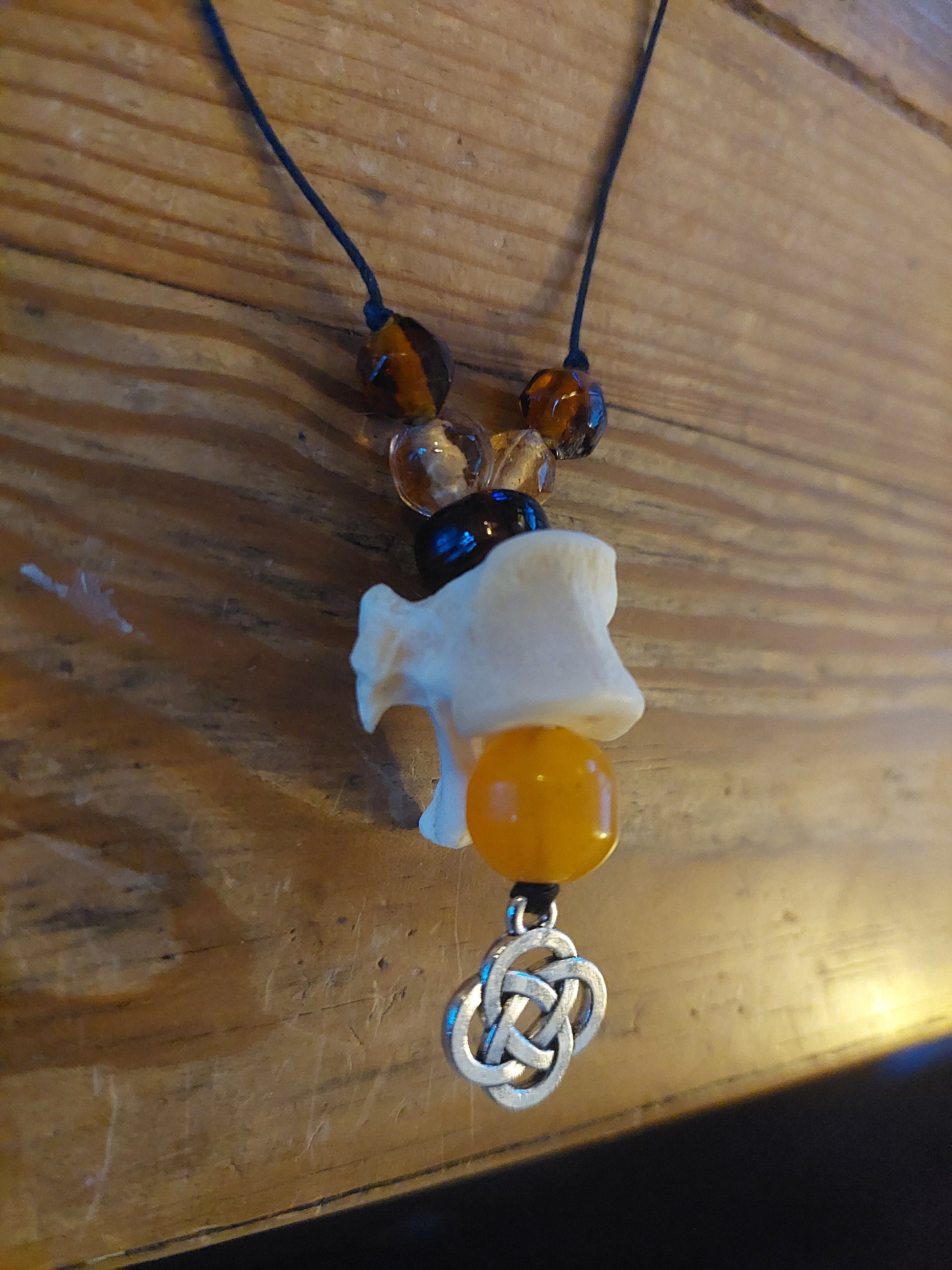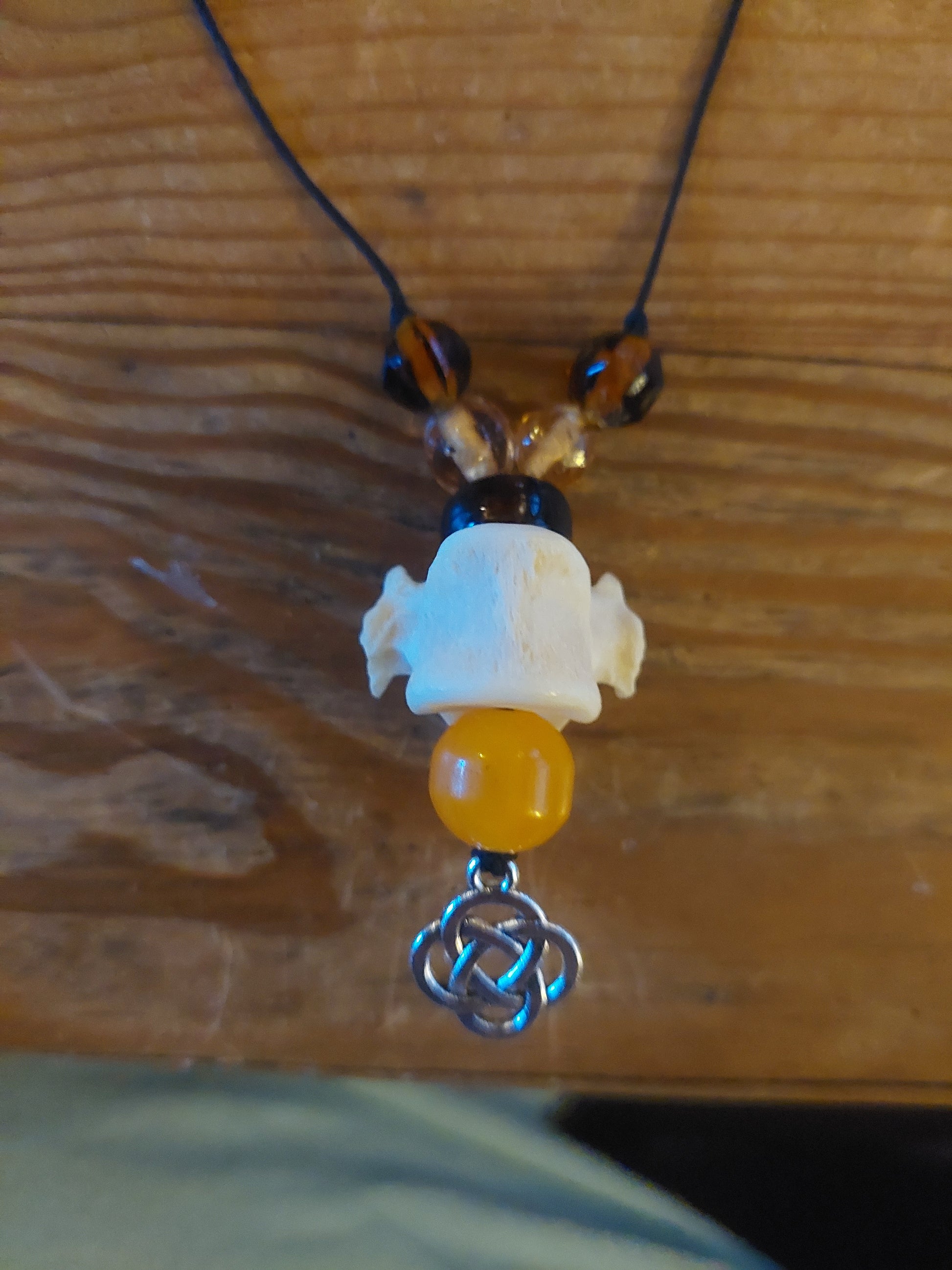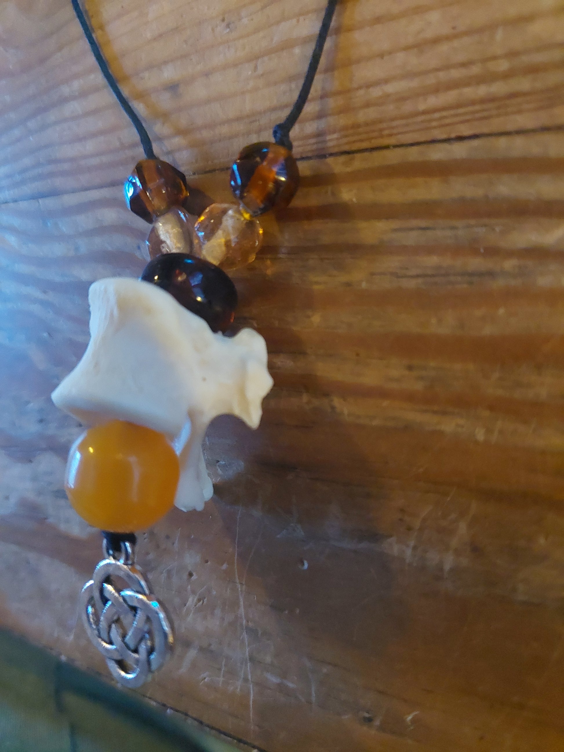 Fox vertebra with old beeswax amber bead and endless knot amulet necklace