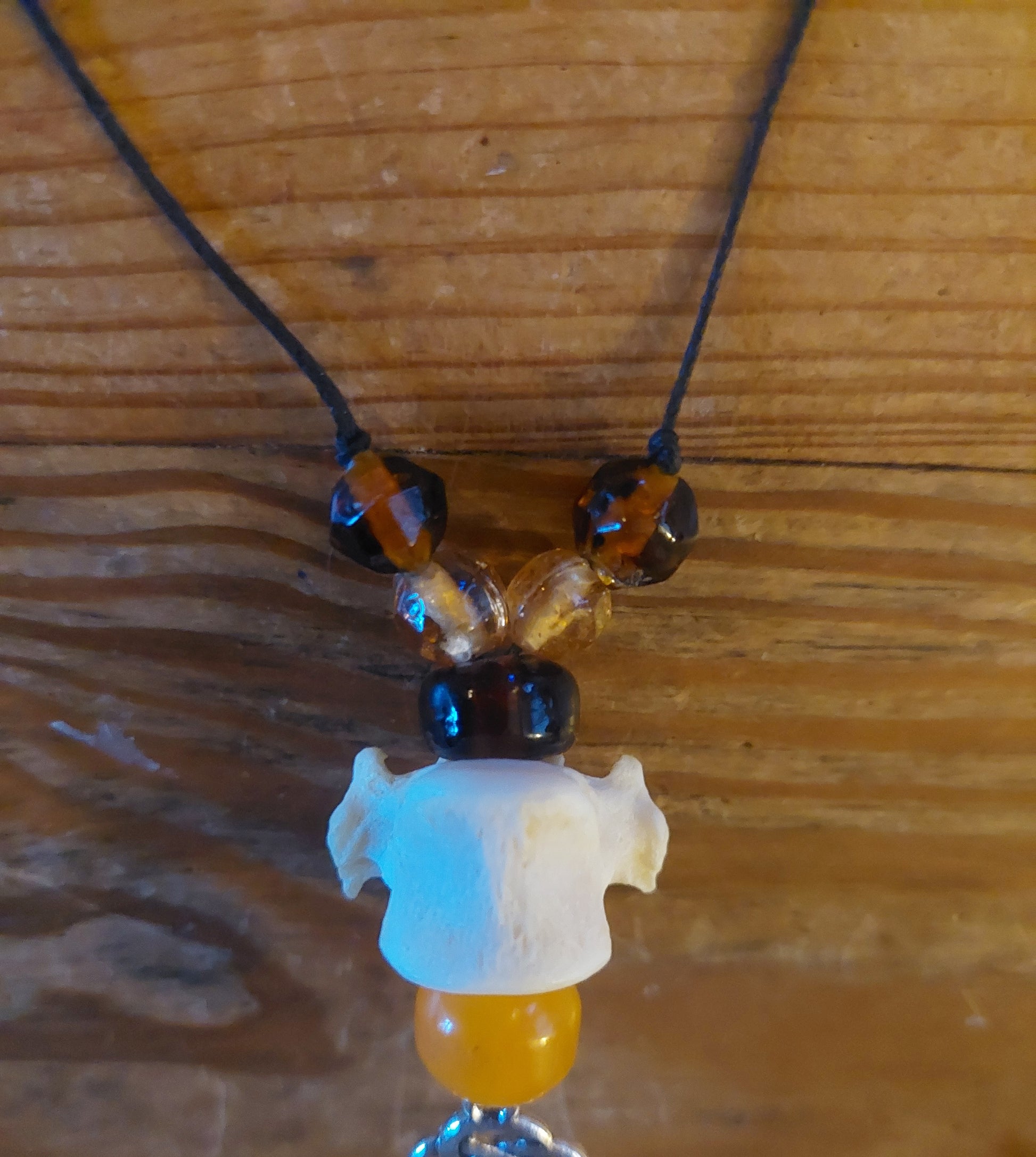 Amulet necklace made with a vertebra from a dutch red fox. The vertebra is combined with an old Tibetan bead from 'beeswax amber', a name commonly used in Asian gem markets for yellow (often Baltic) amber with a semi-translucent, opalescent, milky and somewhat greasy appearance.