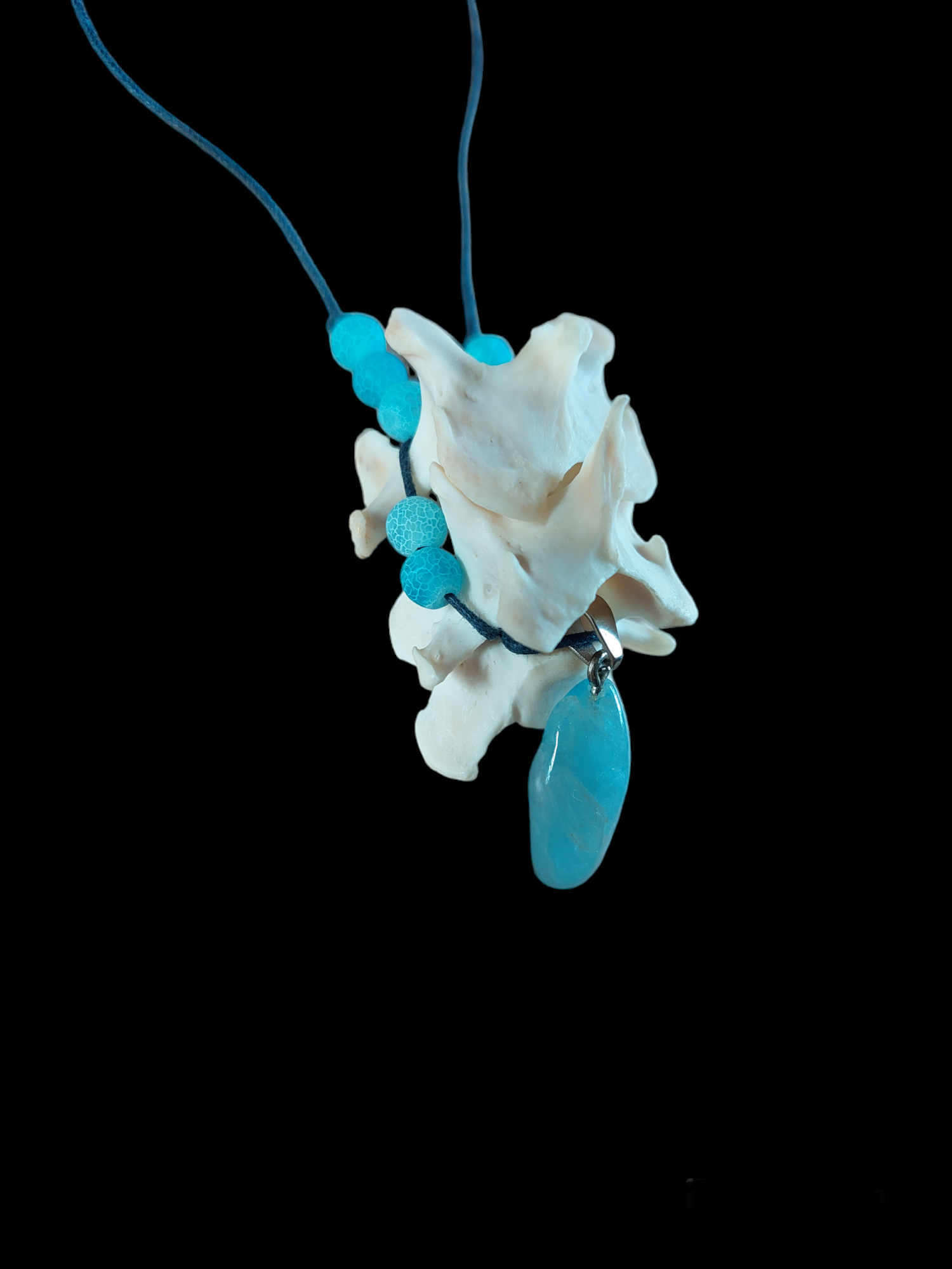 Amulet necklace made with two cervical vertebrae from a dutch red fox. Underneath the vertebrae hangs an aquamarine gemstone pendant. This pendant is from vintage origin and has been given a second life in this amulet necklace. In this amulet the vertebrae from the fox's throat-area have been intentionally combined with a blue gemstone pendant, making it a powerful combination to support your throat chakra.