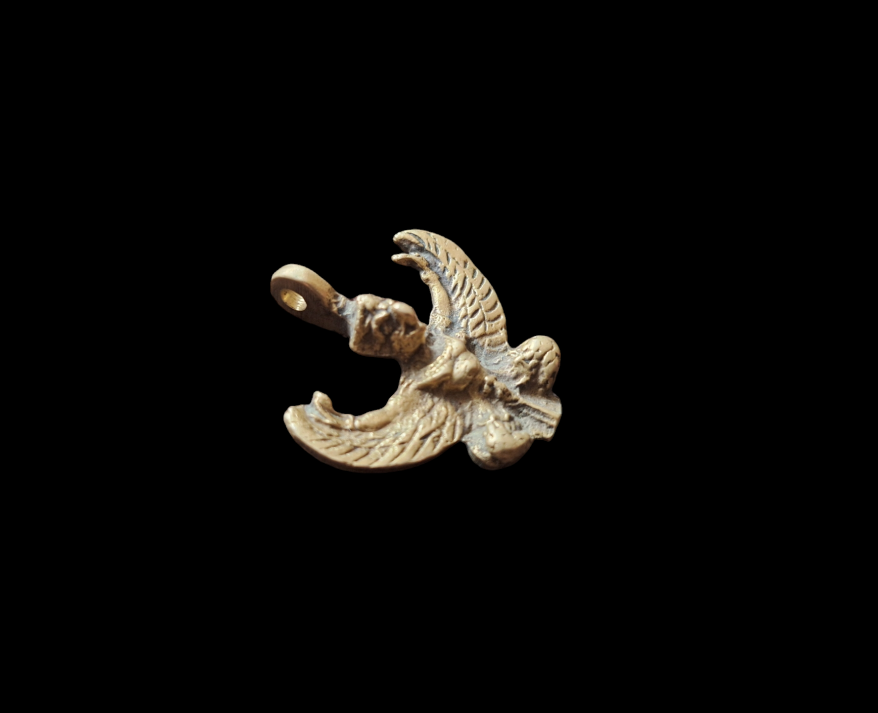 This Garuda pendant comes from Nepal and is made of brass. It is from vintage origin, so might therefore show some signs of age and previous usage. Size is approximately 35 millimeters high (including the eyelet) and 35 millimeters wide. It weighs 10 grams.