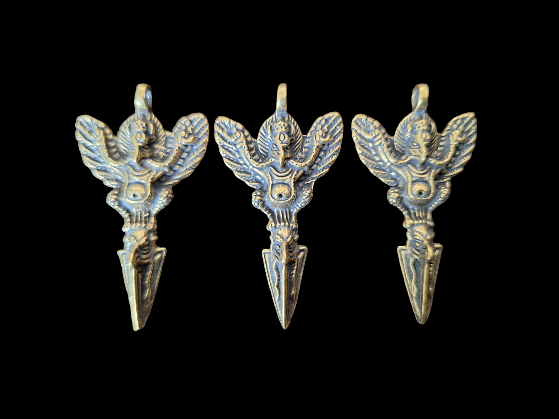 In this pendant, Garuda sits on top of a phurba; the ritual triangular knife common in vast territories of Asia. The use of the phurba for diverse ritual and protective purposes can be dated back at least 3500 years. Read more about the general and specific design and symbolism of the phurba in the general description of the webshop-collection "Ritual Attributes; Phurba's".
