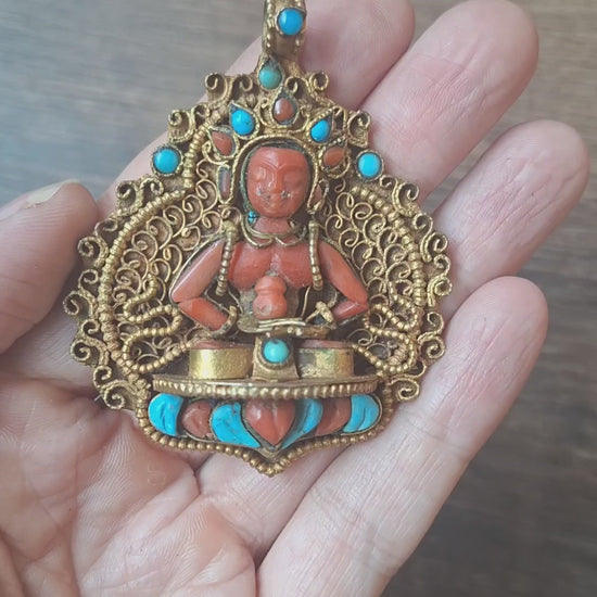 Gilded copper, coral and turquoise pendant Amitabha Buddha