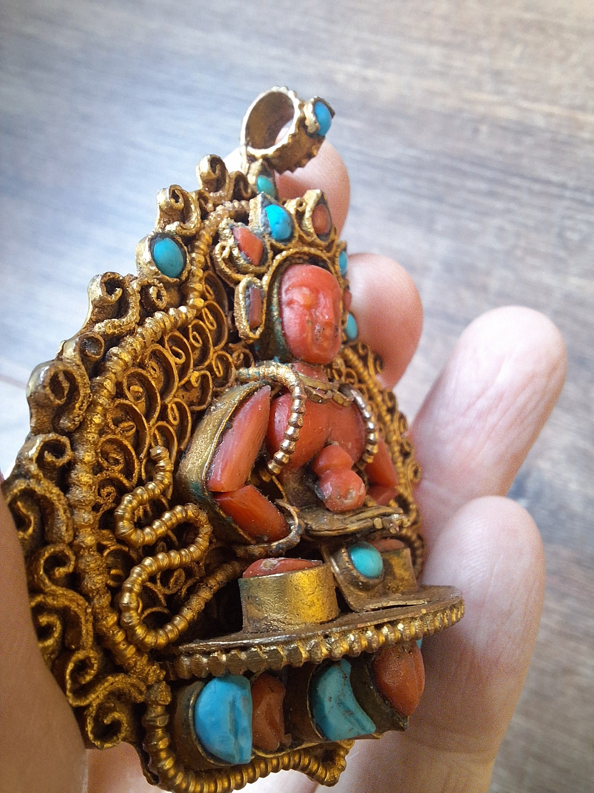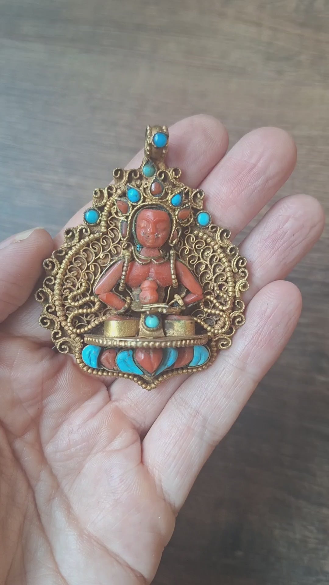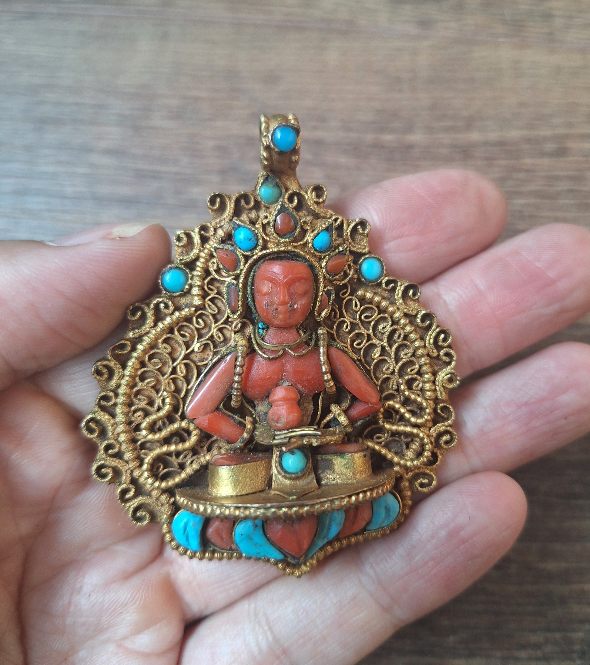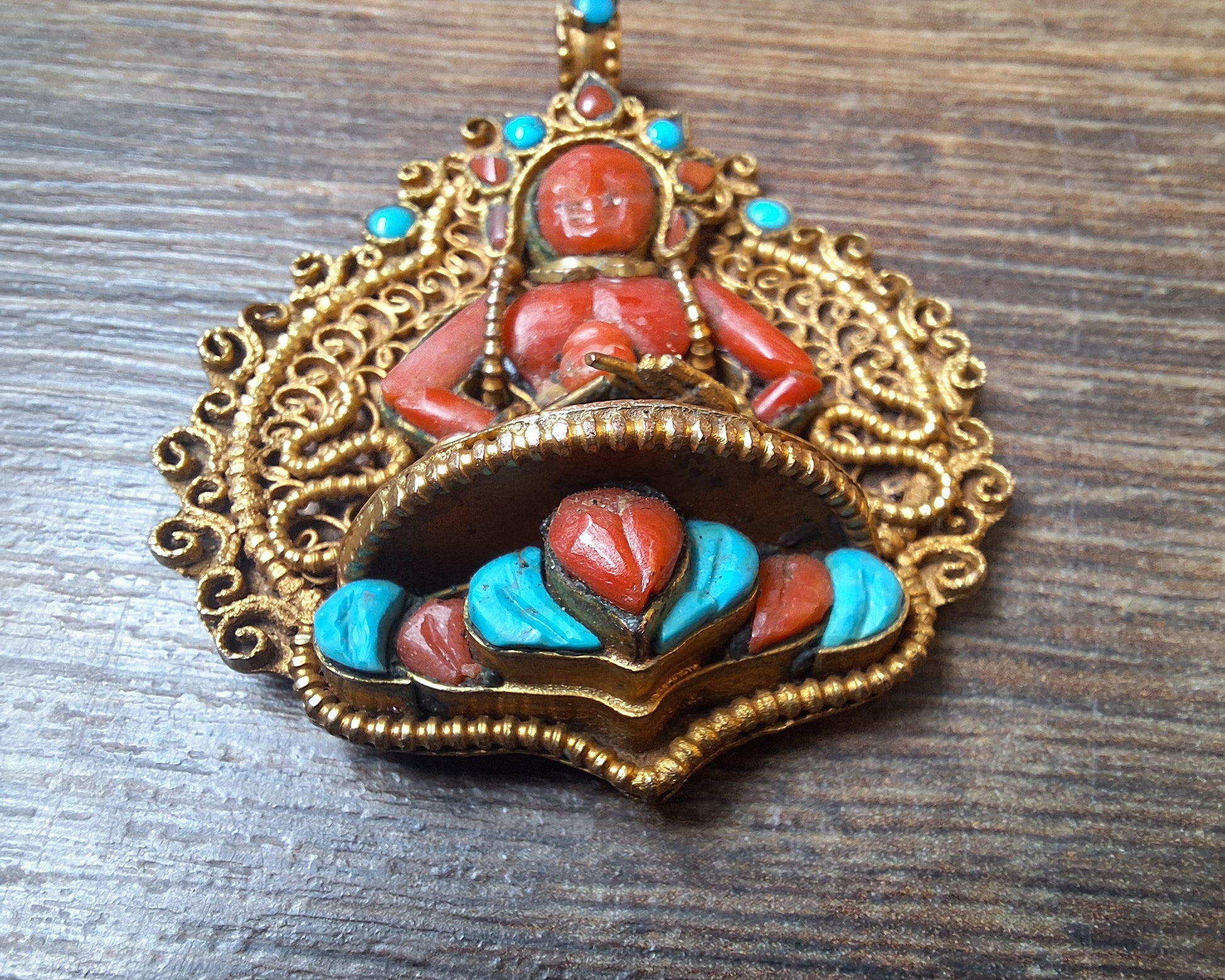 Very beautiful gilded copper filigree pendant with the depiction of Amitabha Buddha, handcarved in (real) coral and turquoise. The style in which the pendant is representative for the Newari tribe and is an excellent example of artisan Himalayan craftmanship.