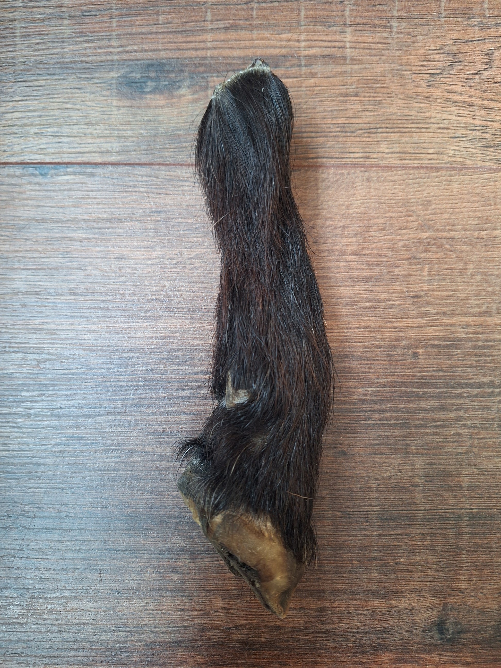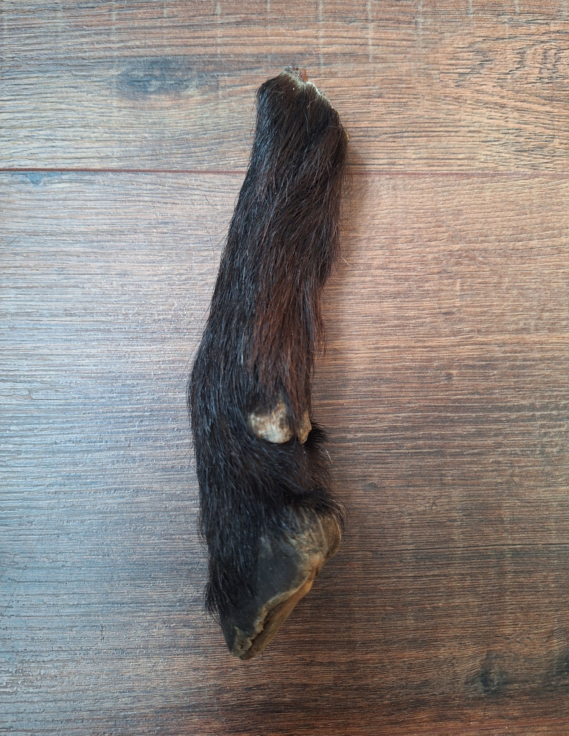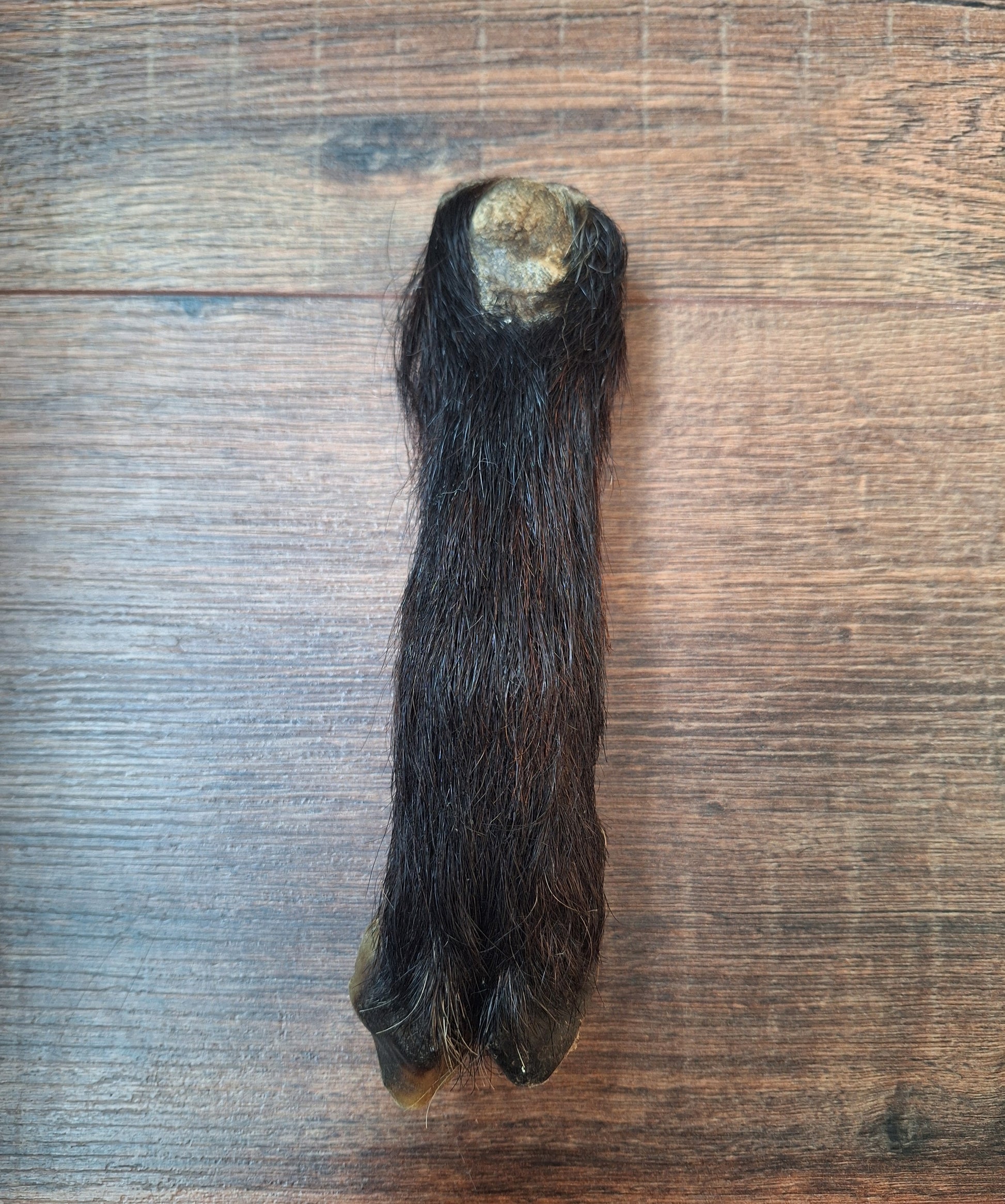 Prepared lower leg from a large sized domestic goat, farm held animal, died of natural causes. Complete lower leg preparation, including the bones, hooves etc. A nice item for all kinds of ritual, crafting or decorational purposes.