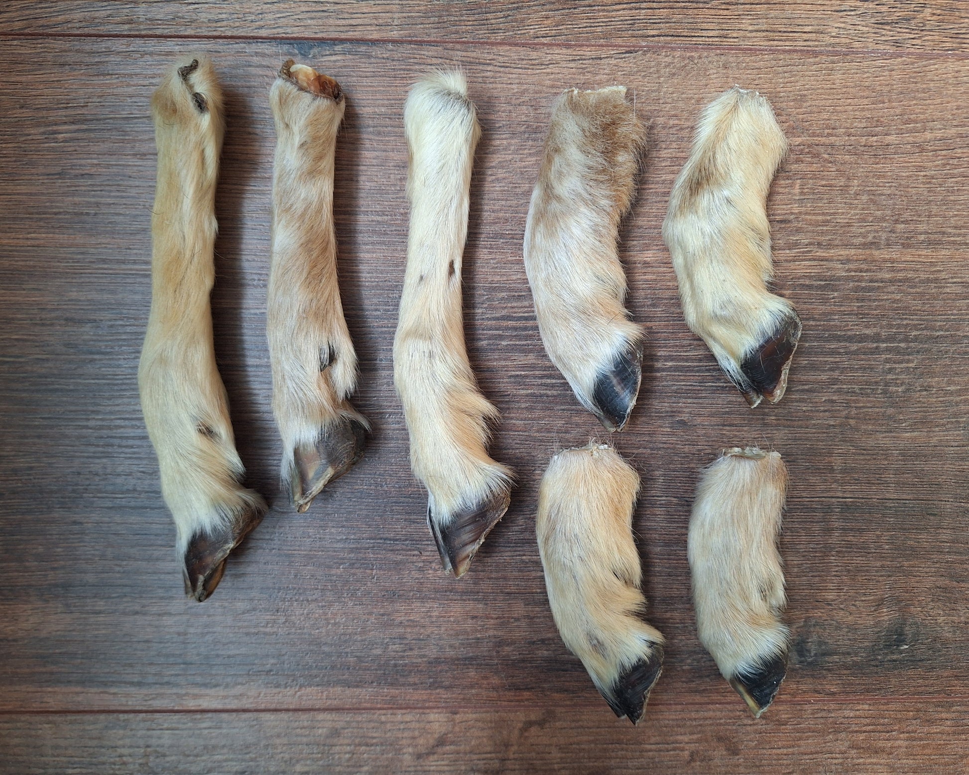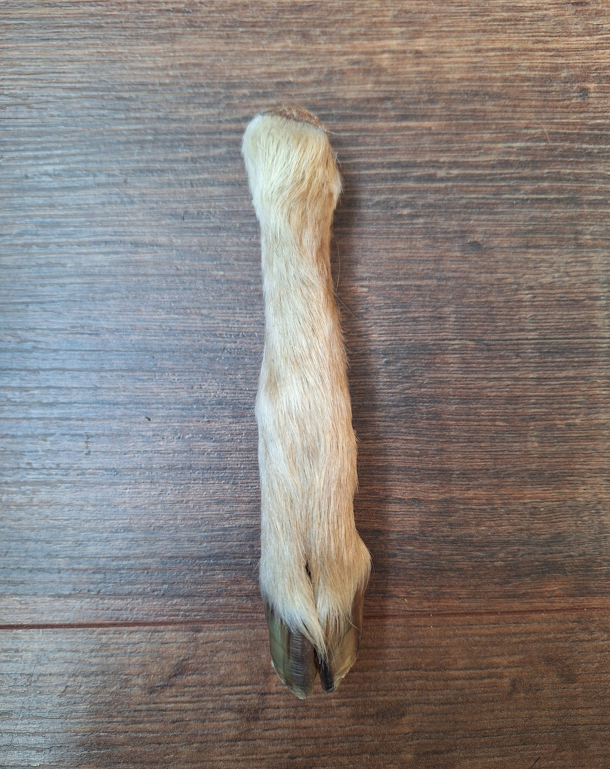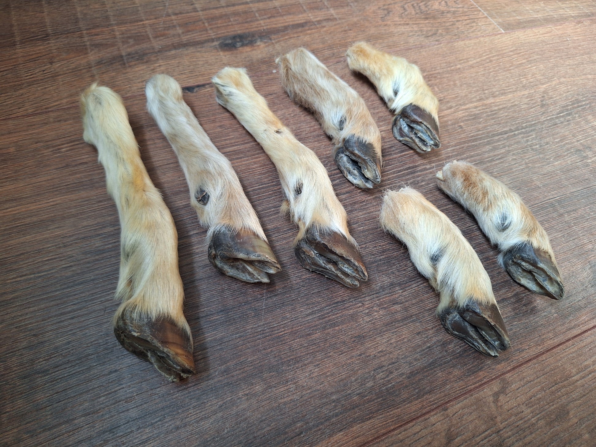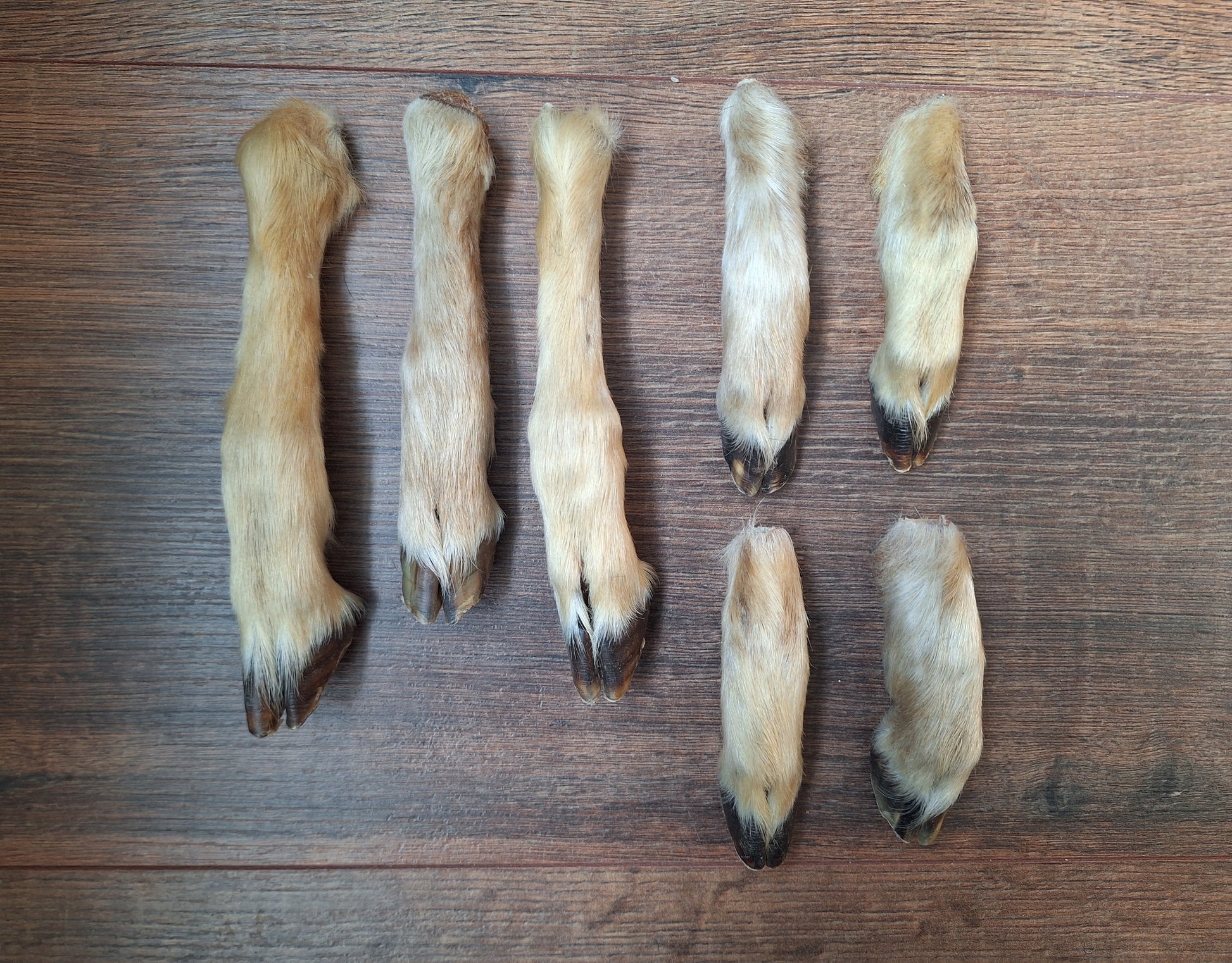 Prepared lower legs from domestic goats, petting zoo animals, died of natural causes. These preparations consist of complete lower legs, including the bones and hooves etc. Nice items for all kinds of personal ritual or crafting purposes.
