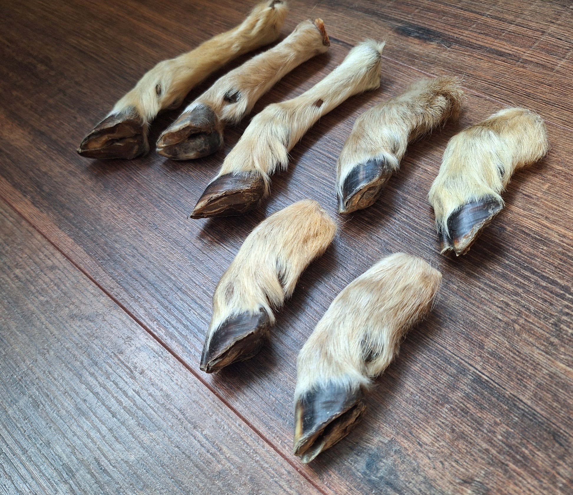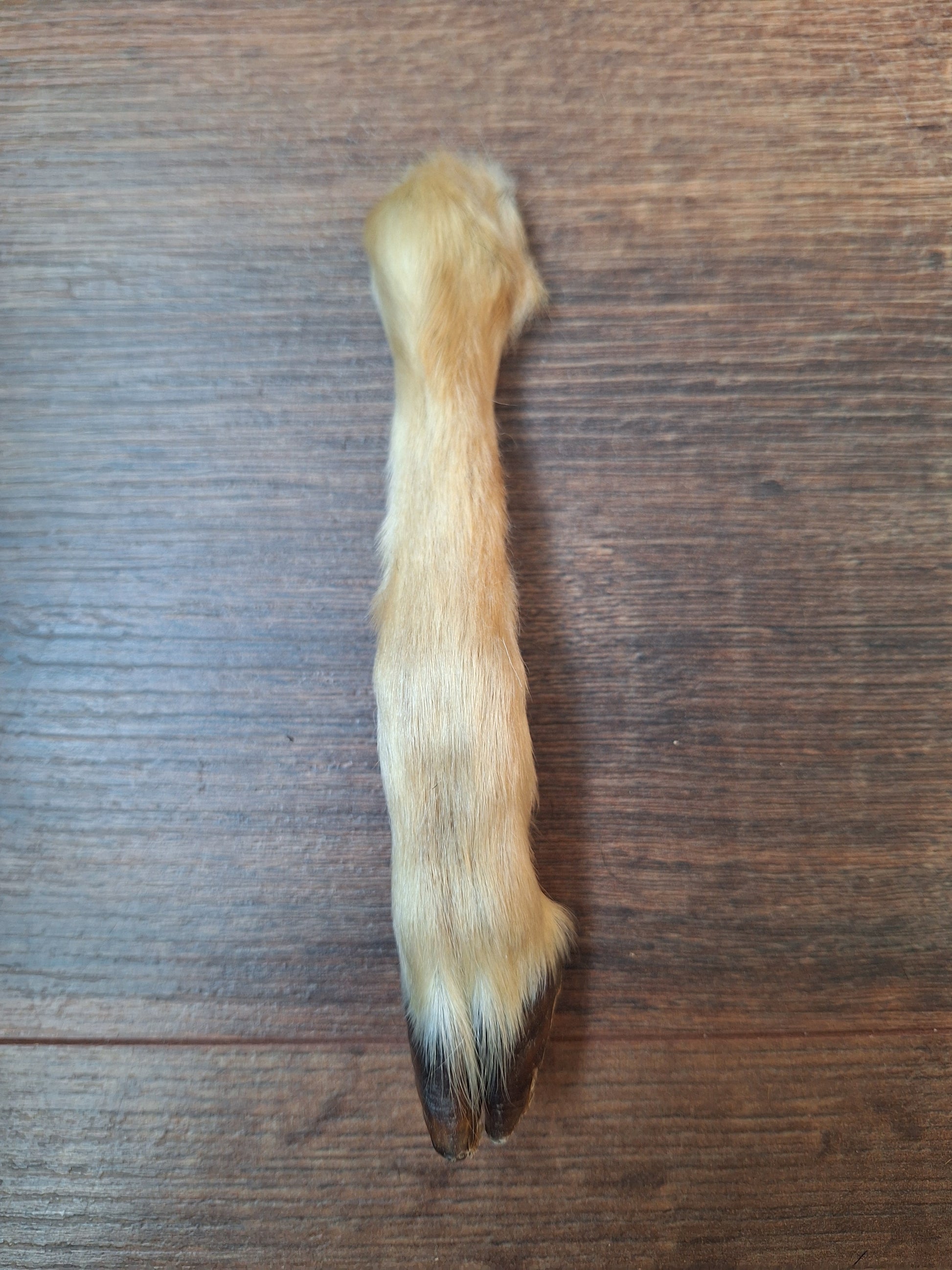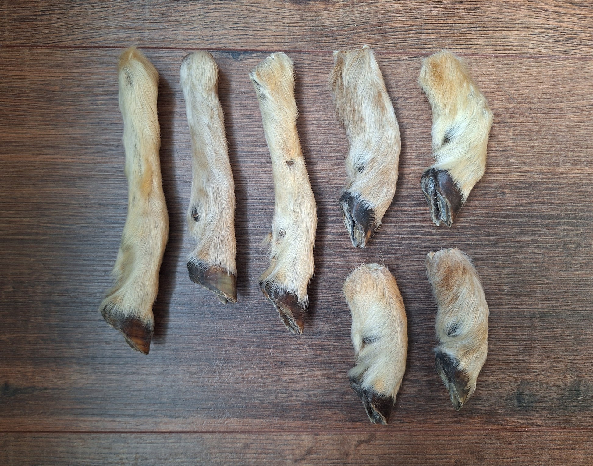 Prepared lower legs from domestic goats, petting zoo animals, died of natural causes. These preparations consist of complete lower legs, including the bones and hooves etc. Nice items for all kinds of personal ritual or crafting purposes.