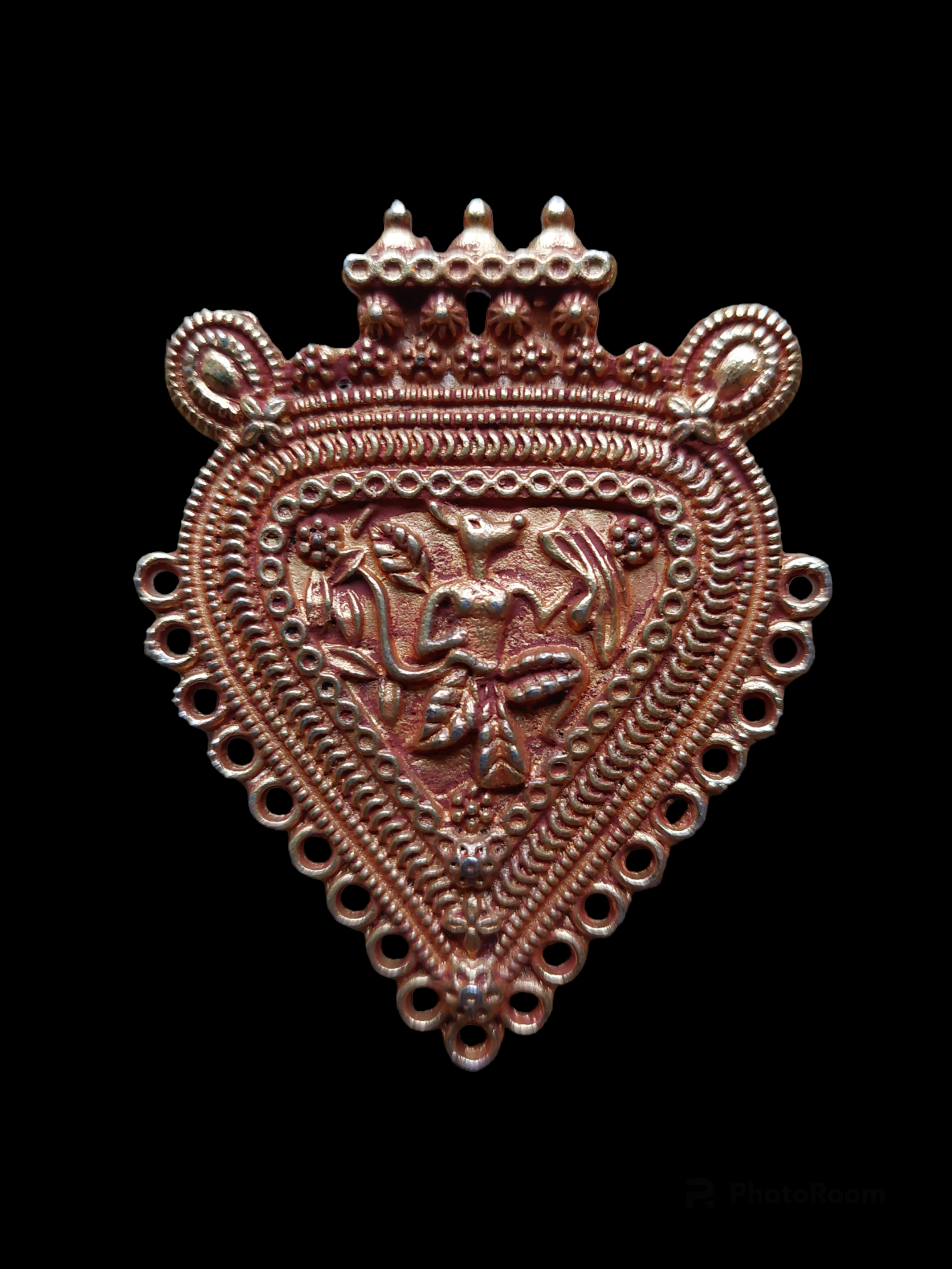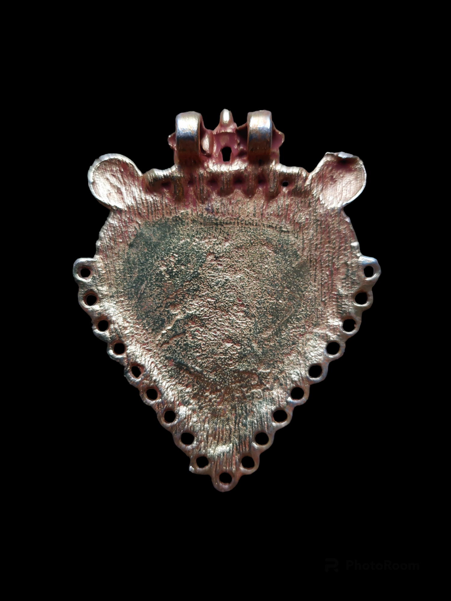 This pendant has a zinc-alloy base, which has been oxidated into a red-gold color. This pendant has been made in the Indian province of Rajasthan, a region well-known for its high quality jewelry makers.