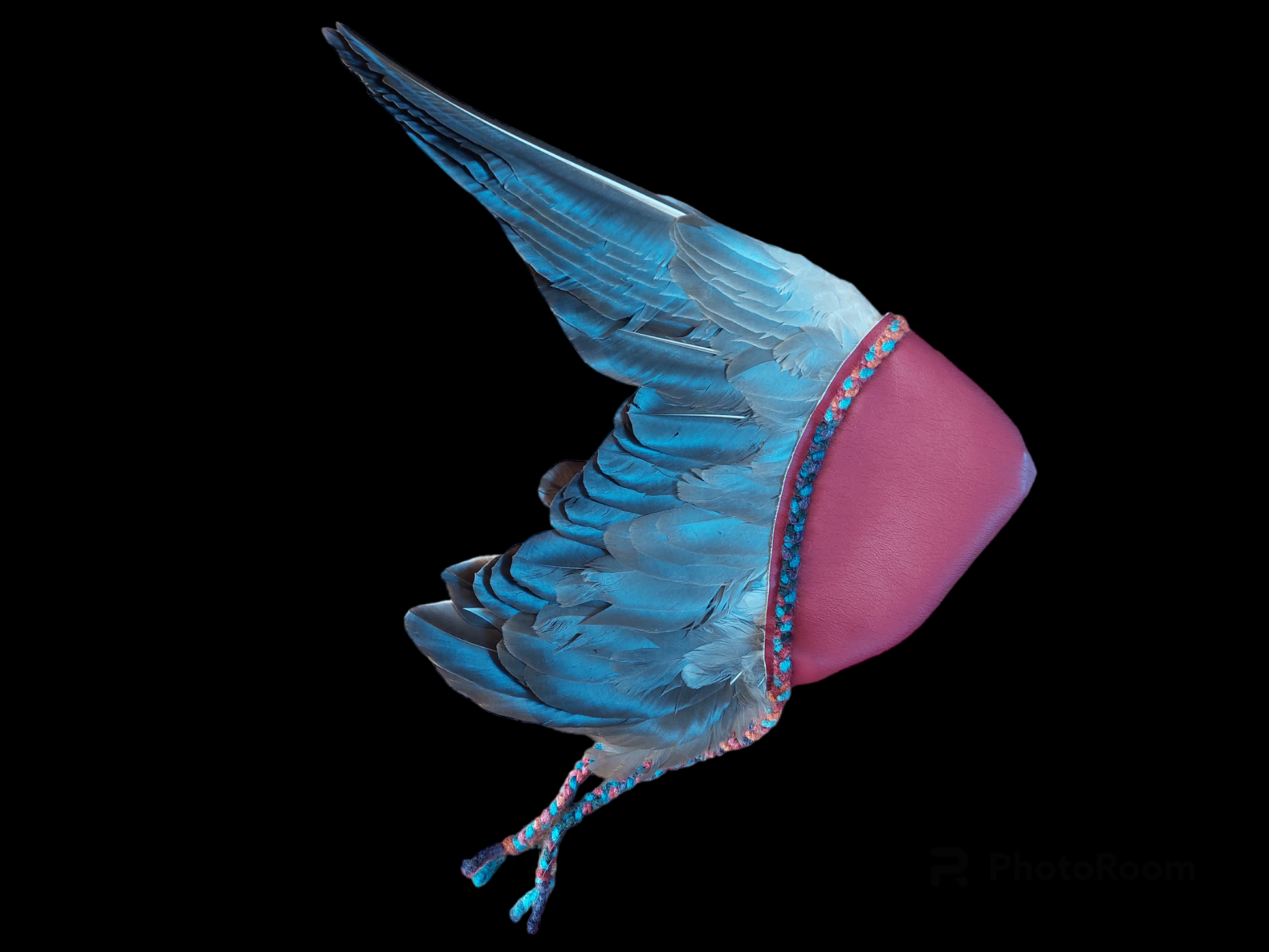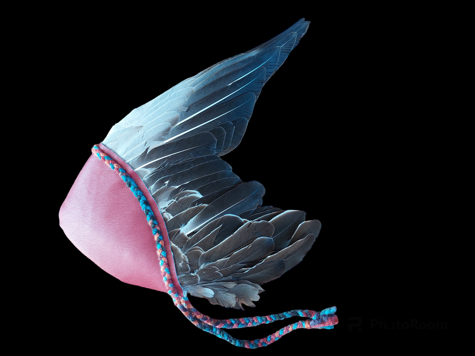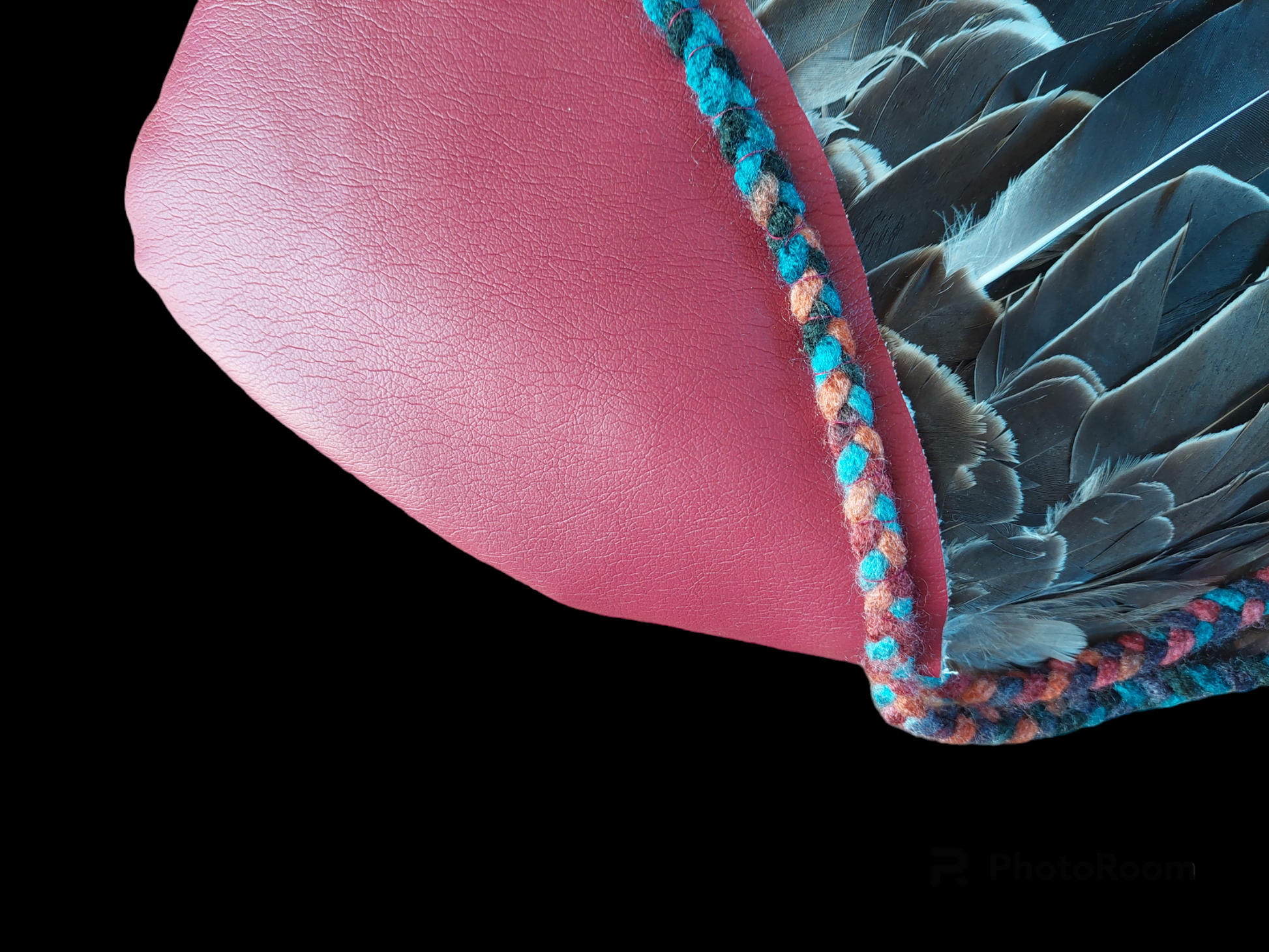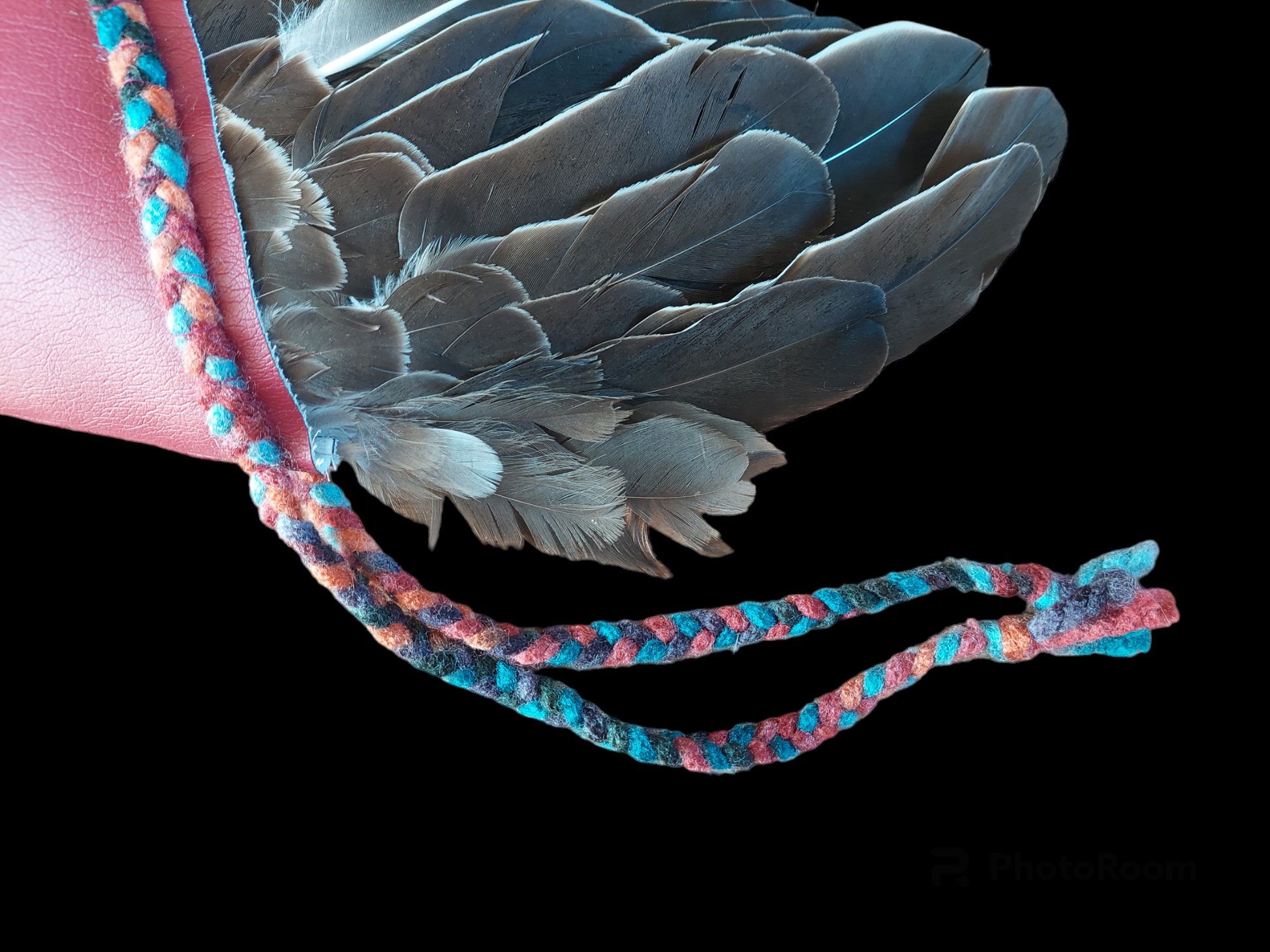 The wing has been handsewn into a sleeve of burgundy red faux leather and decorated with a braid made with 3 strands of acrylic wool in colors changing from blue to orange and red. During the braiding process, only the best of intentions have been put in.