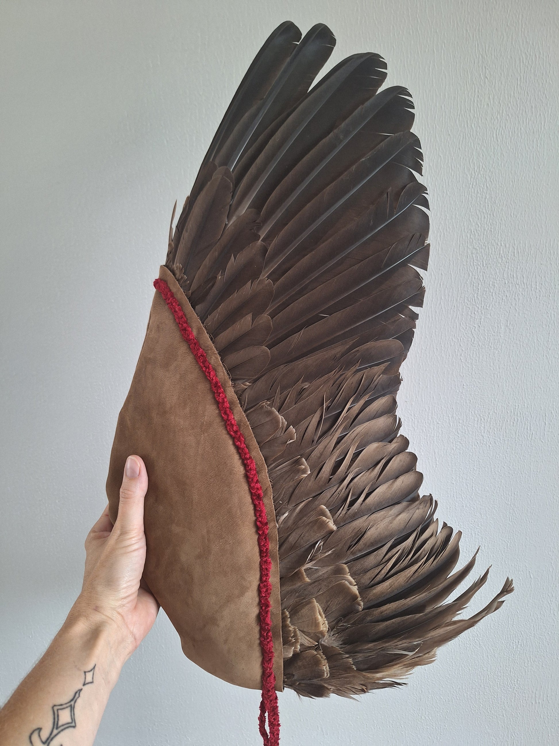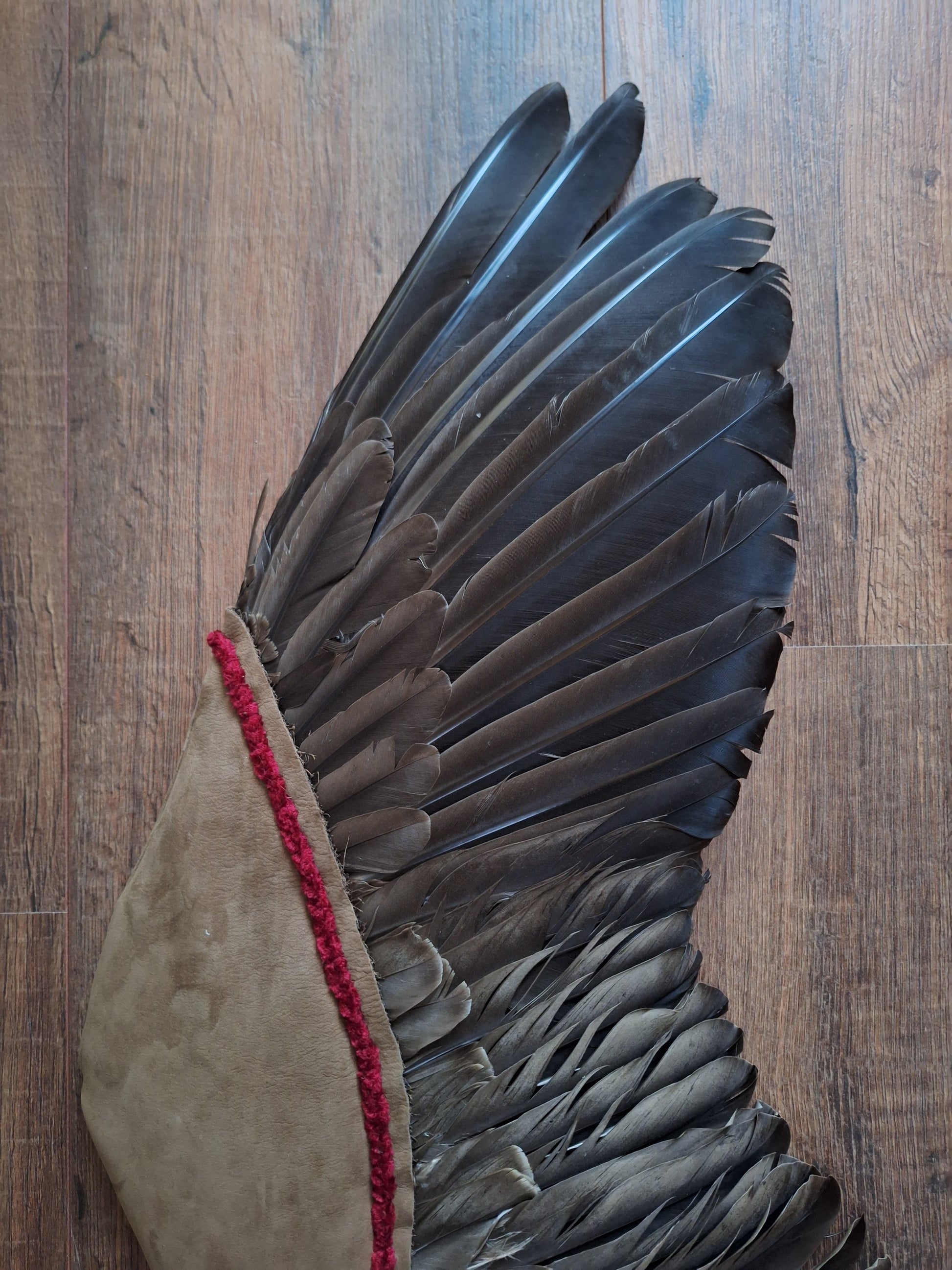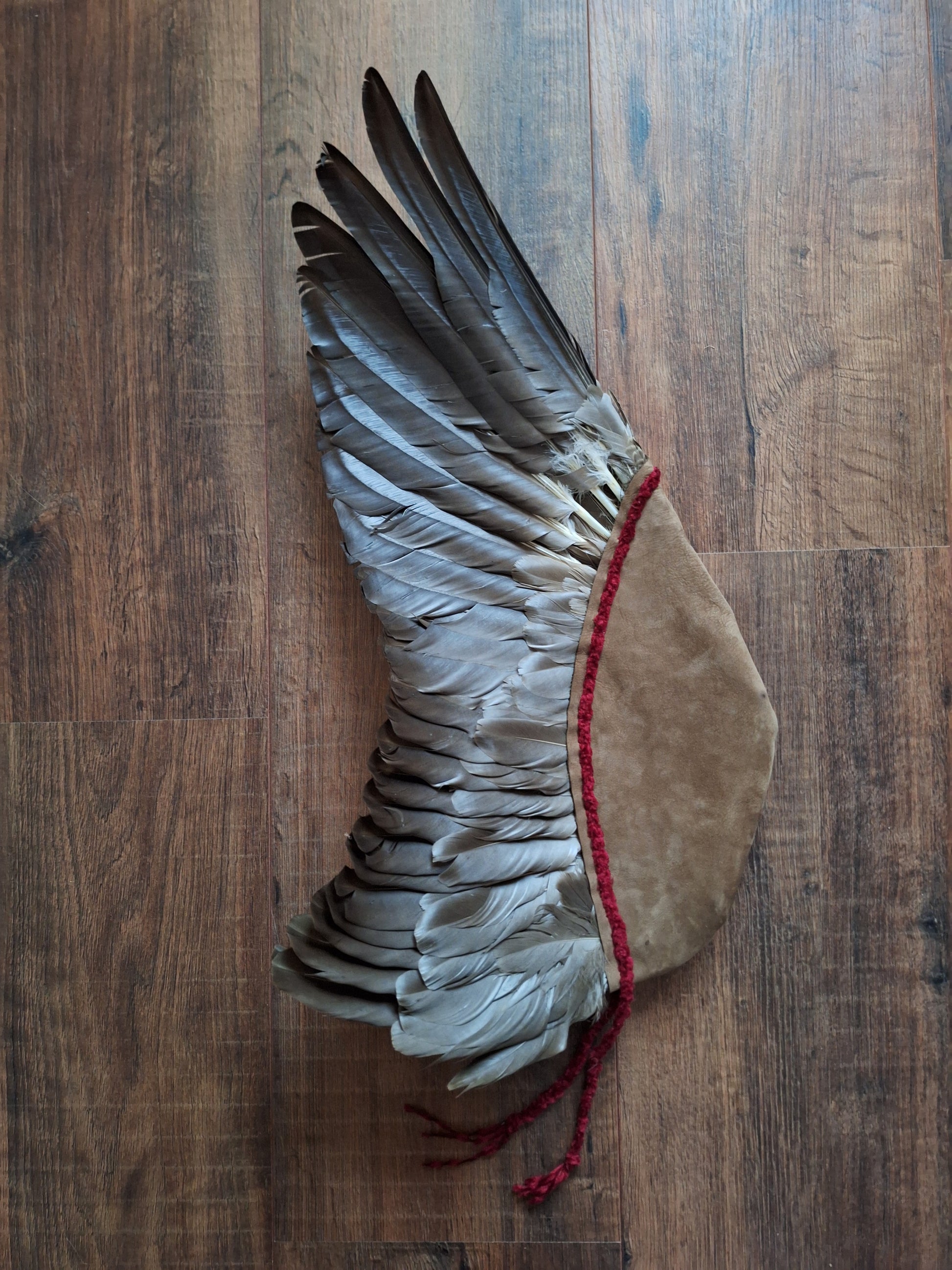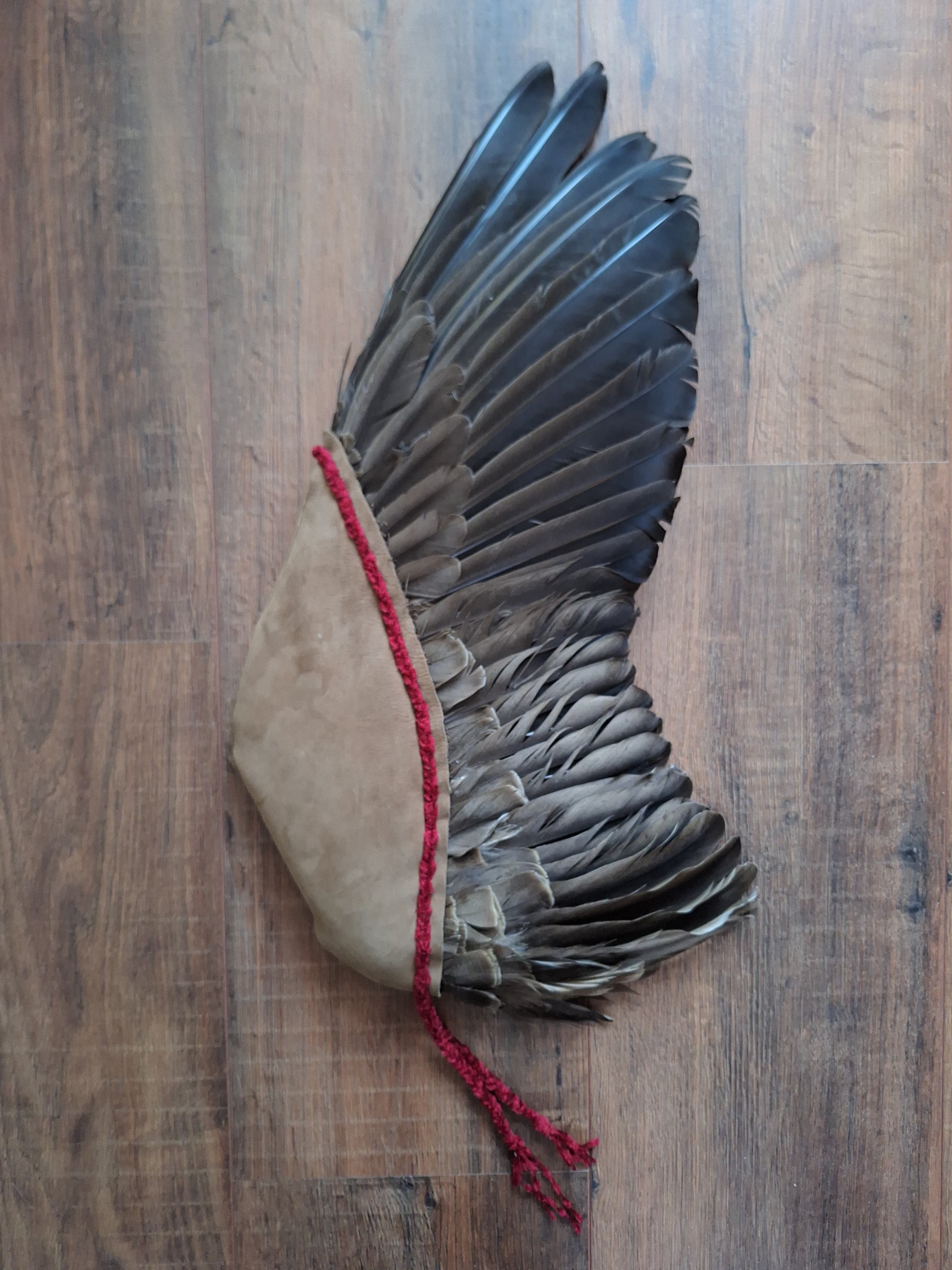 The wing has been handsewn into a sleeve of light brown suede leather and decorated with a braid made with 3 strands of acrylic wool in a somewhat velvety shining red color. During the braiding process, only the best of intentions have been put in.